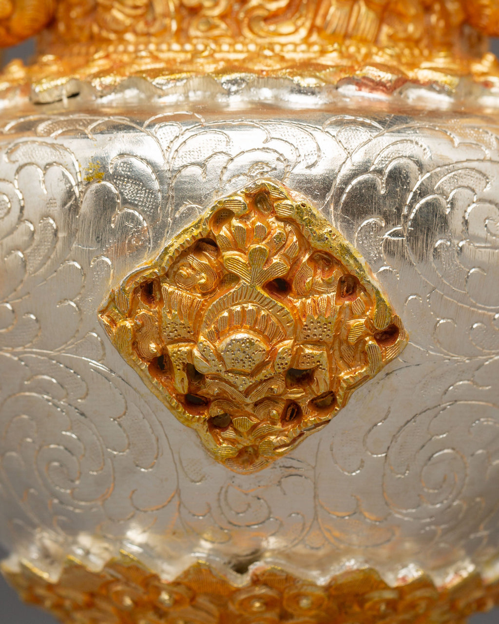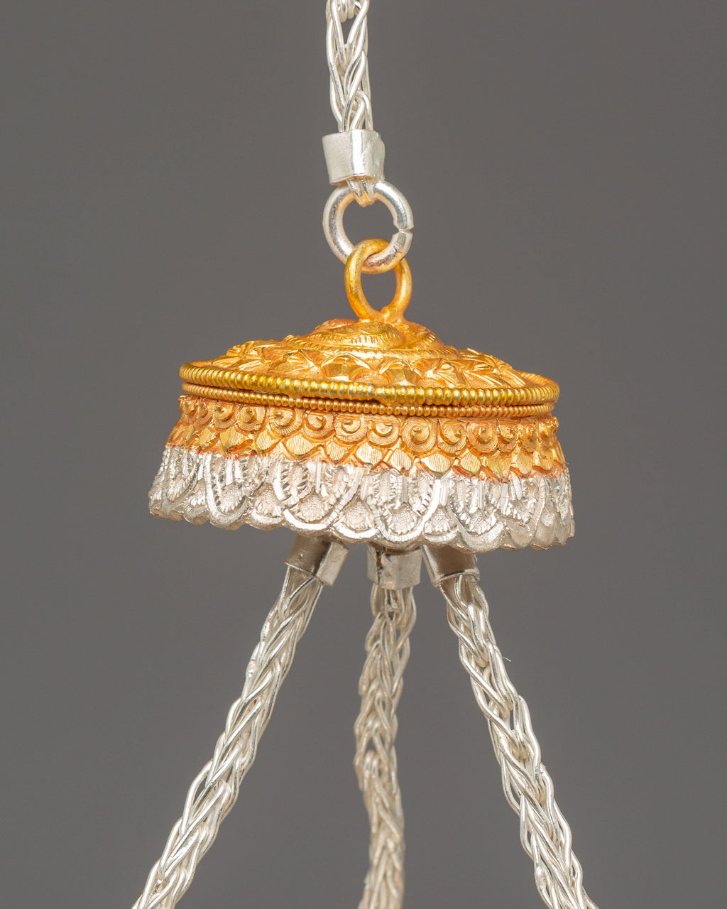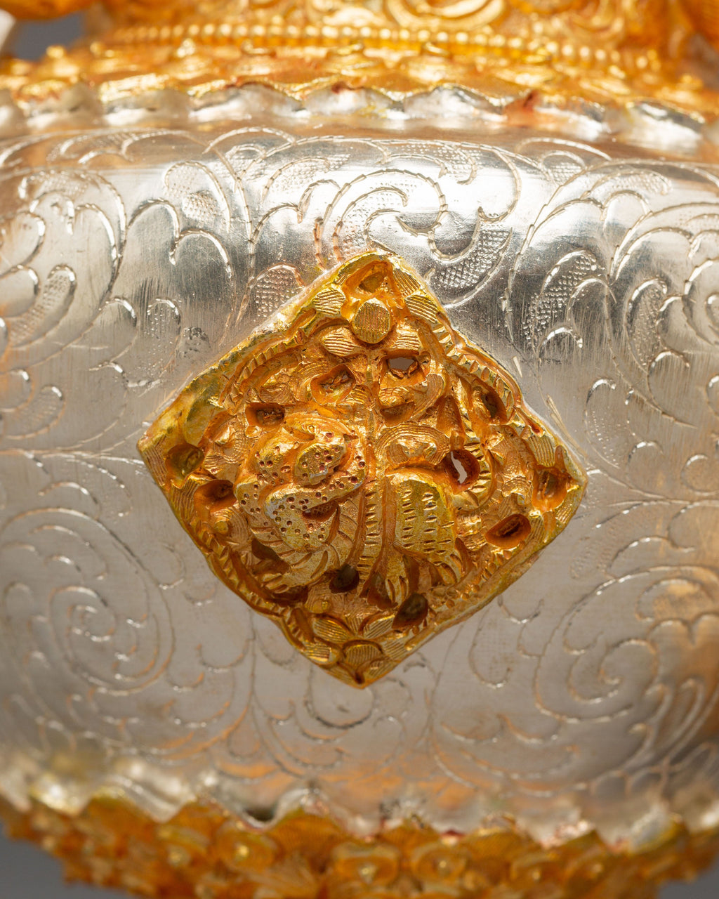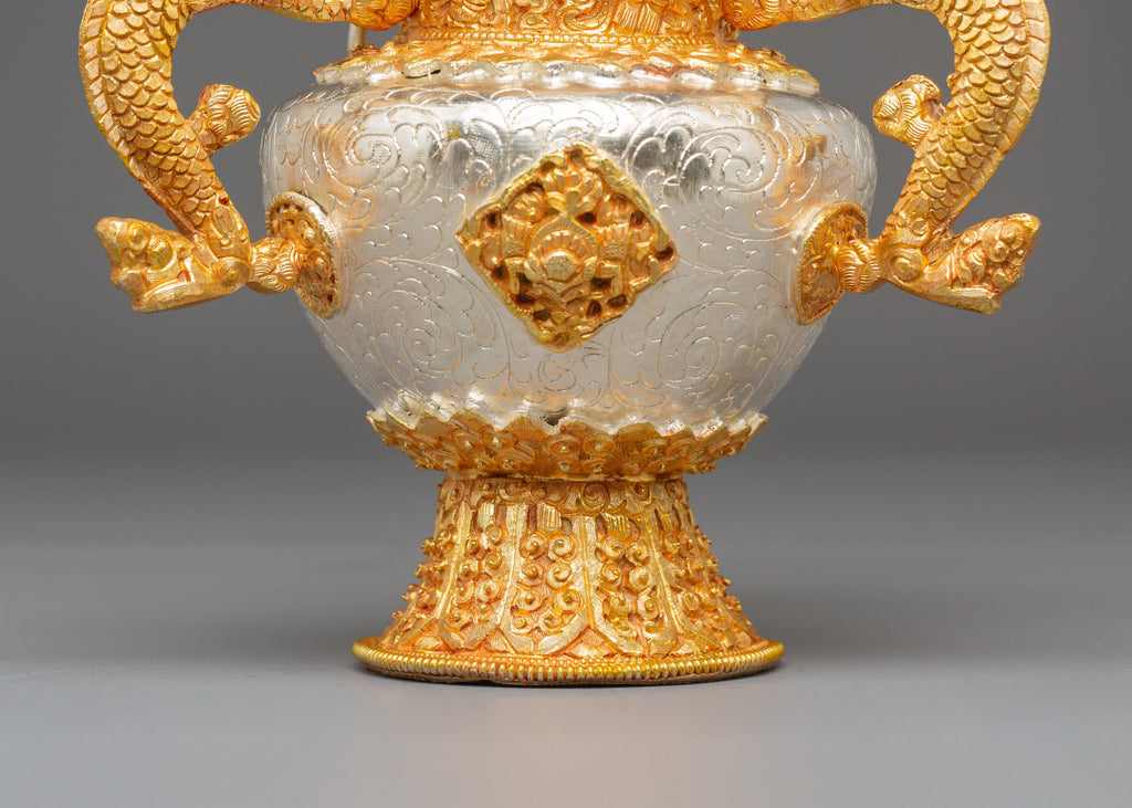 The design features finely sculpted dragon-shaped handles that represent protection, wisdom, and the powerful guardianship seen throughout Tibetan iconography. The body showcases intricate repoussé and filigree work, with alternating silver and gold tones emphasizing the handcrafted detailing. The perforated top lid allows incense smoke to rise gracefully, creating a serene and purifying ambiance. The ornate braided elements that connect the lid and body enhance the ceremonial elegance of the set, making each burner both a functional tool and an exquisite decorative piece.