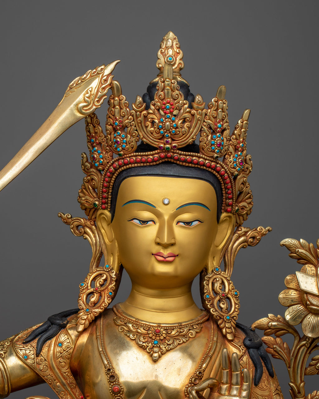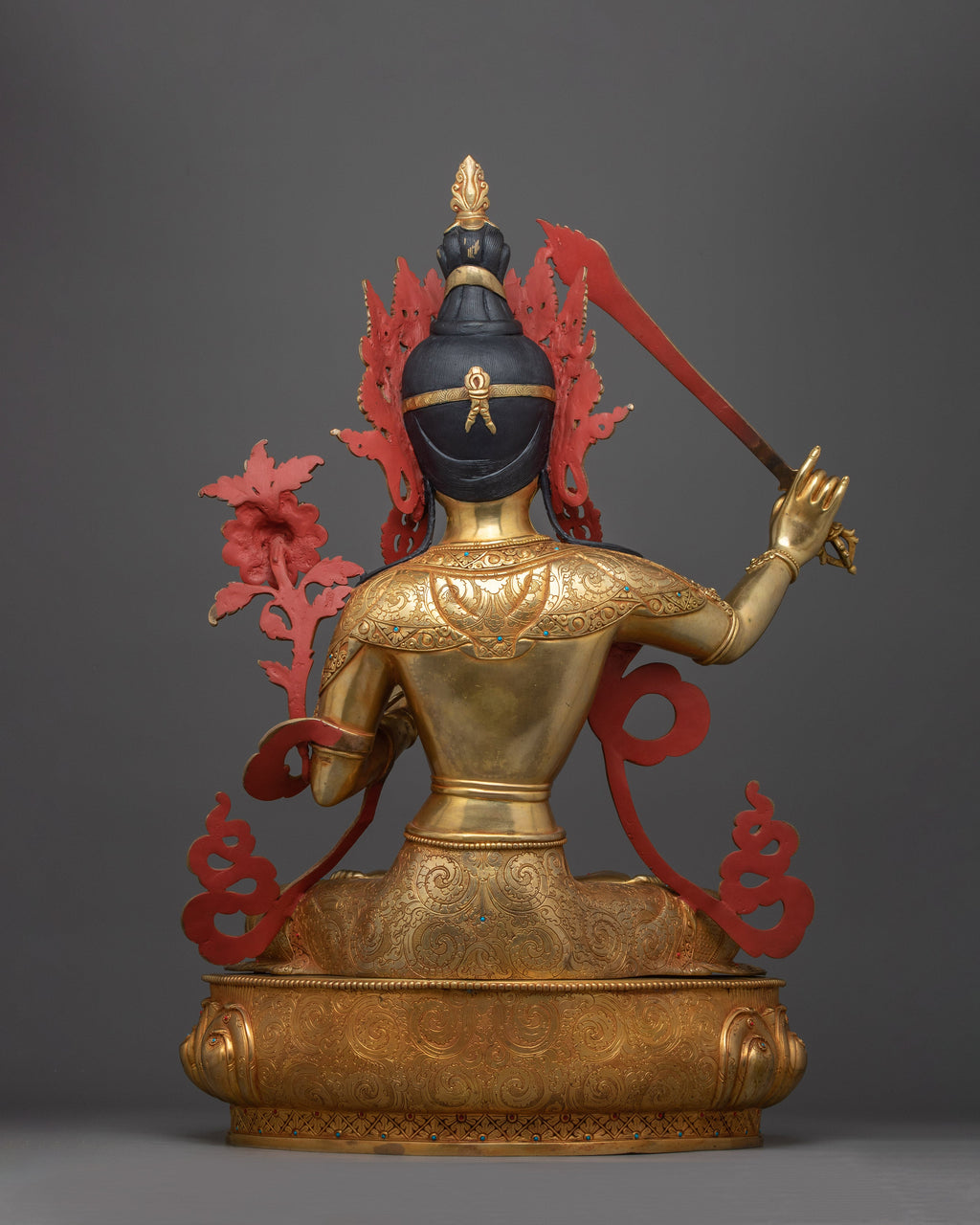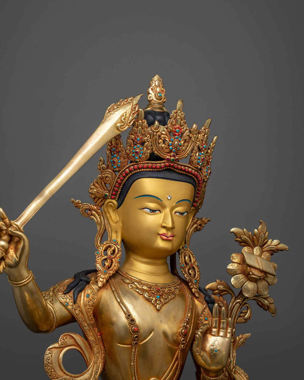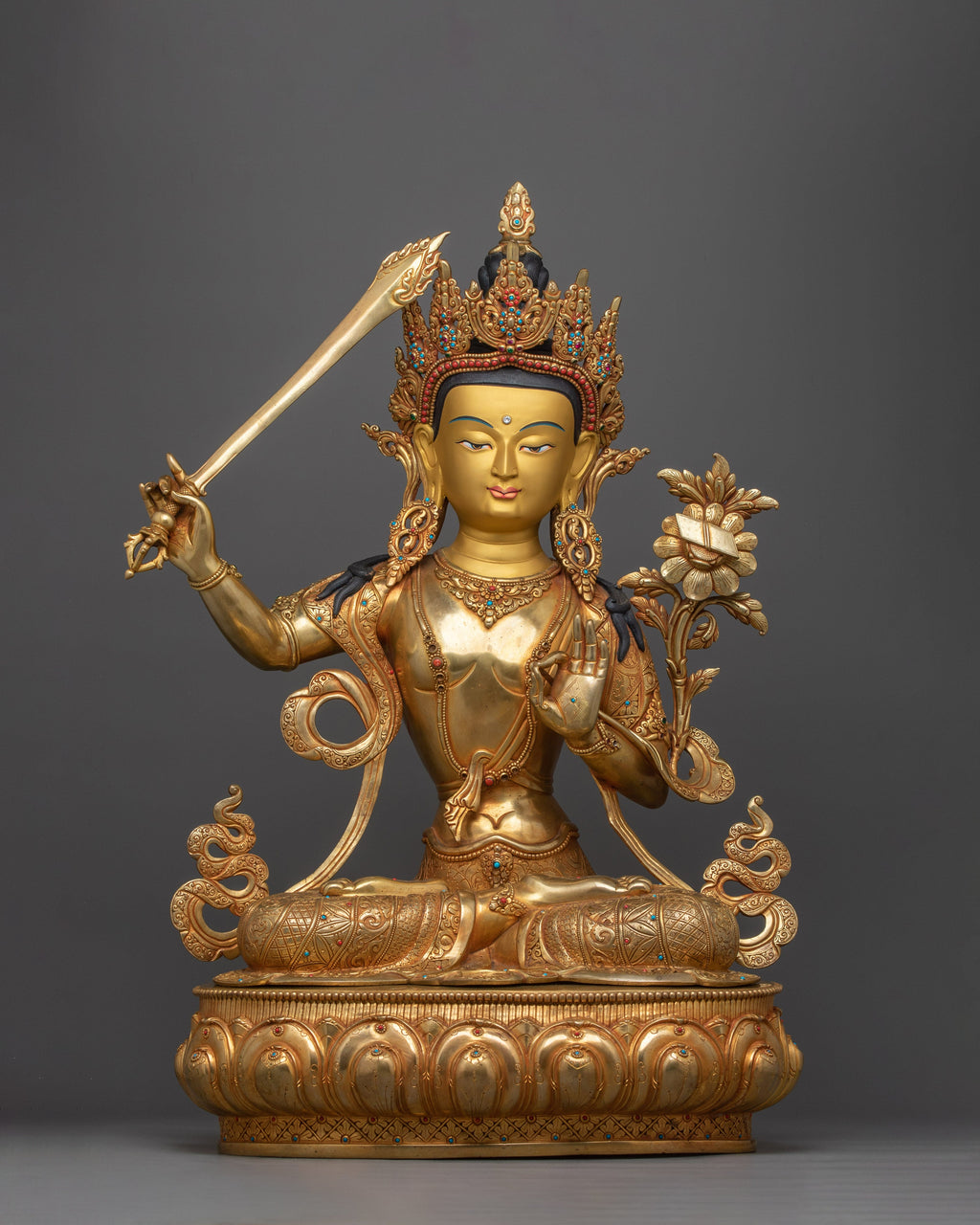 The Insight-Wisdom Deity Manjushri-66cm statue is a majestic emblem of wisdom and clarity, carefully sculpted to inspire and enhance any spiritual or intellectual setting. With a height of 66cm and a base of 44.5cm, this statue is more than just a beautiful piece; it is a profound representation of Manjushri's qualities of insight and wisdom. It is made of copper and richly embellished with 24K gold and colorful acrylic paints, capturing every aspect of the deity's tranquil look as well as the delicate intricacies of his outfit.
