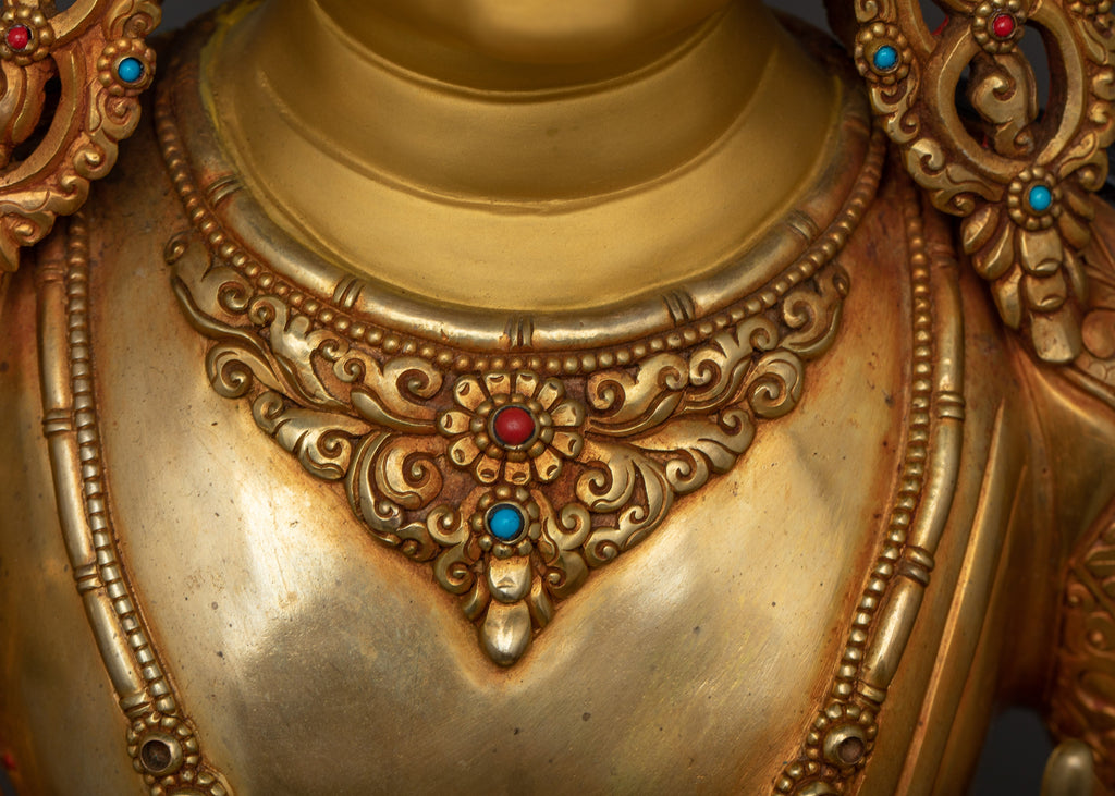 Manjushri's representation is precisely detailed and artistically specific, from the gradual slope of his robes to the complex designs that adorn his torso. This statue is more than just a work of Buddhist art; it is an invitation to engage with Manjushri's profound spiritual teachings, inspiring deep thought and intellectual progress in everyone who view it.