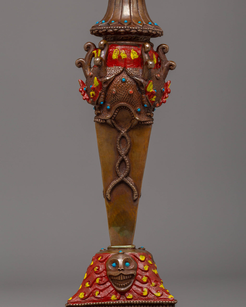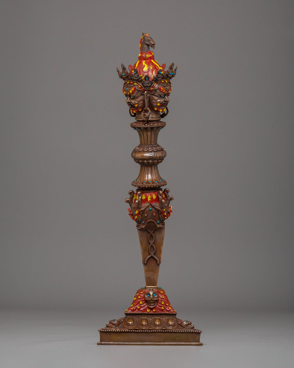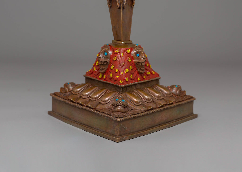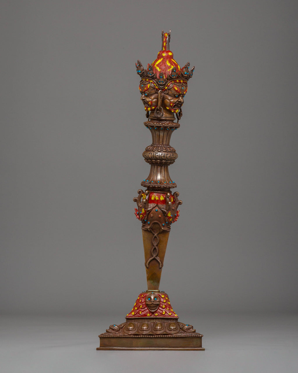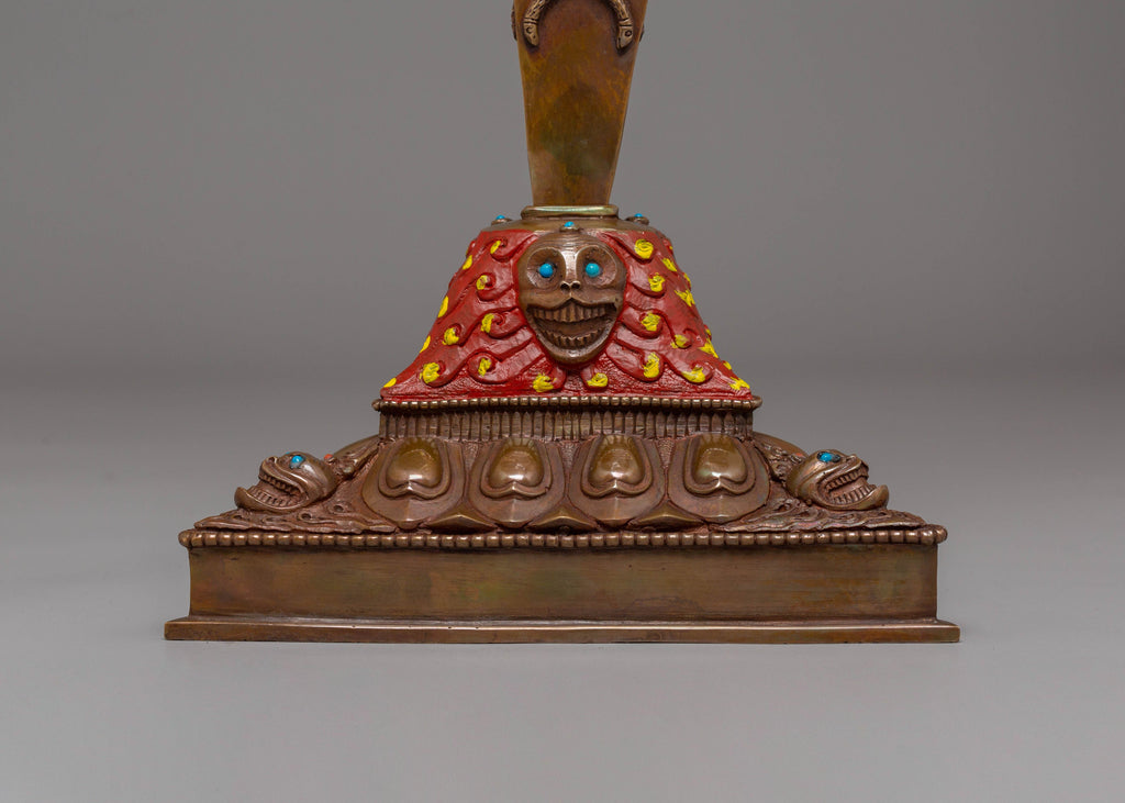 The design of the Iron Phurba features detailed carvings and motifs that reflect Tibetan spiritual symbolism. At the top, a demonic face symbolizes the power to overcome opposing forces, while the gemstones embedded in the phurba represent the blending of wisdom, strength, and protection. The acrylic colors used to highlight the carving add vibrancy, bringing attention to the intricate details and making the phurba visually captivating. The iron body ensures durability, while the overall design represents the deity's role in defeating evil and maintaining spiritual balance.