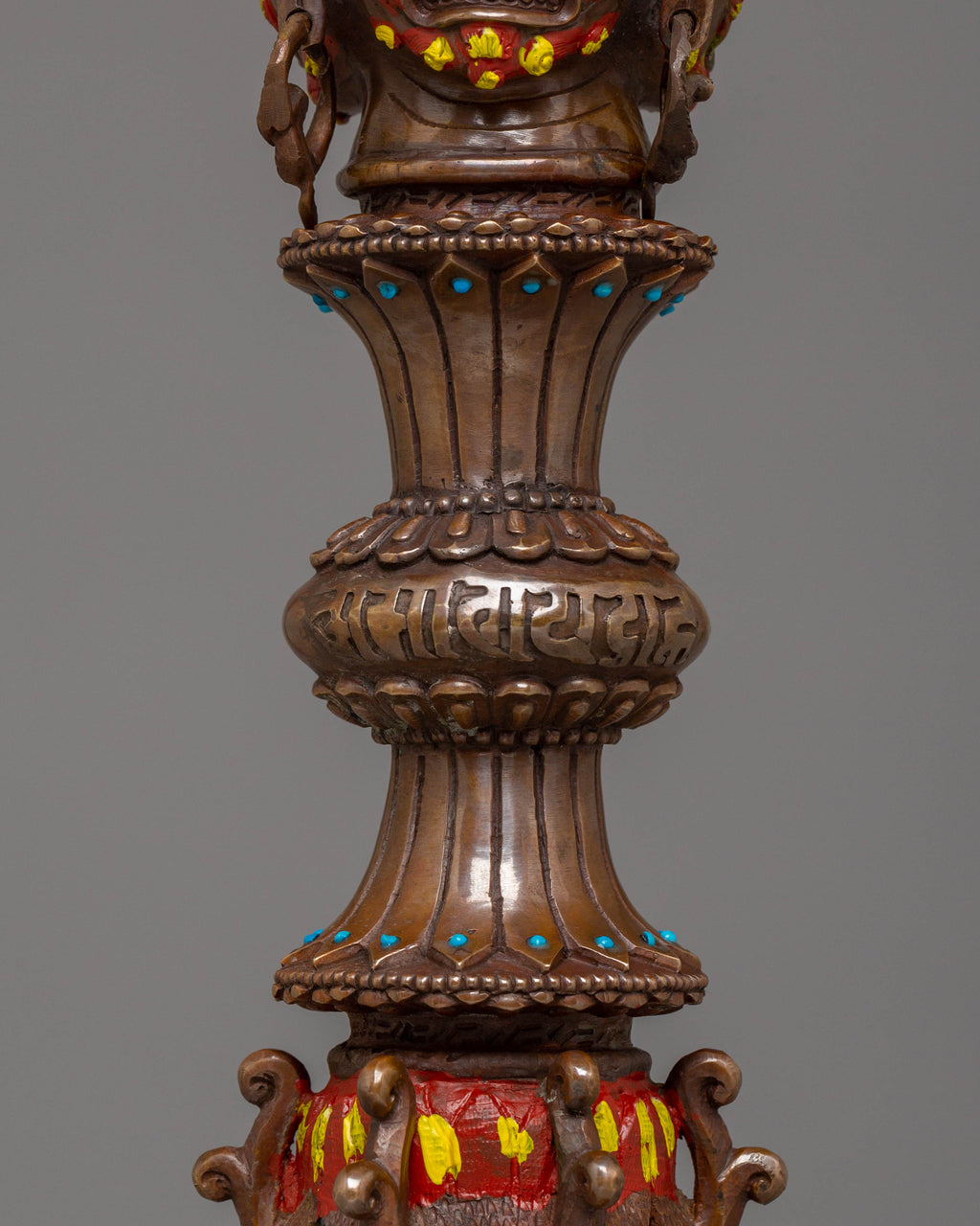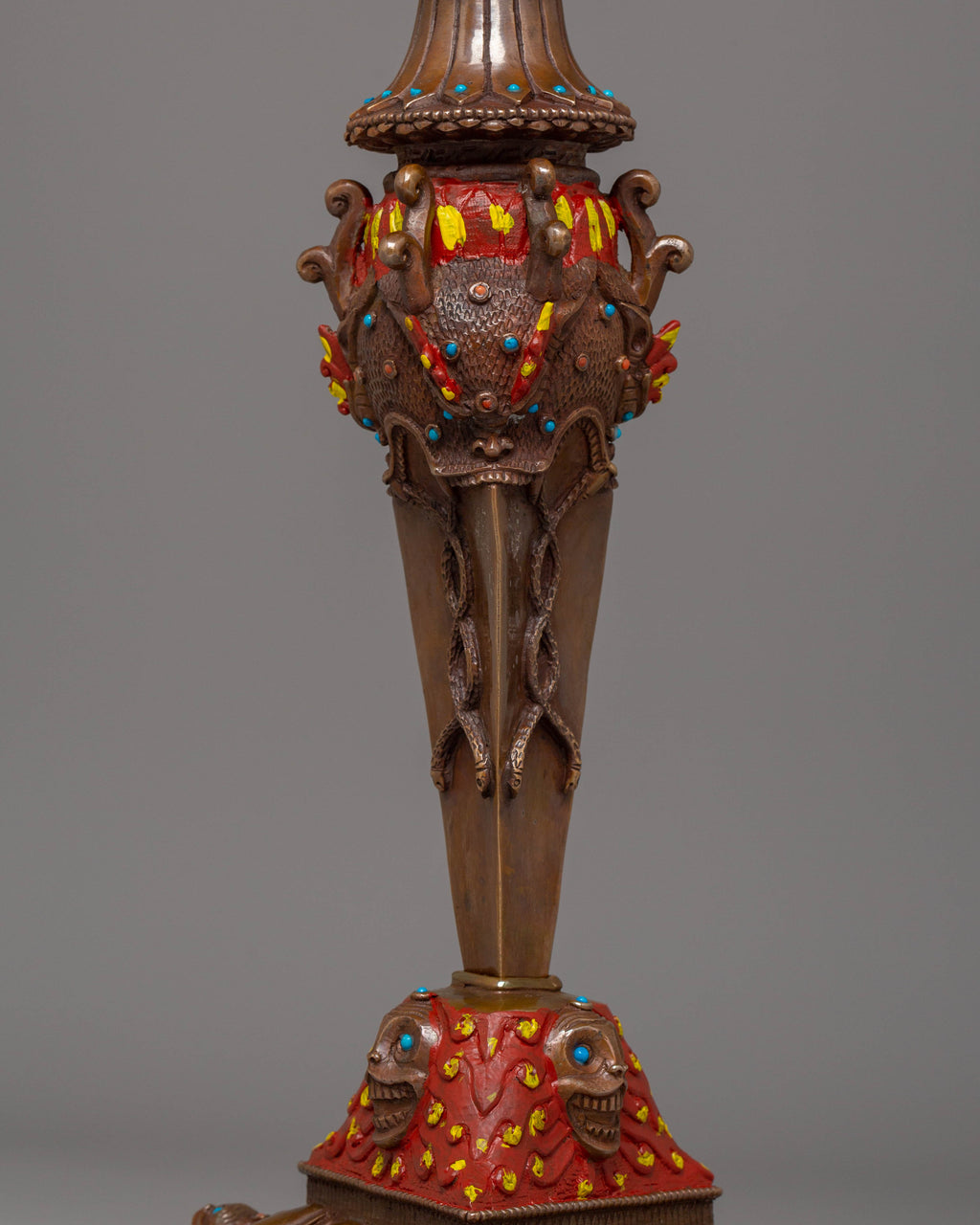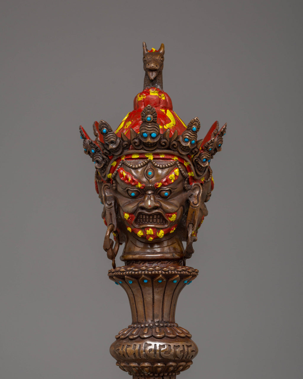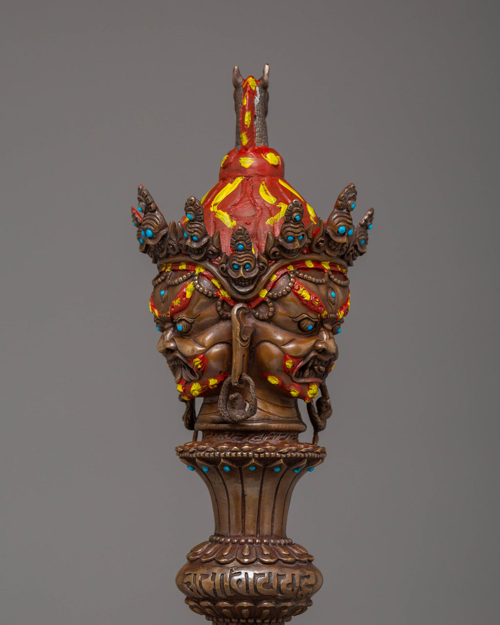 The design of the Iron Phurba features detailed carvings and motifs that reflect Tibetan spiritual symbolism. At the top, a demonic face symbolizes the power to overcome opposing forces, while the gemstones embedded in the phurba represent the blending of wisdom, strength, and protection. The acrylic colors used to highlight the carving add vibrancy, bringing attention to the intricate details and making the phurba visually captivating. The iron body ensures durability, while the overall design represents the deity's role in defeating evil and maintaining spiritual balance.