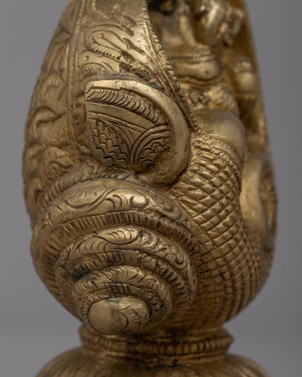 The Jai Ganesh Statue is a lovely depiction of Lord Ganesh. This handcrafted statue on a brass body captures the essence of Ganesh in a unique and artistic way. Lord Ganesh is shown here relaxing on a conch, which is a symbol of auspiciousness and divine energy. Lord Ganesh, also known as the Remover of Obstacles, is a Hindu deity associated with wisdom, intellect, and good fortune. The use of brass and the intricate craftsmanship add to the charm and elegance of this Jai Ganesh Statue, making it a meaningful and eye-catching piece of art.
