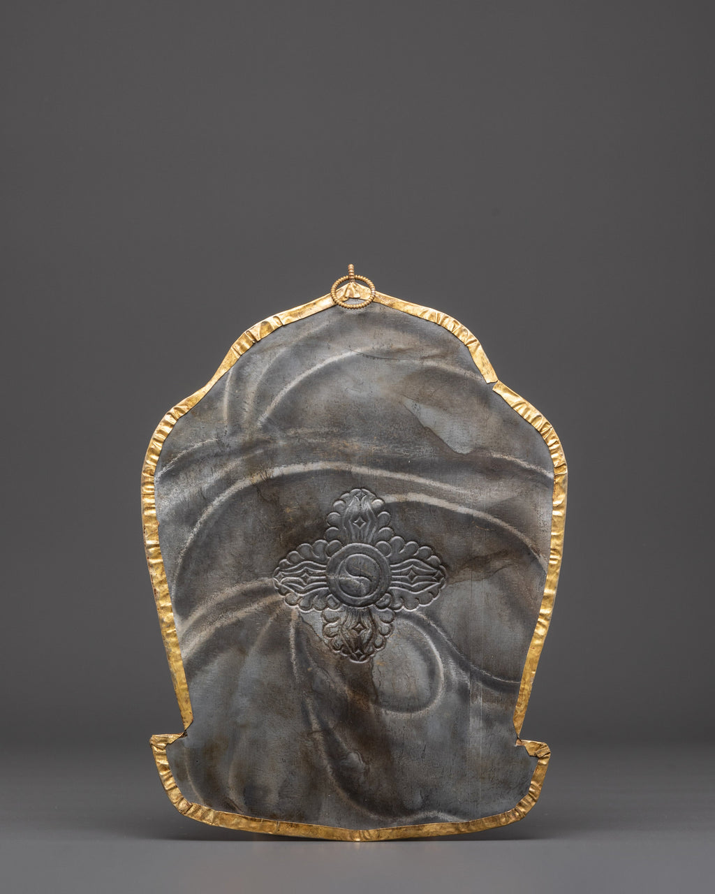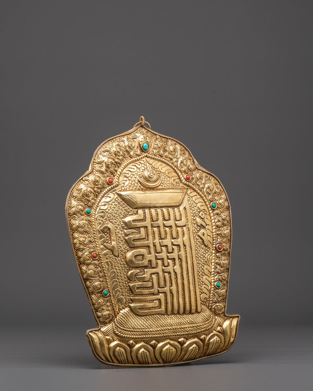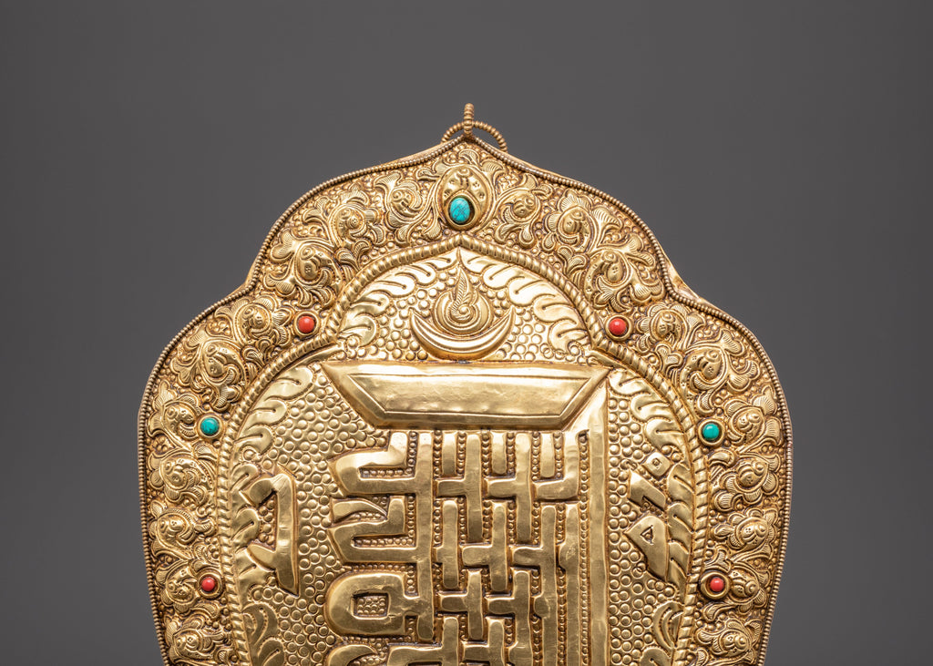 This Kala Chakra wall hanging is perfect for Tibetan altar decor, meditation rooms, or as a focal point in any spiritual setting. Whether utilized in ritual rituals or merely as a reminder of the universe's endless cycle of time and balance, it provides a sense of tranquility, protection, and spiritual transformation to everyone around it. The mix of brass, coral, and turquoise creates a timeless and significant addition to any collection of Tibetan spiritual objects or Buddhist home decor.