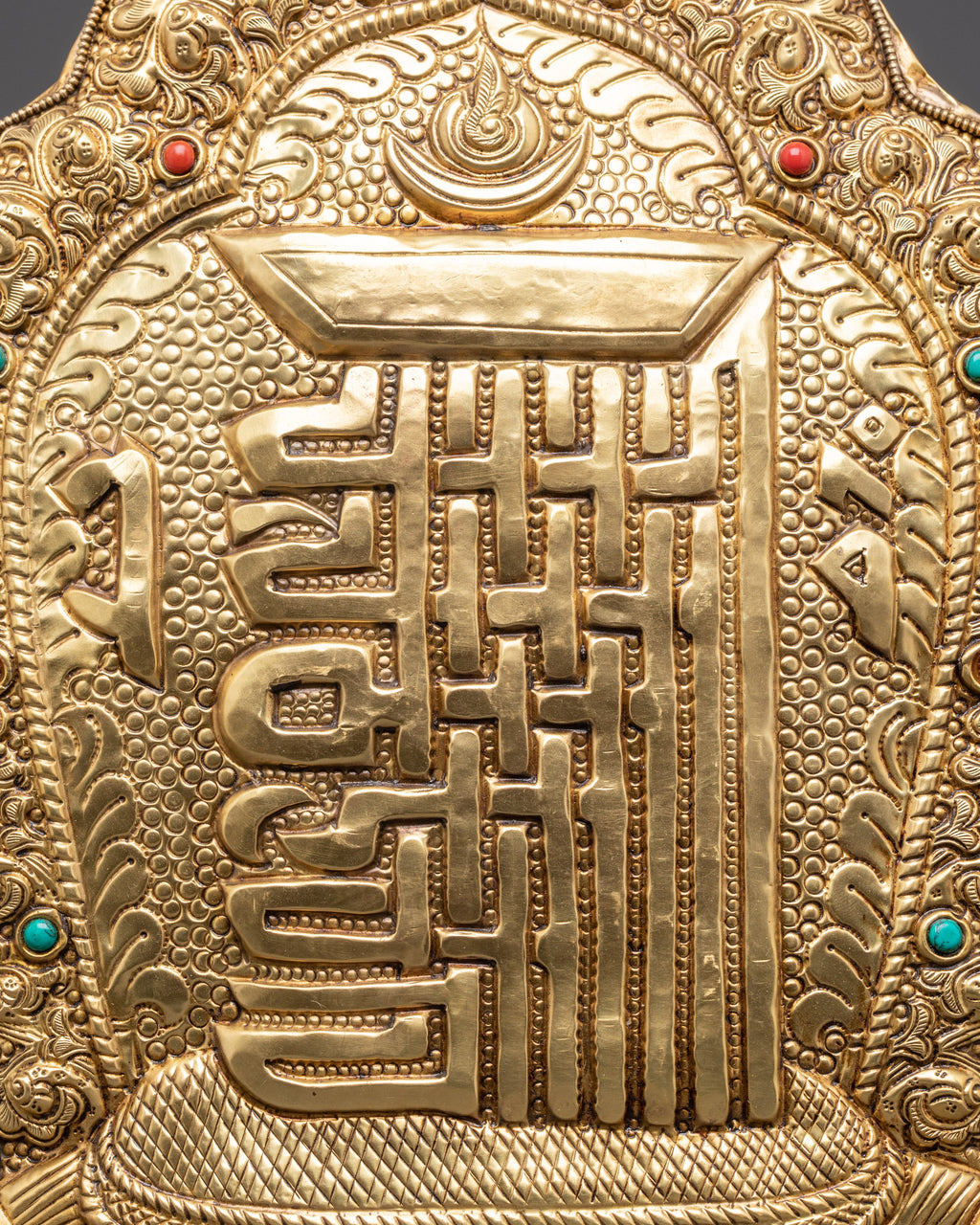 The Kala Chakra wall hanging is intricately designed, with the wheel in the center signifying the cycle of time and the journey to enlightenment. The wheel is surrounded by coral and turquoise stone designs, which are prized for their spiritual characteristics in Tibetan Buddhism. Coral symbolizes life and power, whereas turquoise encourages healing, emotional balance, and spiritual insight. These stones are strategically placed to strengthen the Kala Chakra's protective energy, shielding it from negative influences and promoting spiritual growth. The brass body lends weight and significance to the design, evoking an ancient, hallowed atmosphere.