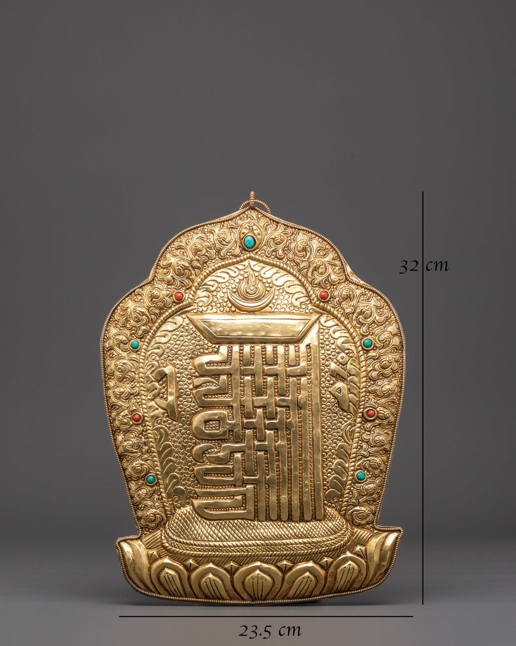 The Kala Chakra Wall Hanging is a spiritually powerful and profound piece of Tibetan wall art that represents protection, transformation, and spiritual balance. This magnificent wall hanging measures 32cm in height, 23.5cm in width, and weighs 0.47kg. It is made of brass and features coral and turquoise stones. The Kala Chakra, also known as the Wheel of Time, symbolizes the endless cycle of life, death, and rebirth, as well as the harmonious flow of time and space. This wall hanging is a reminder of the interdependence of all life and the path to spiritual enlightenment.