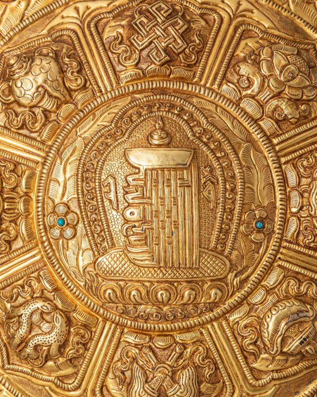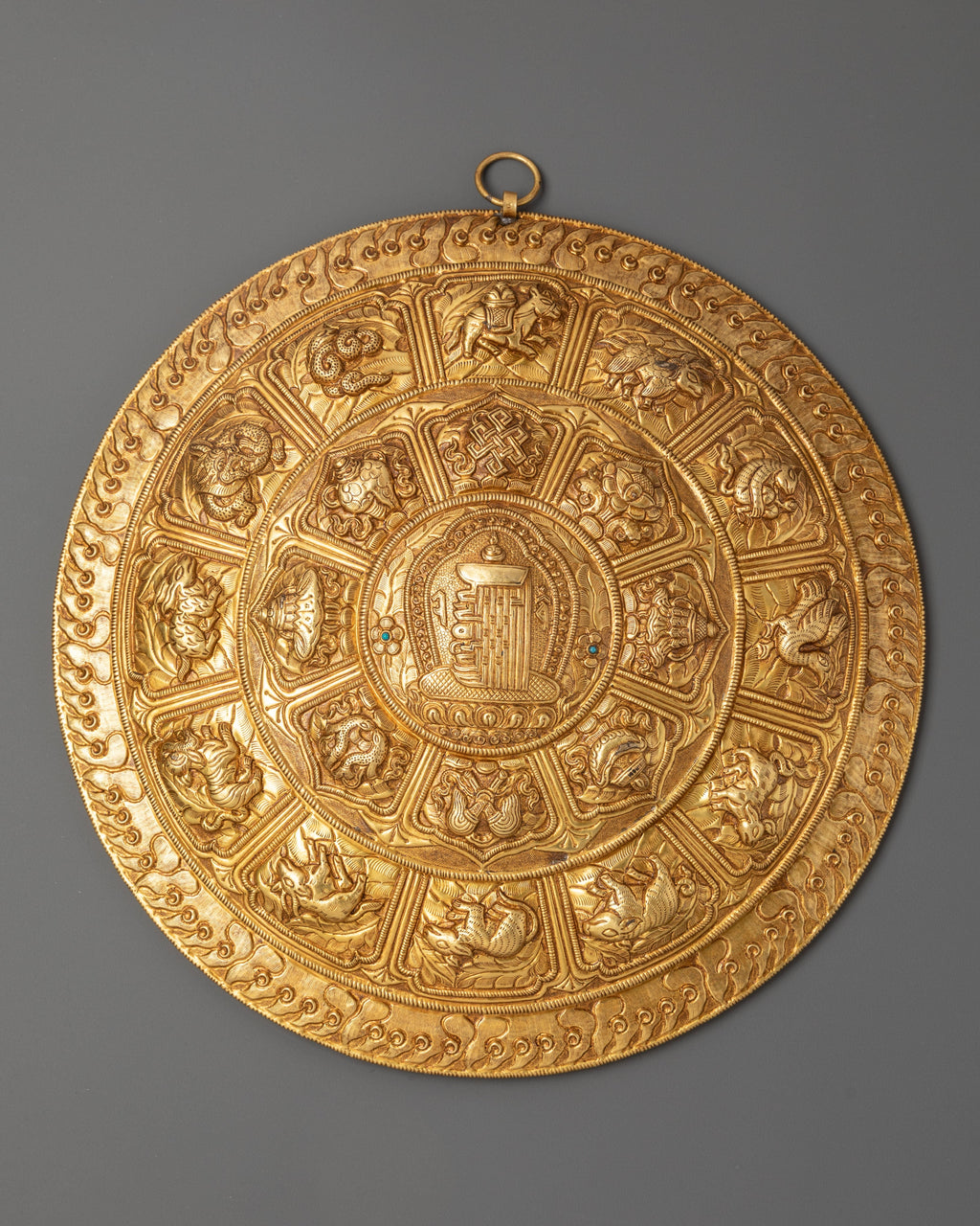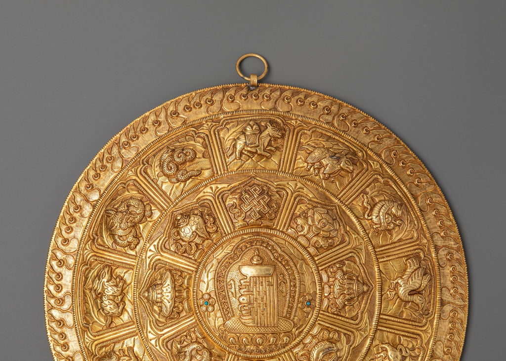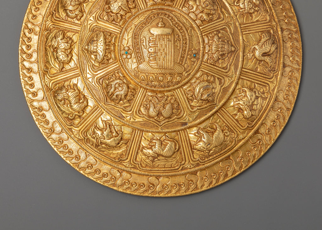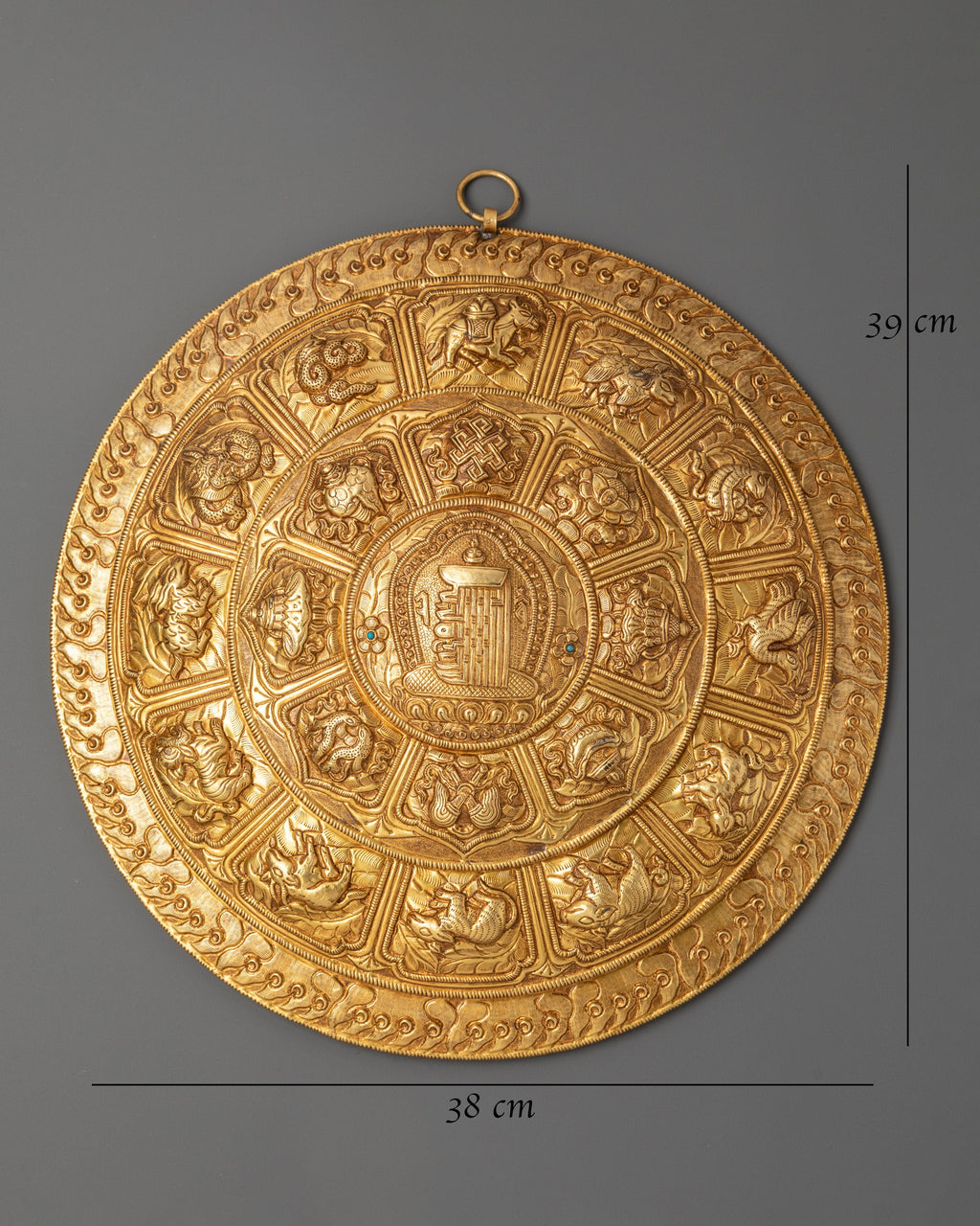 The Kala Chakra wall hanging's design features elaborate patterns depicting the wheel of time, along with various concentric circles and symbols of spiritual unity and eternity. The mystical emblems heighten the piece's spiritual value. The circular design represents the never-ending flow of time and the interconnectedness of all existence, serving as a reminder of life's cyclical nature and the significance of spiritual awakening. This wall hanging offers aesthetic value while also serving as spiritual guidance on the path to enlightenment. This Kala Chakra wall hanging is great for people seeking spiritual decor that promotes protection, balance, and a deeper understanding of Buddhist philosophy. This spiritual artwork, whether put on your Tibetan altar, in your meditation room, or as a statement piece in your home decor, will bring meaning to your living area. Its brass body and delicate Kala Chakra designs complement any collection of Tibetan spiritual art.