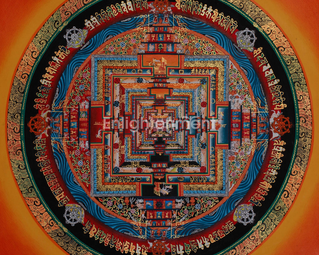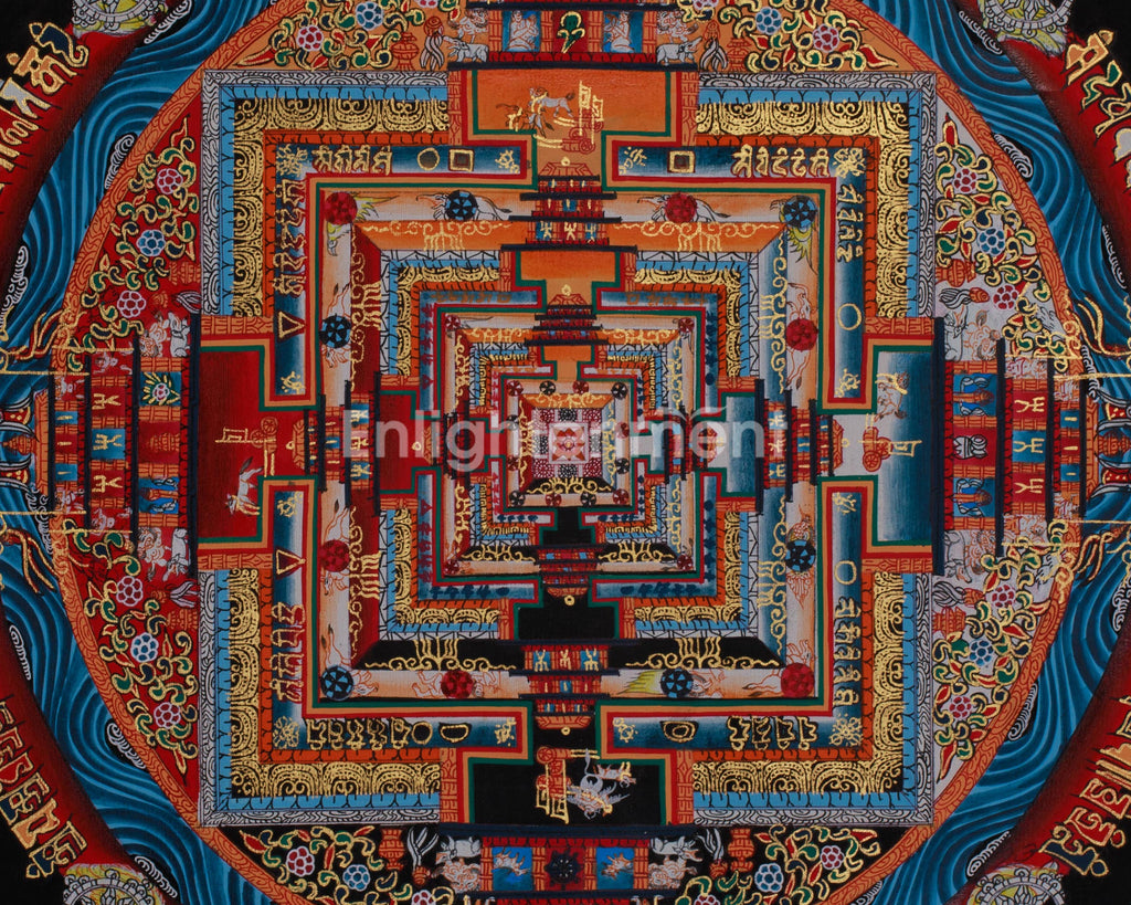 The Kalachakra Mandala acts as a meditation aid and symbolizes our bond with the universe, urging us to synchronize our inner lives with the cosmos's rhythm. The incorporation of 24K gold accents enhances the spiritual nature of this piece, drawing focus to its divine qualities and illuminating the deep teachings it encompasses.