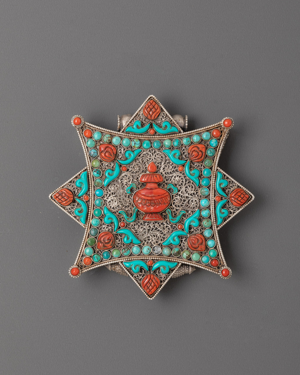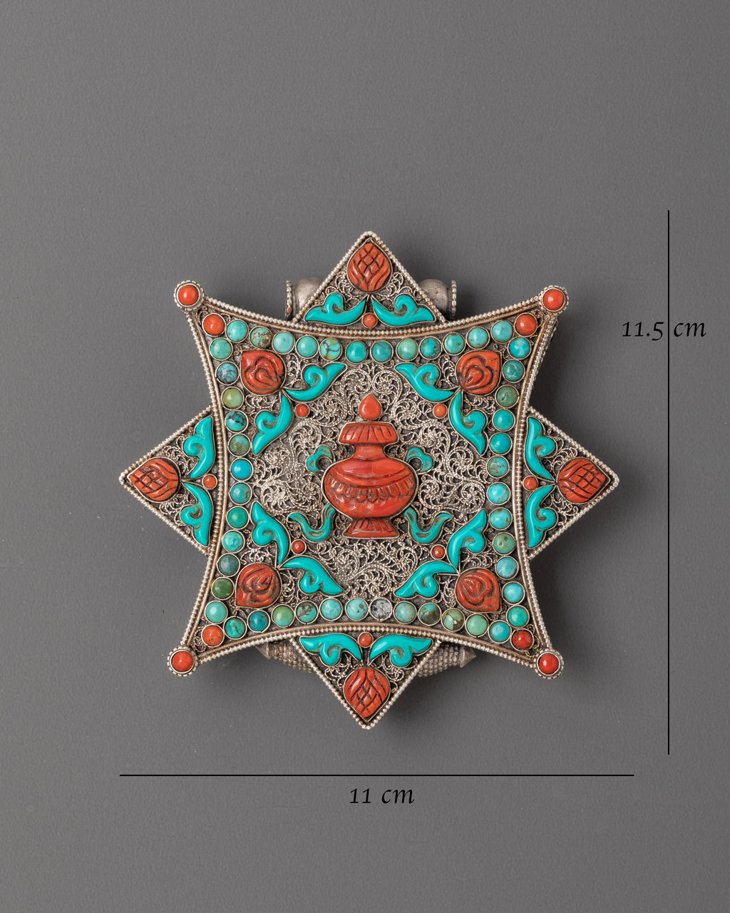 The coral and turquoise stones in the locket give bright color while also holding deep spiritual meaning. Coral is thought to promote balance and calm, whereas turquoise is connected with protection and healing. Together, these stones complement the silver design, which represents cleanliness and reverence in spiritual pursuits. The Kalash Prayer Ghau Box Locket holds prayers, mantras, and sacred things, keeping them safe and close to your heart while you call blessings and protection.