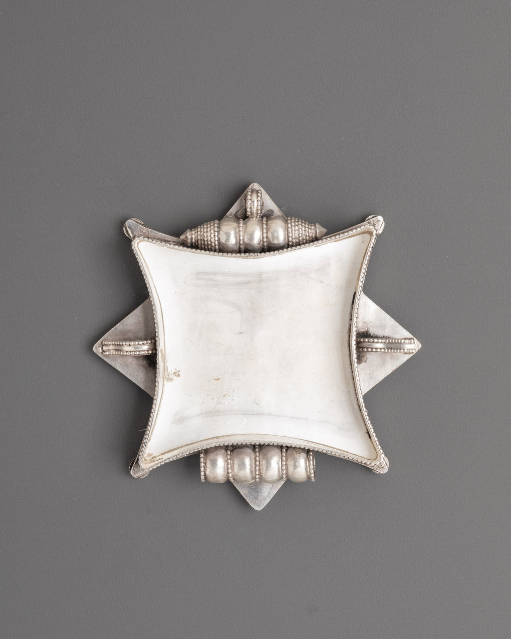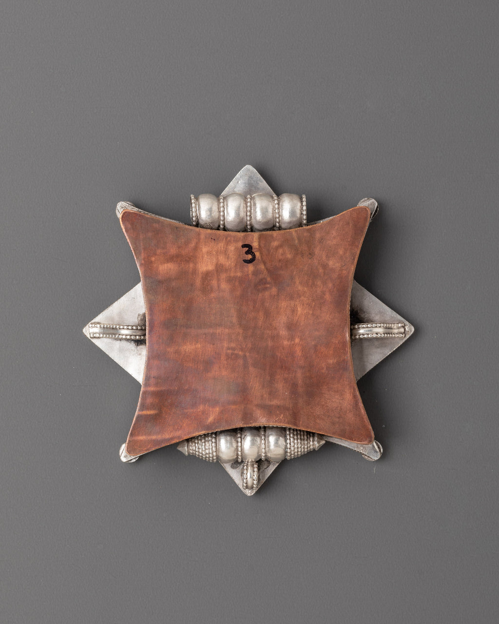 The Kalash Prayer Ghau Box Locket is a stunning spiritual relic that will increase your meditation and prayer routines. This finely designed locket, which measures 11.5cm in height and 11cm in breadth, is constructed of silver and semi-precious stones such as coral and turquoise. The elaborate artwork includes the traditional Kalash emblem, which represents prosperity, abundance, and divine benefits. Whether you want to strengthen your spiritual connection or provide a meaningful present, this locket is ideal for individuals who value holy traditions.