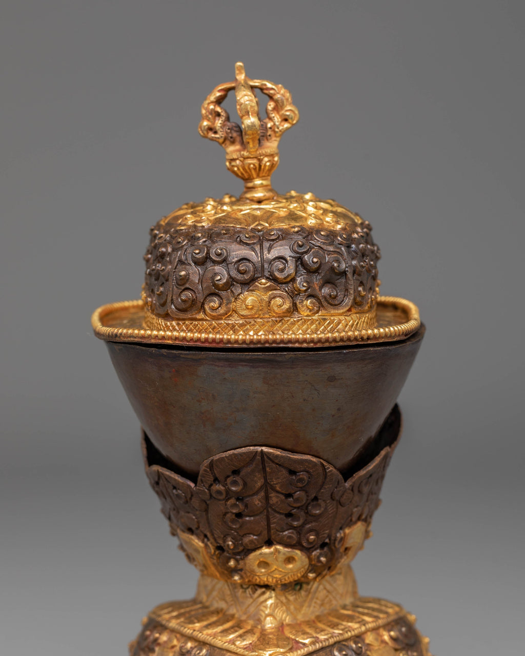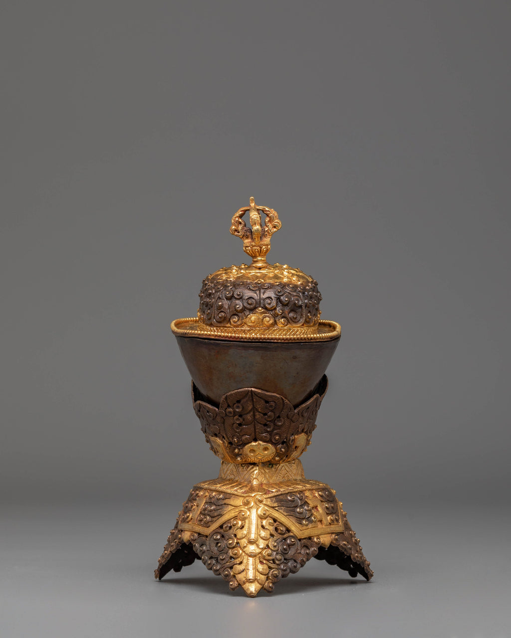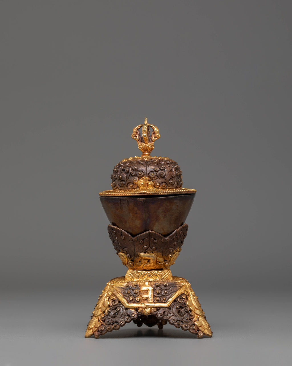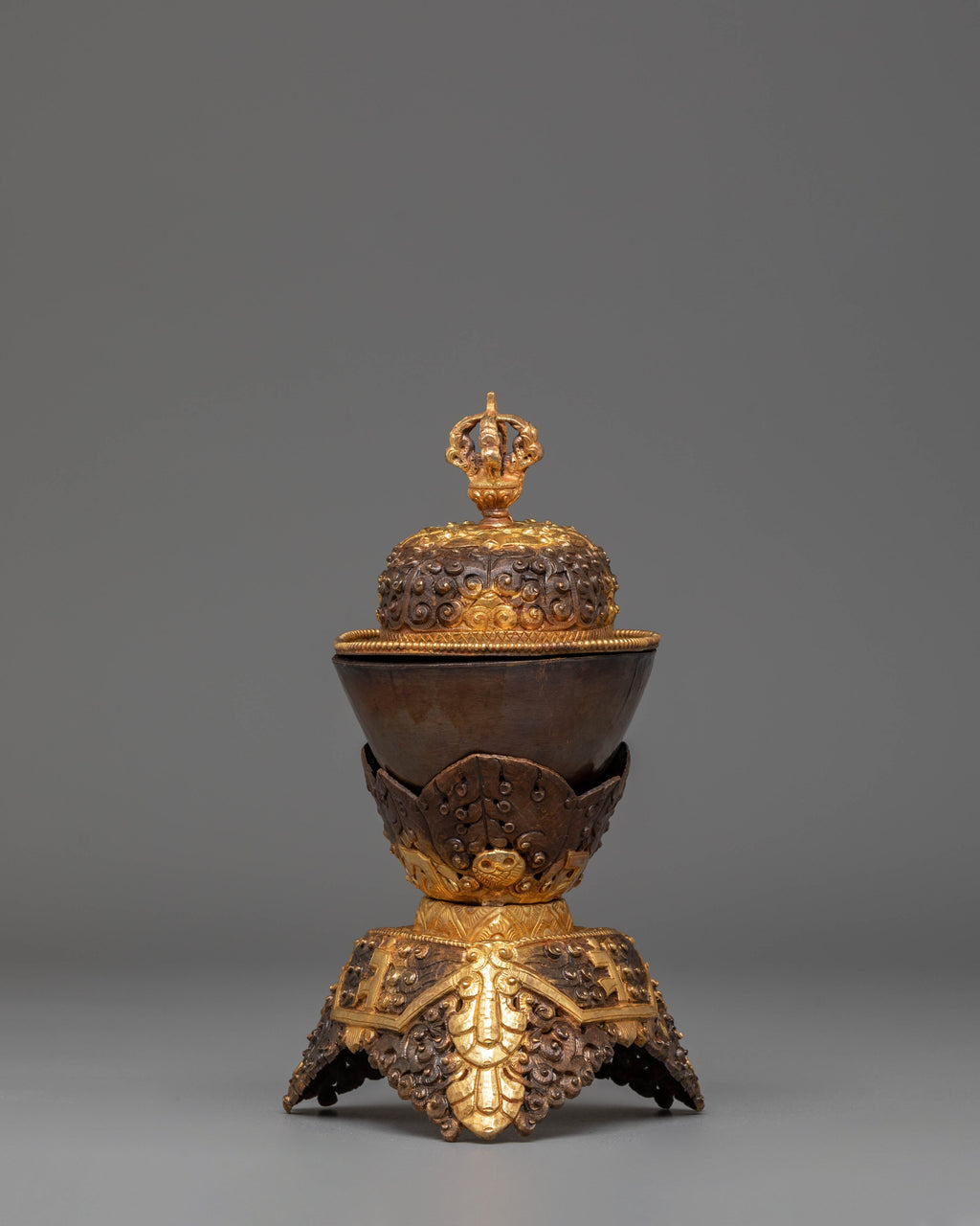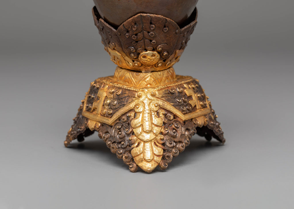The Kapala set holds the nectar used in higher esoteric rituals. It offers liberation to gods and deities, ensuring their devotion. The offerings are said to be transformed into the Wisdom Nectar, a liquid form of the deity's Enlightened Mind.