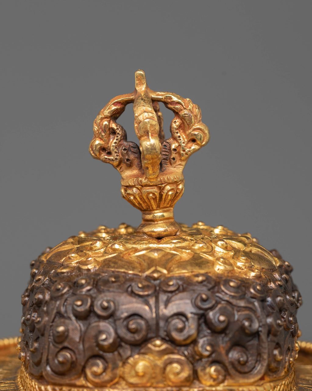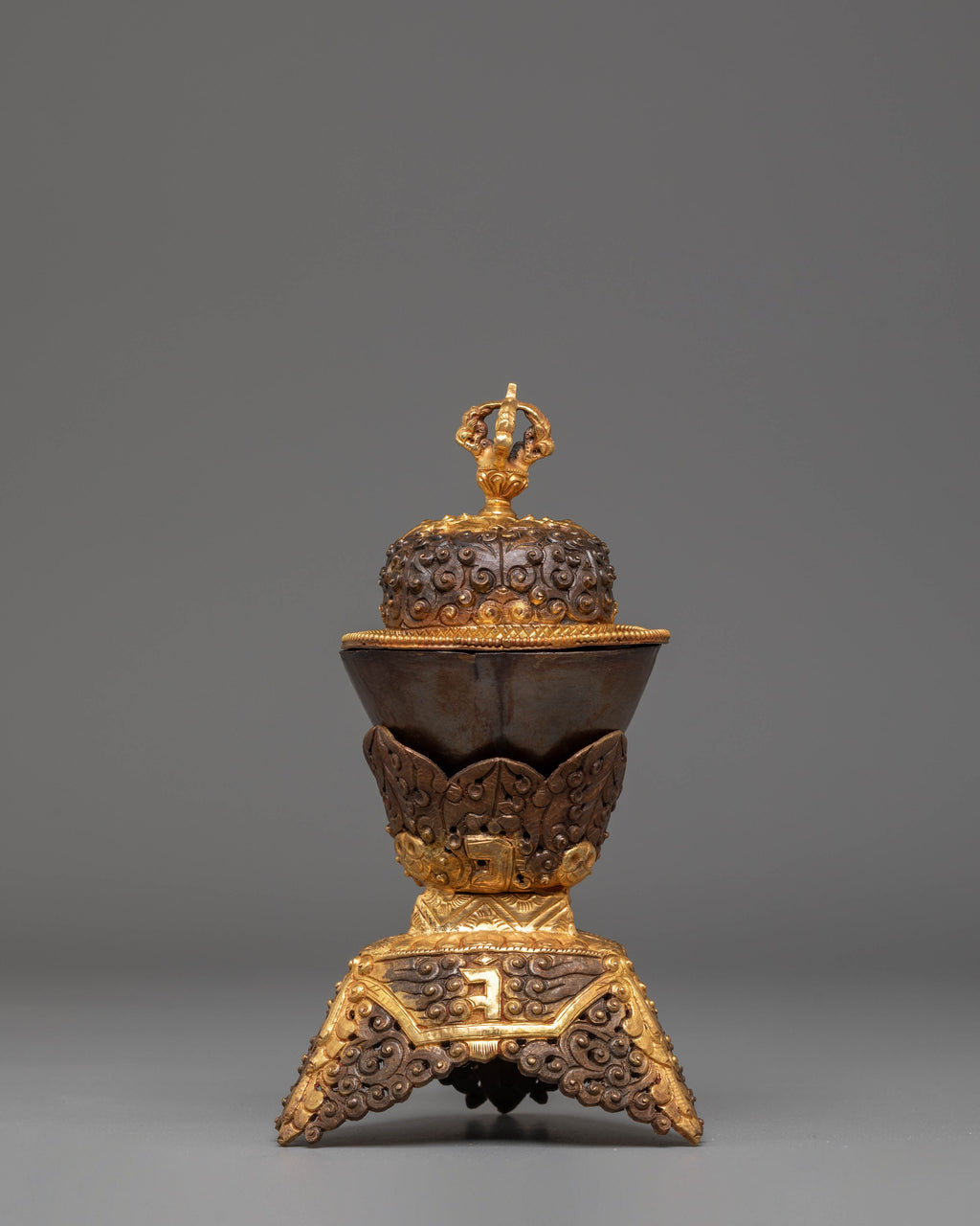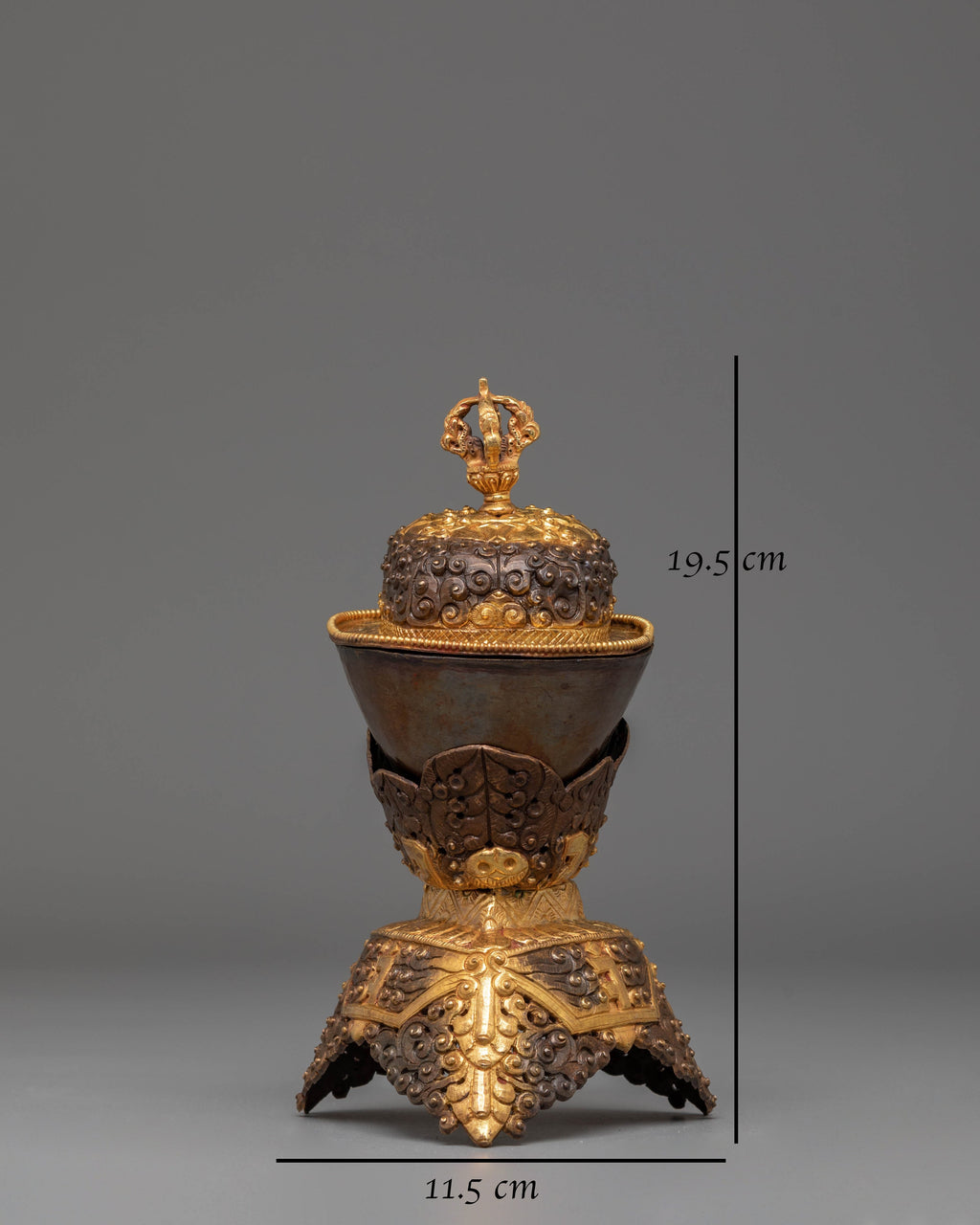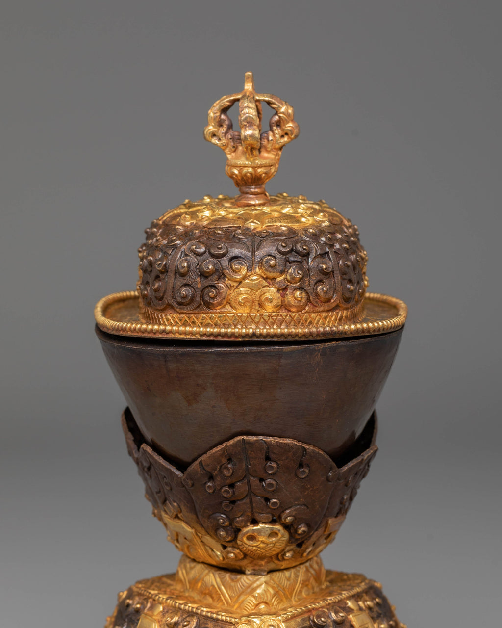 The Kapala set holds the nectar used in higher esoteric rituals. It offers liberation to gods and deities, ensuring their devotion. The offerings are said to be transformed into the Wisdom Nectar, a liquid form of the deity's Enlightened Mind.