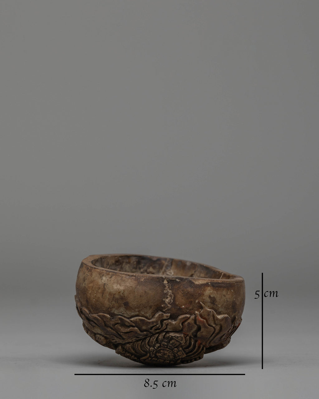 This Kapala Sacred Vessel is a beautifully crafted ritual object, deeply imbued with spiritual symbolism, and features intricate carvings of the Yamantaka deity. Standing at 5cm tall and 8.5cm wide, this sacred vessel is used in Buddhist rituals to hold offerings, symbolizing the act of giving to the divine. The vessel’s design incorporates a powerful depiction of Yamantaka, the fierce protector and deity of death in Tibetan Buddhism. Known as the "Conqueror of Death," Yamantaka is often shown with multiple faces and numerous arms, symbolizing his ability to overcome death and protect wisdom from its destructive forces. The carving on this Kapala embodies his wrathful energy, signifying strength, protection, and the transformation of fear into wisdom.