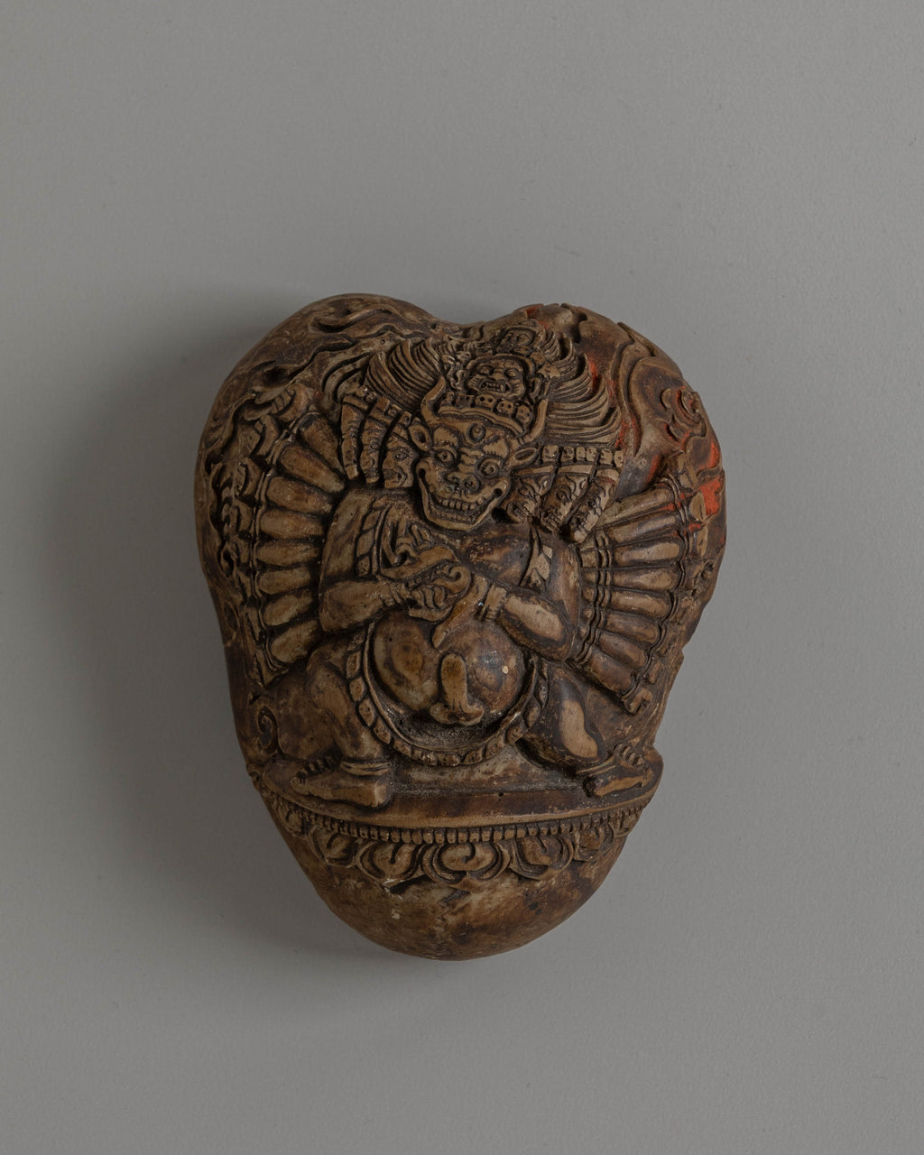 Crafted from risen material, the Kapala features intricate, dynamic details, including the deity’s multiple heads and fierce expression, reflecting Yamantaka’s role as a protector in Buddhist tradition. The vivid representation of this wrathful deity on the vessel emphasizes the destruction of opposing forces, particularly the fear of death and attachment, and the transformative power of spiritual practice. The Kapala is not only a functional tool for holding sacred offerings but also a profound spiritual object that represents the overcoming of life’s most formidable obstacles.