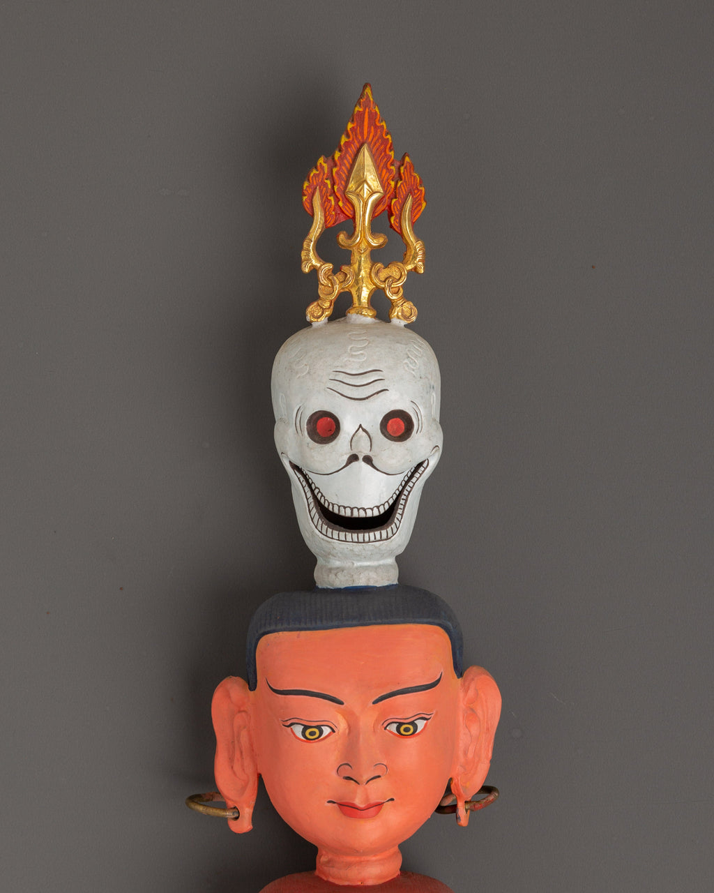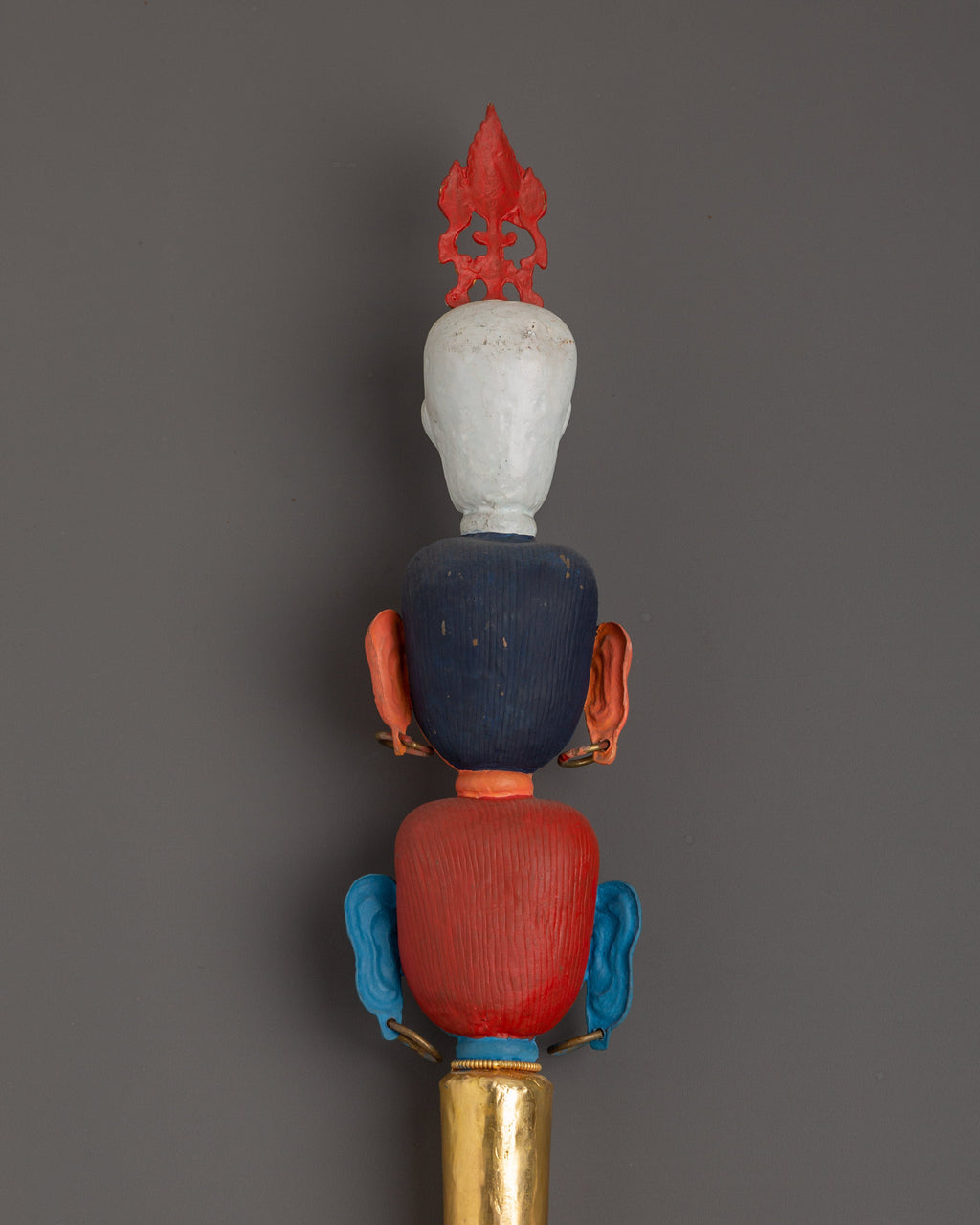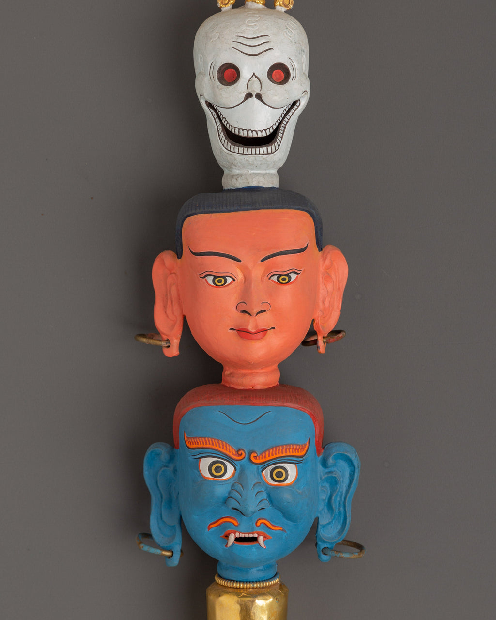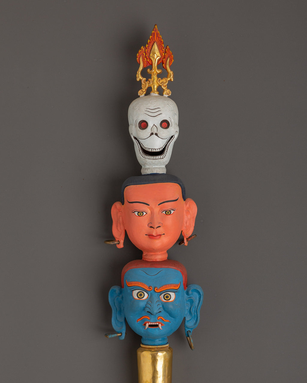 The Khatan Tibetan Ritual Item is a diligently made spiritual artifact with rich meaning and craftsmanship. Standing 72.5 cm tall and 11 cm broad, this sacred artwork is made of copper, plated in gold, and beautifully painted with acrylic colors to enhance its divine presence. The Khatan has three expressive faces: a skull face, signifying the cycle of life and death; a serene face, representing tranquility and knowledge; and a wrathful face, indicating staunch protection against negativity. The tranquil and wrathful faces are adorned with delicate earrings, which add to their regal and spiritual atmosphere.