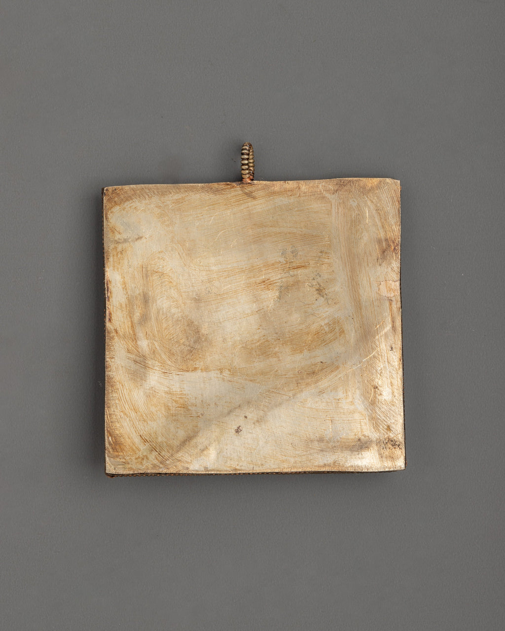 This handcrafted Kirtimukha Wall Hanging adds a hint of legendary strength and fierce protection to any setting. This artwork, measuring 11.5 cm in height and 10 cm in breadth, is made of white metal, highlighting the detailed features and potent symbolism. The Kirtimukha, frequently shown as a fearsome guardian in Hindu and Buddhist art, symbolizes heavenly protection that protects your home or holy area from evil forces. Its stunning design makes it a visually appealing object that combines traditional beauty with spiritual importance.