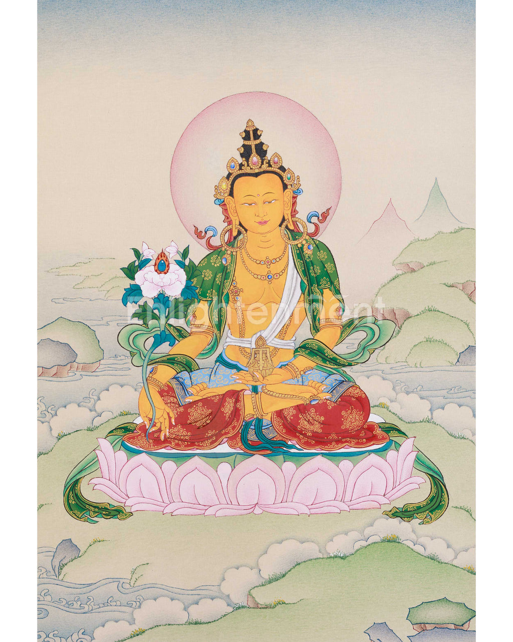The thangka depicts Kshitigarbha seated on a lotus throne, set upon a luminous moon disc, symbolizing purity and wisdom. His calm and gentle expression radiates peace, and the five-jeweled crown softly highlights his wise and enlightened status. The lotus beside him signifies spiritual awakening, and the vase filled with nectar embodies healing and the perpetuity of compassion. Executed with meticulous detail, this artwork represents the profound spiritual essence of Kshitigarbha, serving as both a meditative aid and a timeless artifact of sacred decor.
