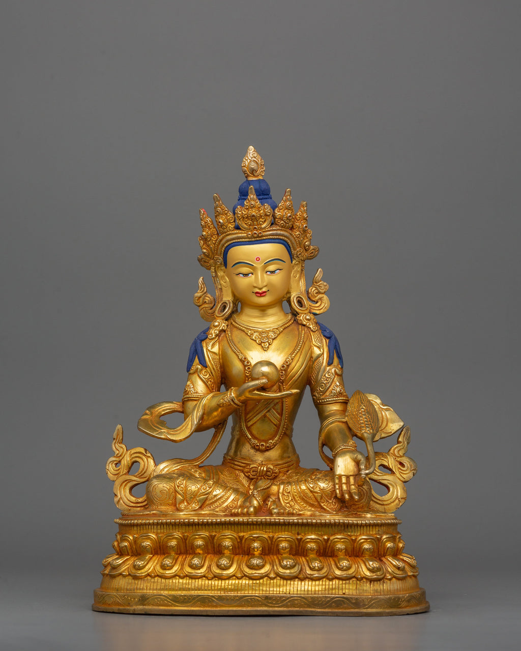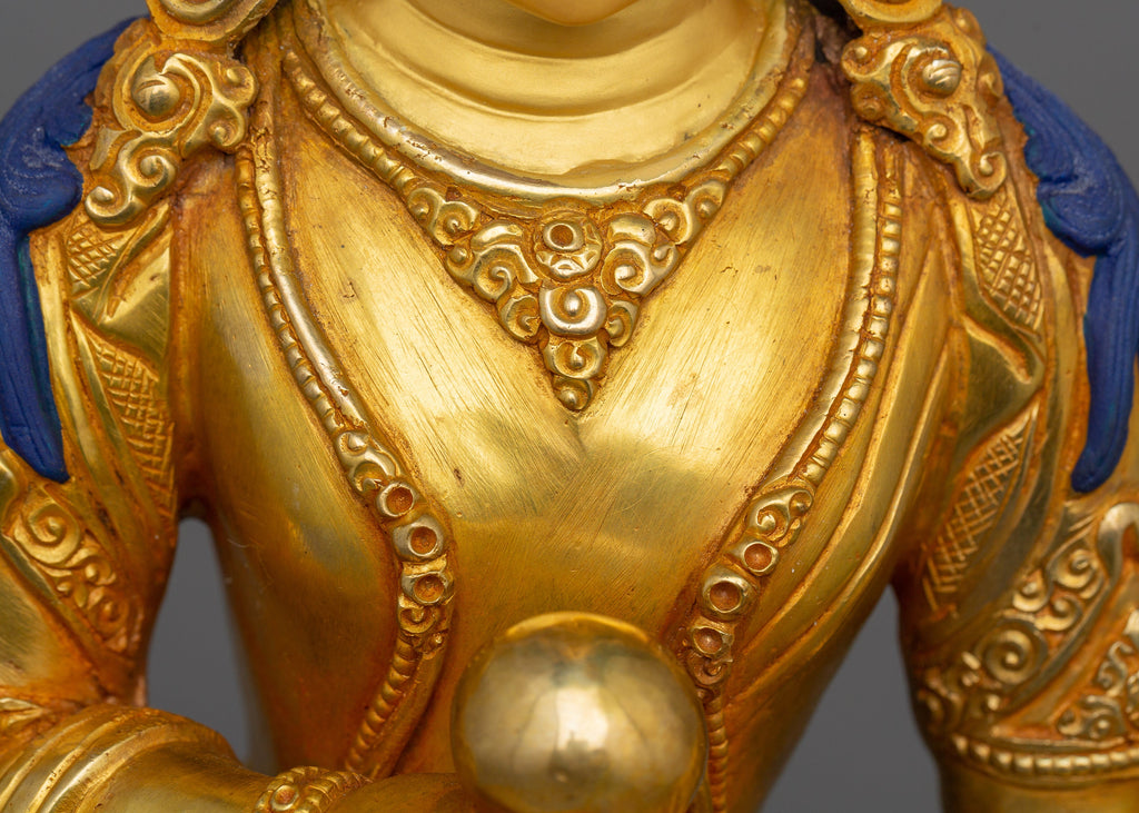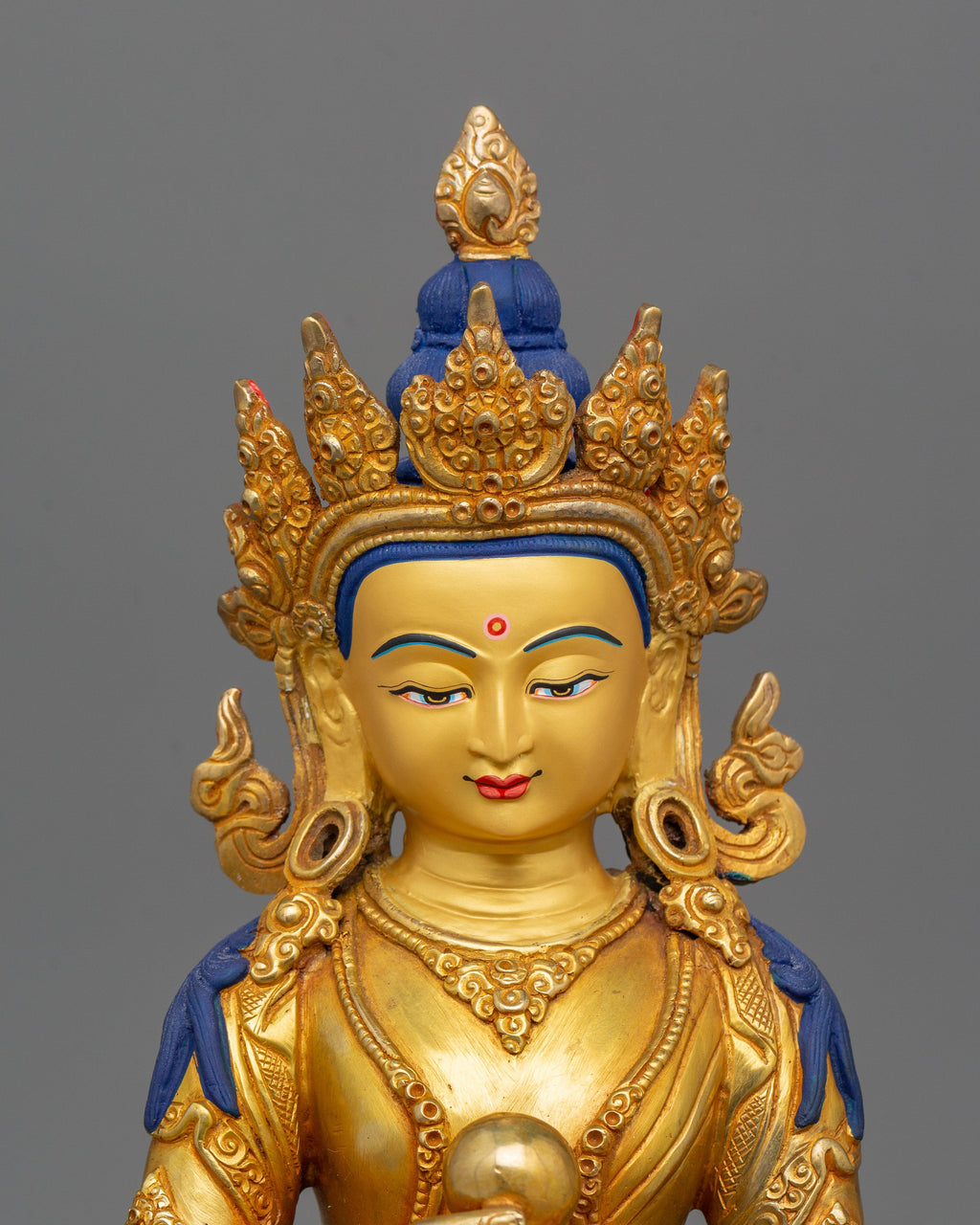 This Kshitigarbha Earth Store Bodhisattva Sculpture represents the essence of compassion, protection, and unwavering determination to assist beings towards liberation. This statue, which measures 13" (Height) x 9.4" (Base) and weighs 4.03 kg, is made from a copper body and adorned with 24K gold gilding and gold and acrylic paints. This sculpture is a portrayal of Kshitigarbha's commitment to assist all sentient beings, is an excellent addition to any meditation room, altar, or sacred collection.