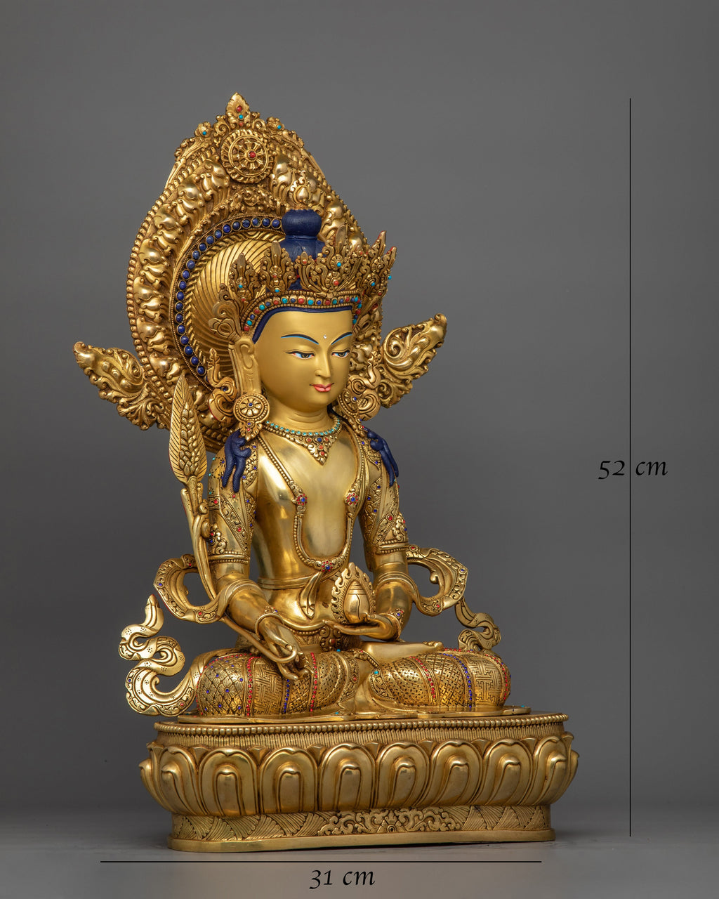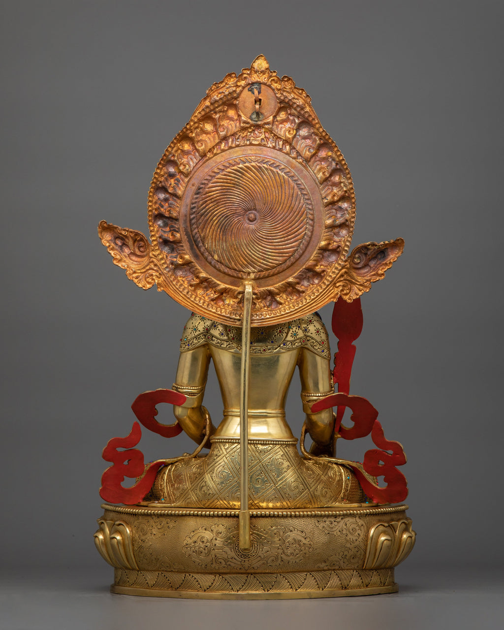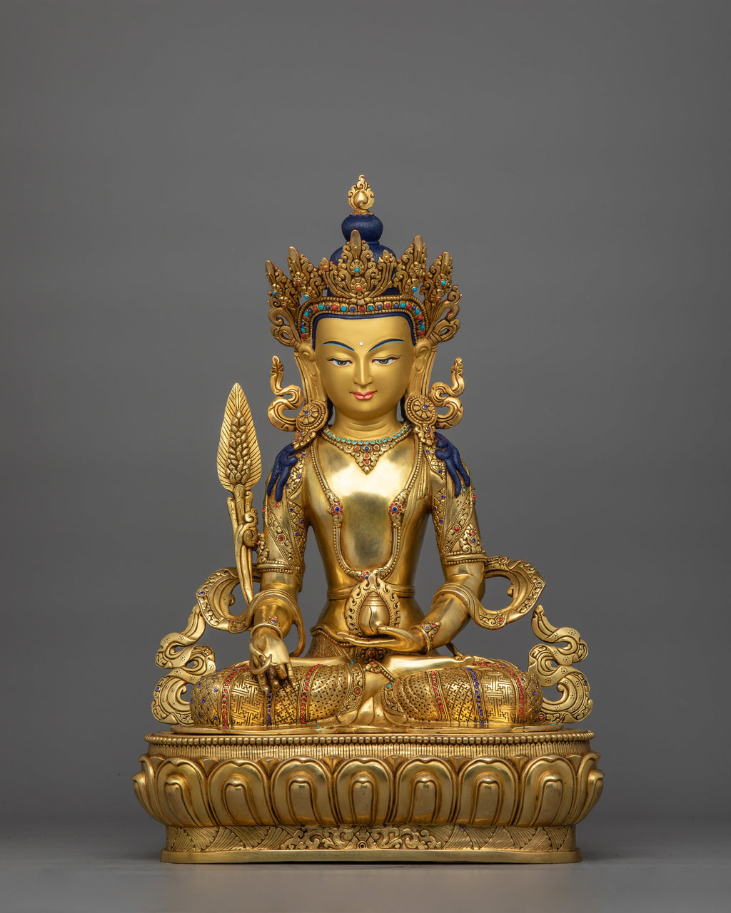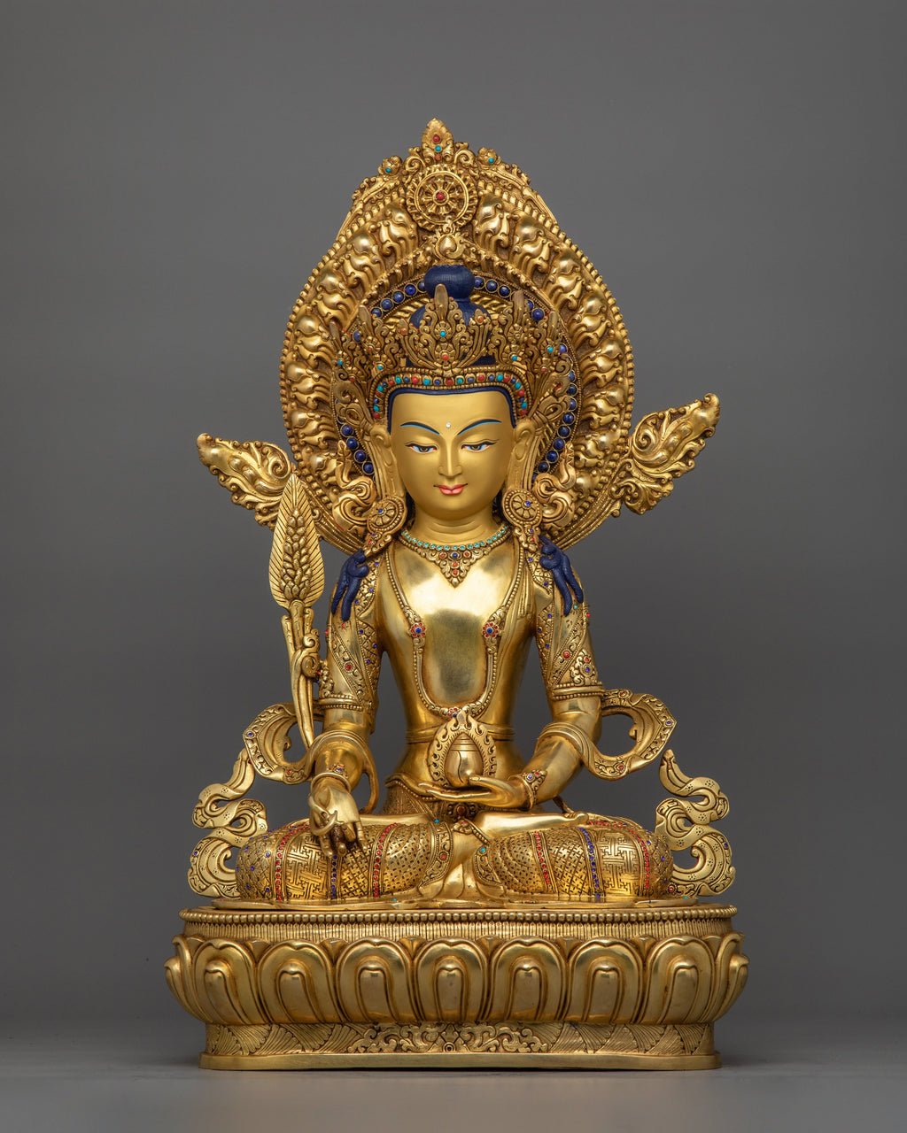 The sacred halo of Kshitigarbha is a striking feature, embellished with hand-carved jewels symbolizing purity and enlightenment. Kshitigarbha is depicted in a peaceful meditative posture, holding the Cintamani (wish-fulfilling jewel) in his right hand, which represents ultimate wisdom, spiritual wealth, and a commitment to fulfilling the needs of all sentient beings. The treasure vase signifies the Bodhisattva's endless blessings, including prosperity, spiritual growth, healing energy, and profound compassion for all beings.