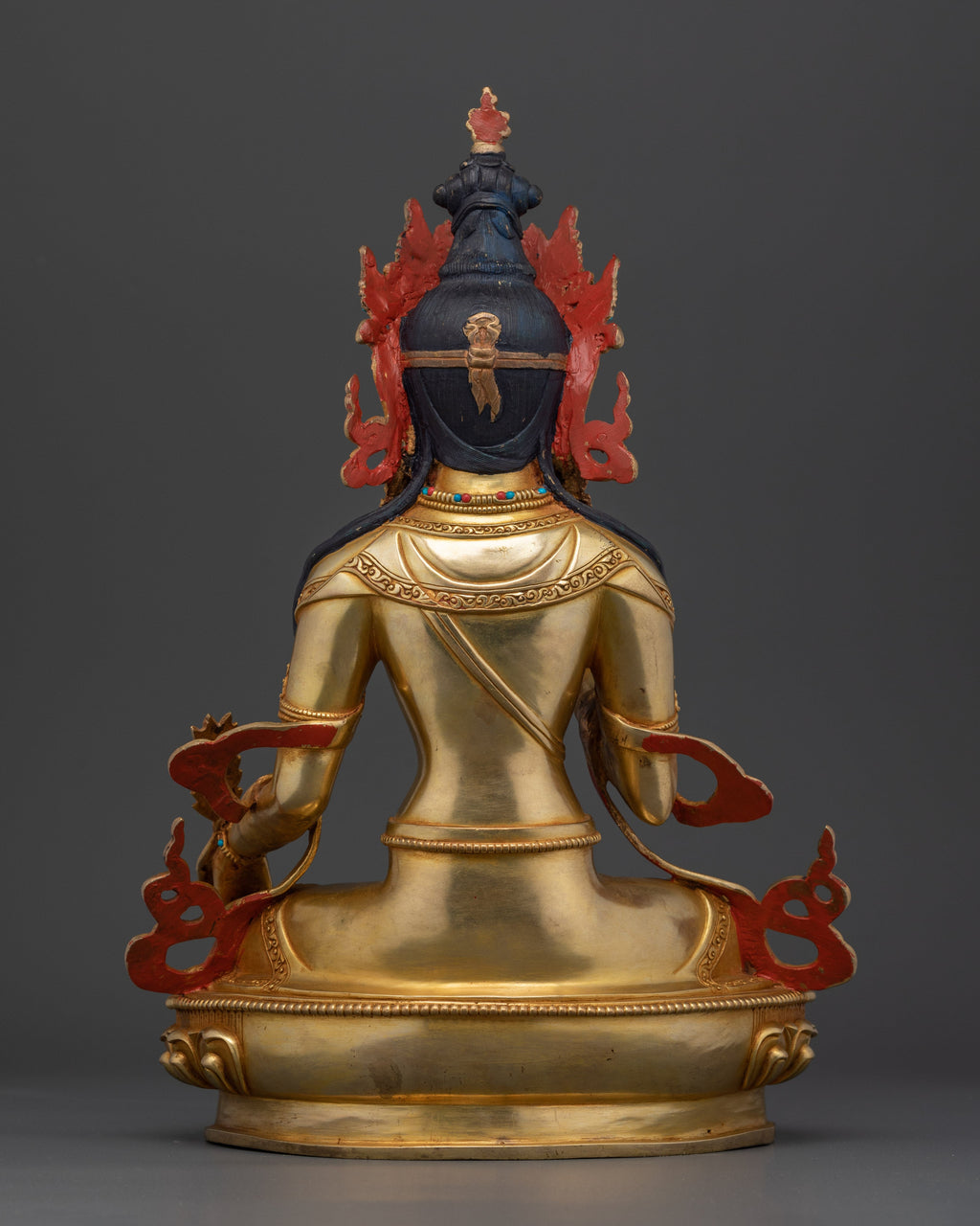 This beautiful Kshitigarbha statue clutching cintamani, measuring 12.8 inches in height and 9.1 inches in base width, depicts the Bodhisattva of Compassion. This statue, weighing 3.17 kg, is made of copper and beautifully completed with 24K gold plating, gold and acrylic paintwork, and hand-carved jewels.