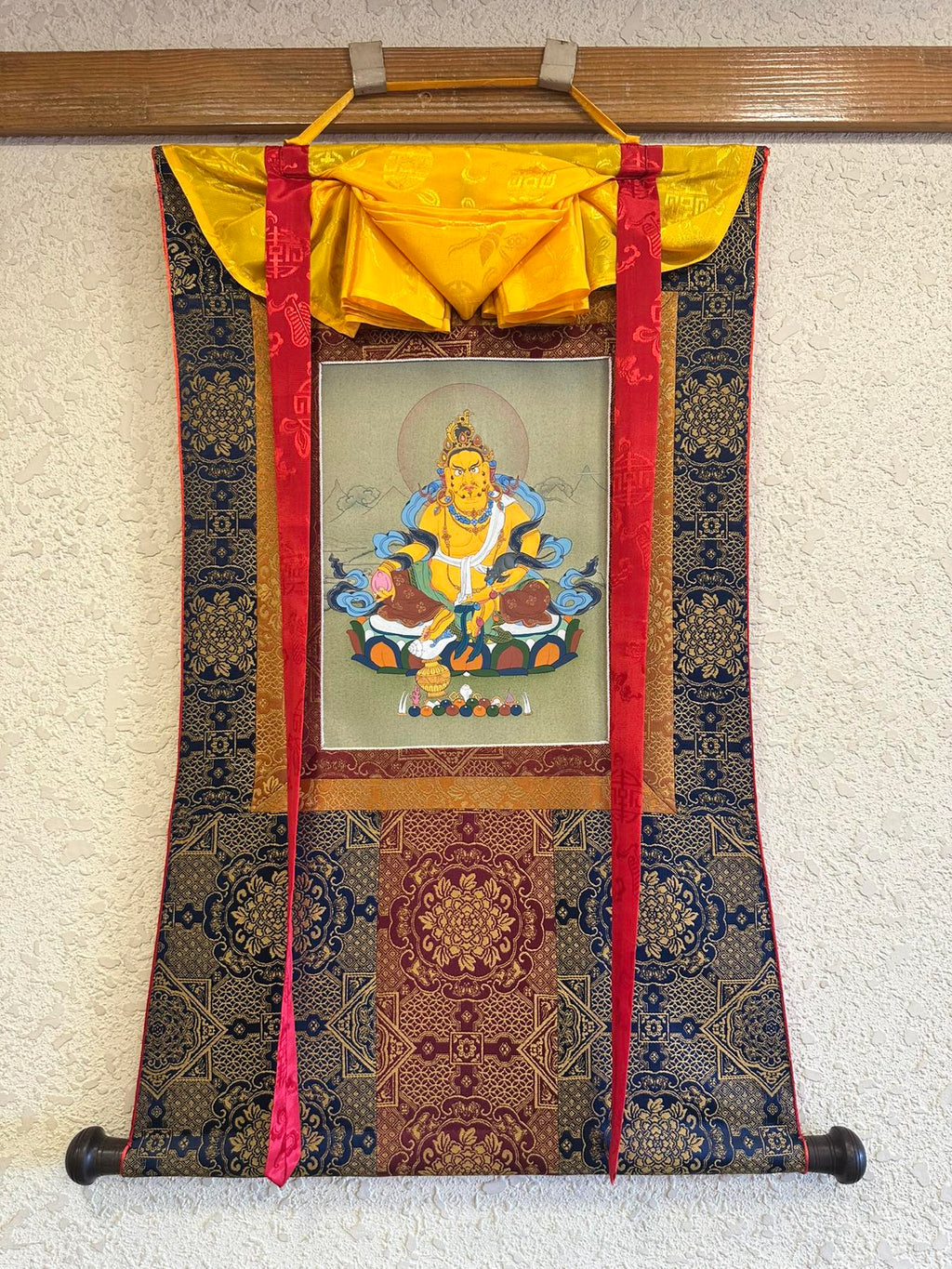 Kuber, the Tibetan wealth deity, appears in his traditional form with a peaceful expression. Holding a mongoose, symbolizing treasures and spiritual riches, and a citron fruit representing prosperity and luck, he also rests his right leg on a vase and a conch shell, showing control over natural forces. This thangka depicts his protective, generous energy, inviting blessings of abundance and prosperity. More than art, it's a conduit for prosperity, peace, and spiritual growth, reminding viewers of the material and spiritual riches Kuber offers.