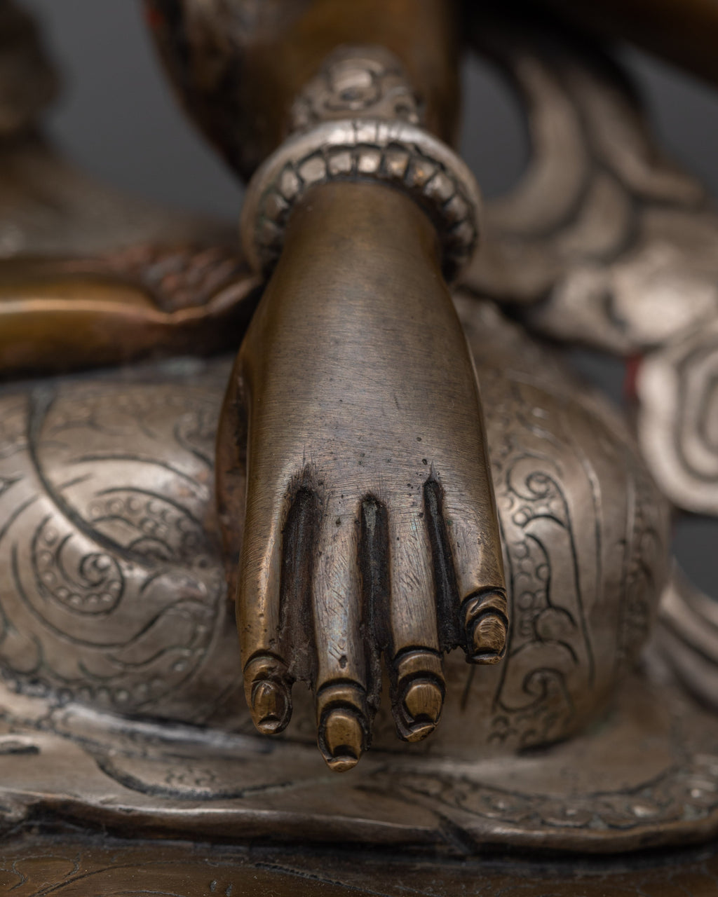 The Kunzang Gyalwa Dupa (Bon Deity), a respected Bon Deity, is skillfully built from oxidized copper with silver plating and enhanced with gold and acrylic paints. This statue, which stands at an amazing height of 17.3" (44 cm) with a base width of 13.2" (33.5 cm), illustrates the deity's holy presence. The diligent design of the figure, along with the luxurious materials, heightens its spiritual significance. This magnificent image of Kunzang Gyalwa Dupa, weighing 5.67 kg, personifies the Bon tradition's ageless strength, wisdom, and protection.
