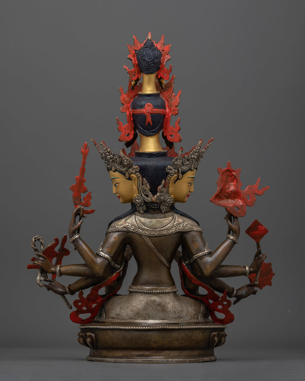A Bon deity represents the ability to discern the suffering of sentient beings from all directions with increased wisdom and awareness. The multi-armed form, with each arm bearing symbolic artifacts such as the Dharma Wheel, burning jewel, vase, lotus, and prayer beads, symbolizes the deity's limitless ways of assisting those in need. The deity is seated in a meditation posture on a lotus pedestal, his serene and sympathetic expressions emphasizing his role in spiritual awakening and escape from samsara. Kunzang Gyalwa Dupa, adorned with jeweled crowns and celestial ornaments, manifests in various forms, from harmless to wrathful, to serve a variety of goals, including pacification, increasing, magnetizing, and subduing. The hand mudras represent compassion and activity in leading sentient beings to enlightenment.