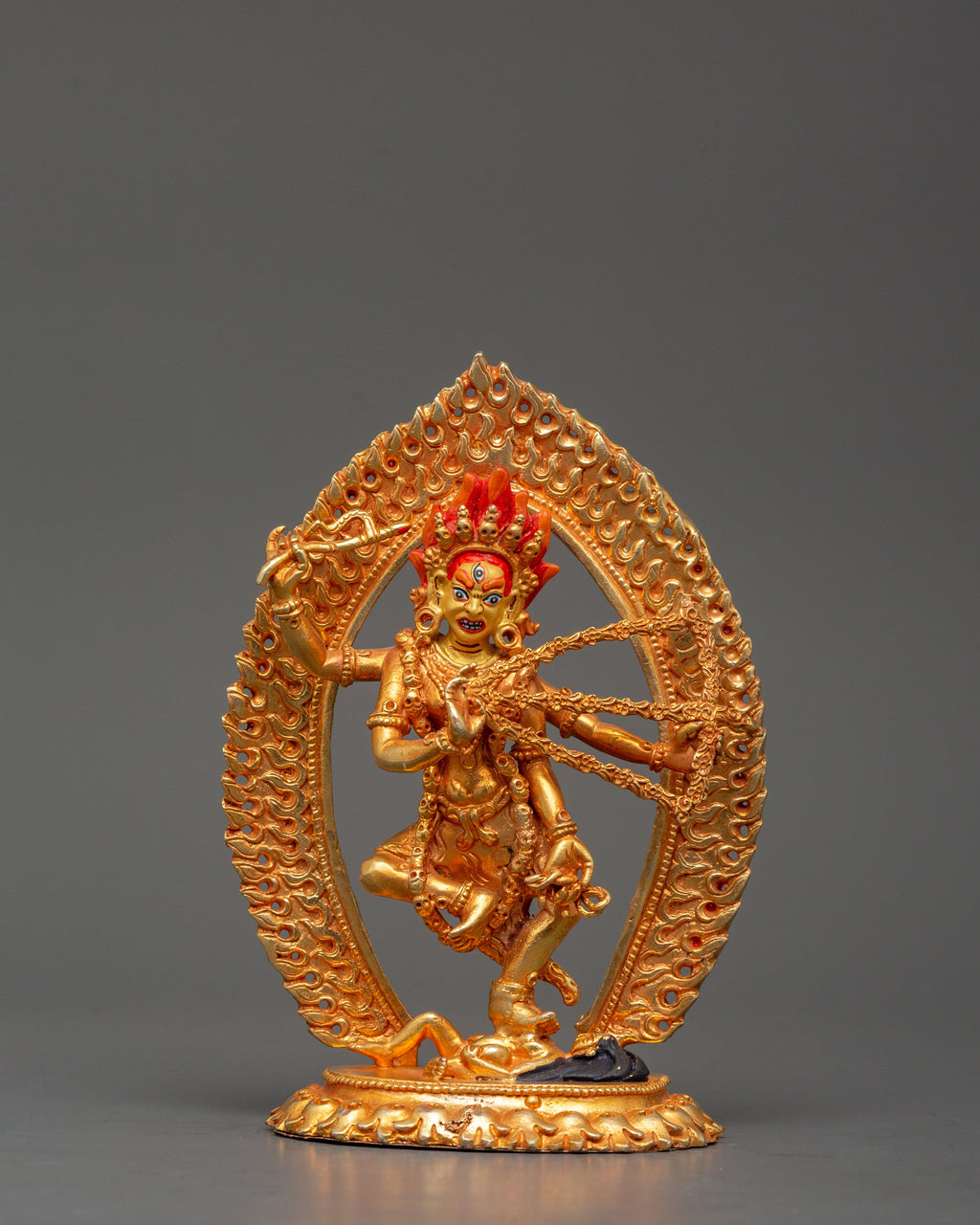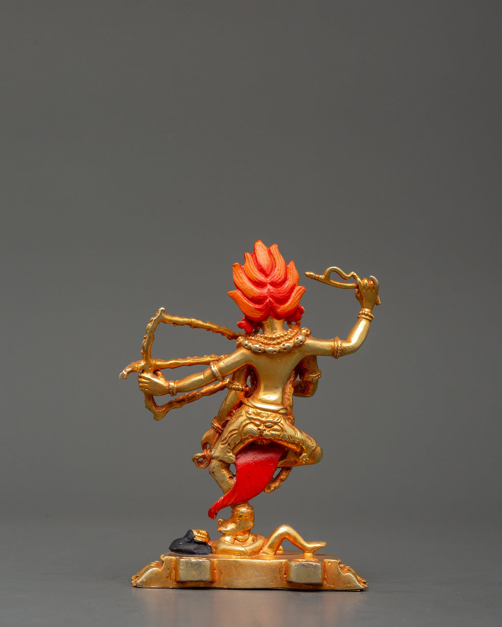 This Kurukulla Statue depicts the Tibetan goddess of love, passion, and power, portraying her vitality and vigor. Standing 14 cm tall and 11 cm wide, the statue is made of copper with electro-gold plating, making it a striking decorative and spiritual object. The statue's rich detailing and beautiful gold finish give it a heavenly, charming atmosphere, representing the goddess's capacity to draw and invoke transformational energies. Weighing only 0.42 kg, it is ideal for any holy area or as an artistic treasure.