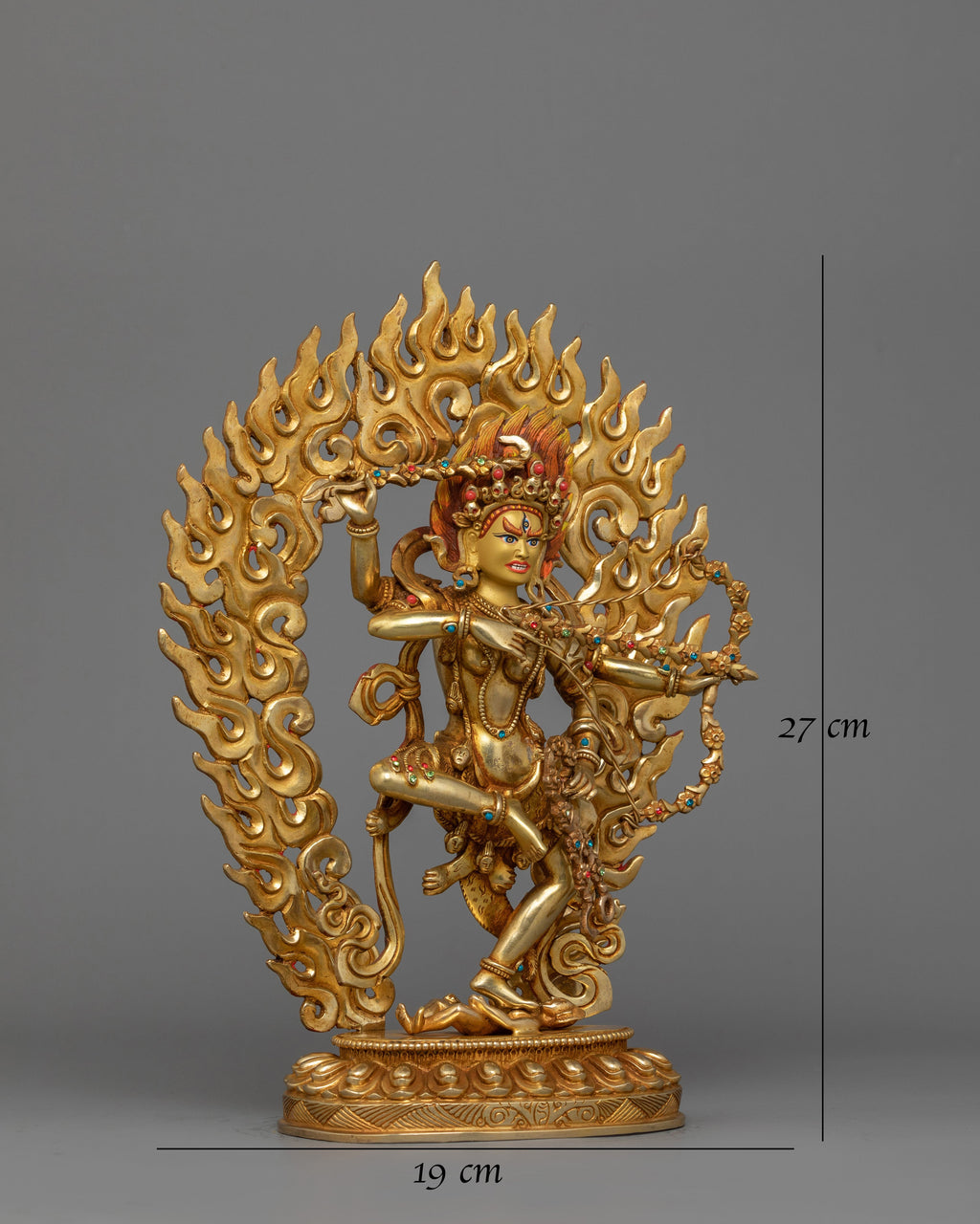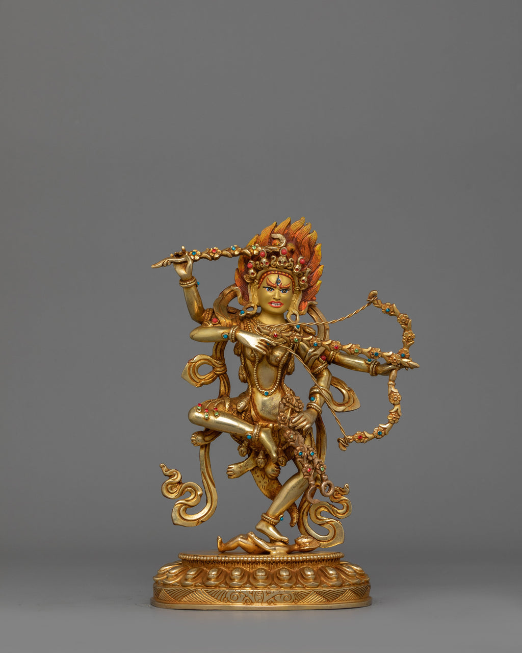 The Kurukulla Semi-Wrathful Dakini Statue stands 10.6 inches (27cm) in height with a base width of 7.5 inches (19cm), showcasing intricate craftsmanship. It is handcrafted from fine copper, gilded with 24K gold, and embellished with acrylic paintings. This artwork captures the essence of Kurukulla, the goddess of enchantment and magnetizing activities in Vajrayana Buddhism.