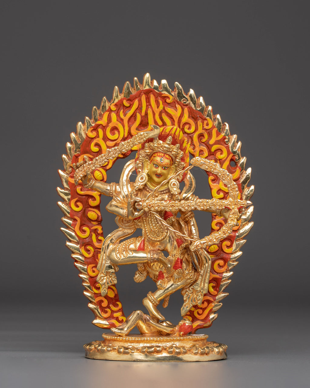 The Kurukulla Tibetan Goddess Statue is a sacred symbol in Buddhism, representing the divine feminine spirit of attraction, empowerment, and transformation. This religious figure, made of copper with gold plating and vibrant acrylic paintings, exudes spiritual beauty and devotional craftsmanship. Kurukulla, known as the goddess of enchantment and inspiration, is frequently invoked to cultivate inner strength, compassion, and spiritual magnetism, making this piece a valuable addition to any altar or meditation space.