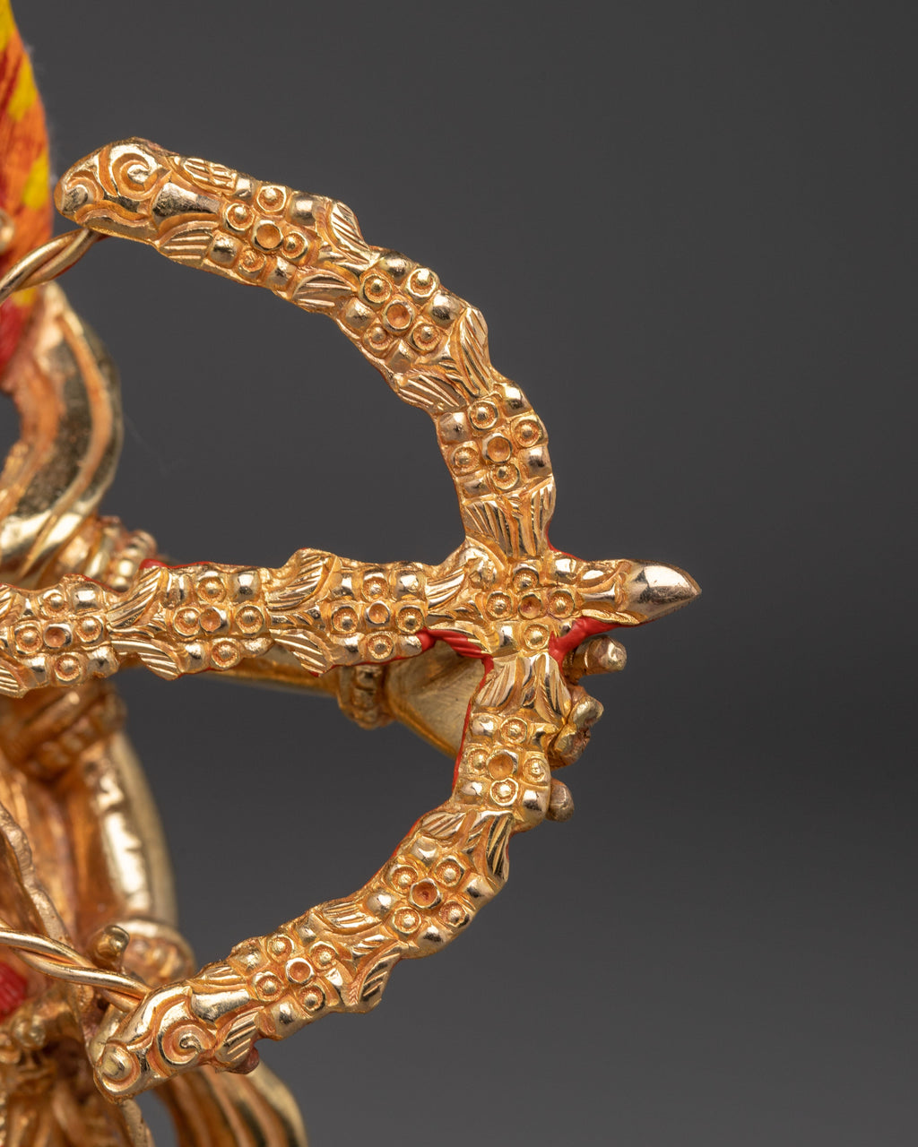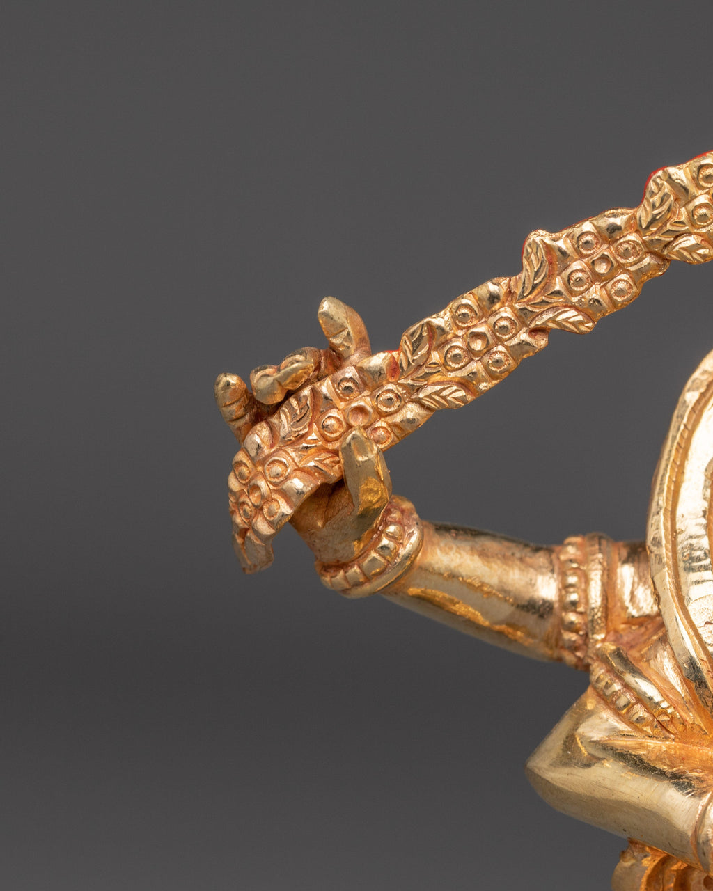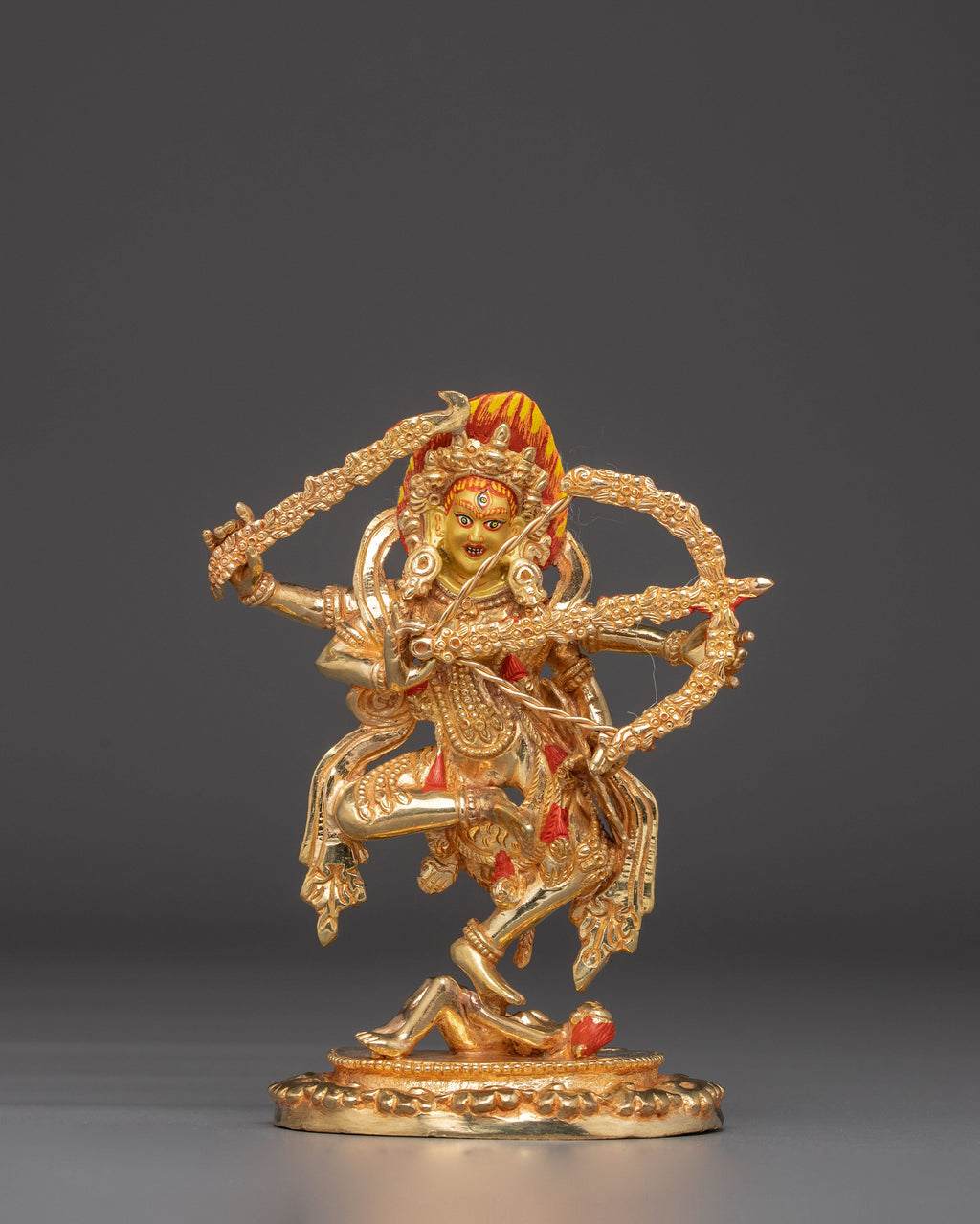 Kurkulla dances seductively with her right leg raised, treading upon a vanquished human form representing outer and inner obstacles. She has four arms and holds various weapons, indicating her powers to bewitch and ensnare the hearts of men and women. With two hands, she draws a bow made of flower garlands, and she prepares to shoot a beautiful arrow whose shaft is made of flowers and whose flight is made of leaves. Her other left hand holds a lasso, and her right hand holds a flower goad. They also symbolize her ability to favorably influence and incline the minds of others to aid and protect her followers.