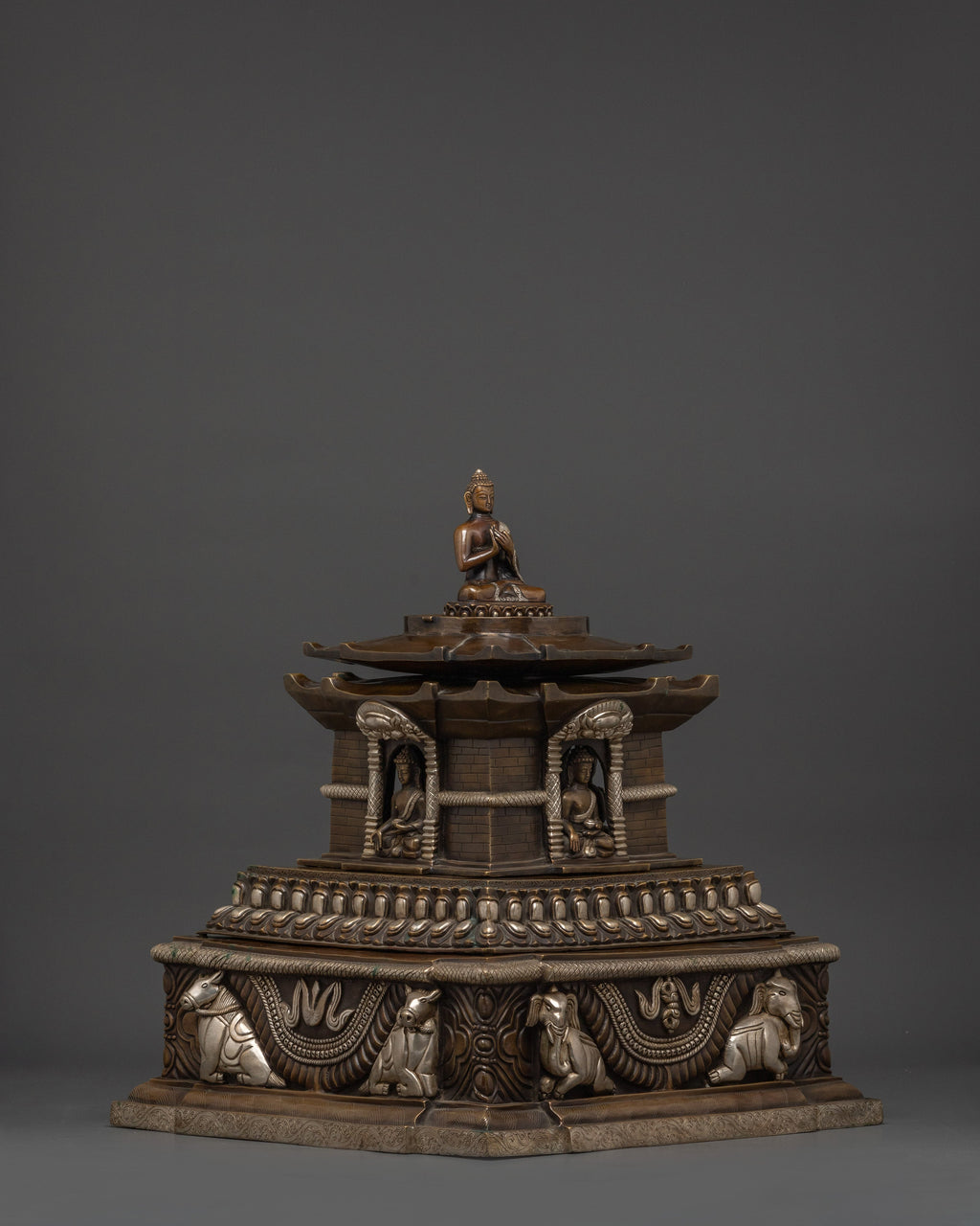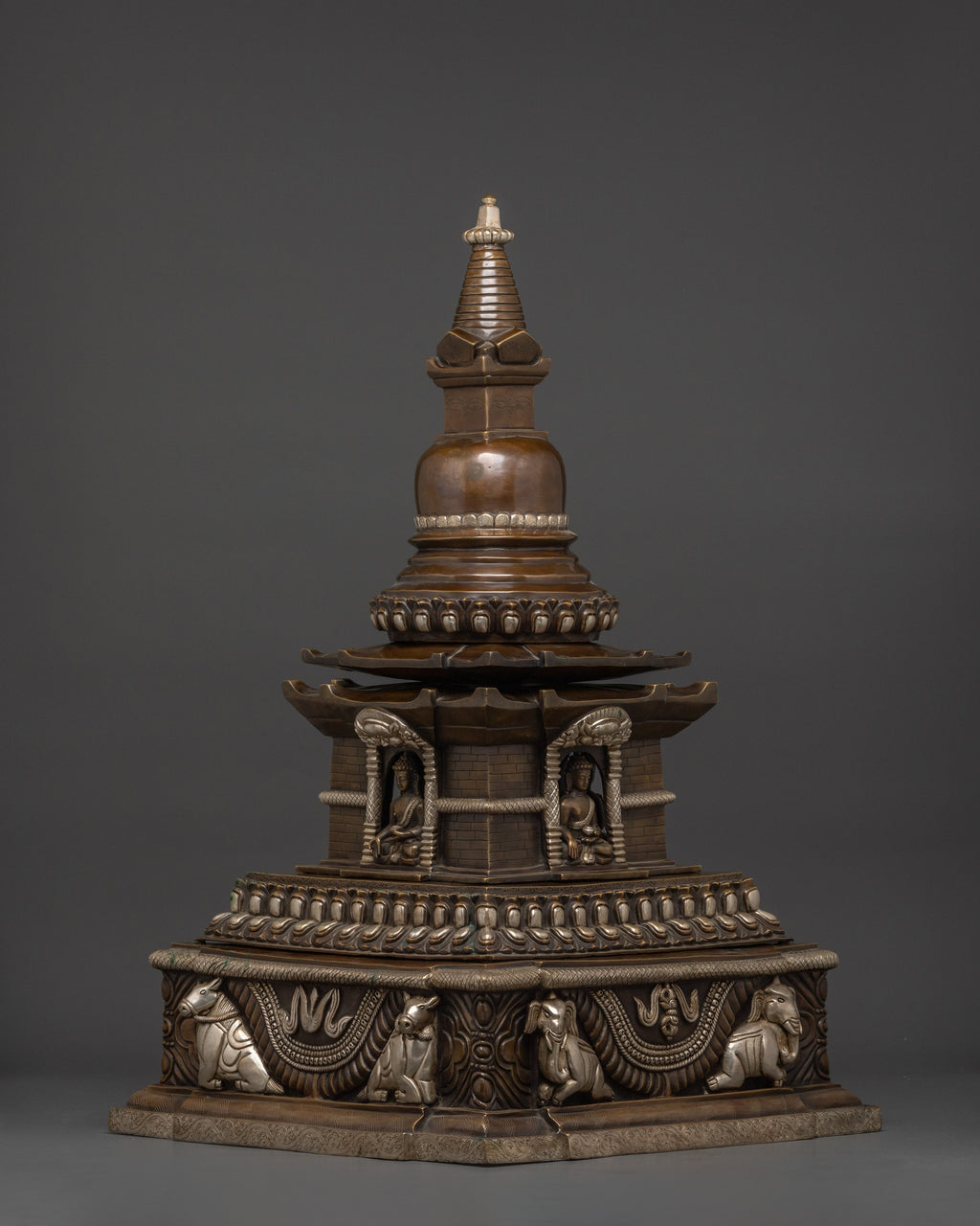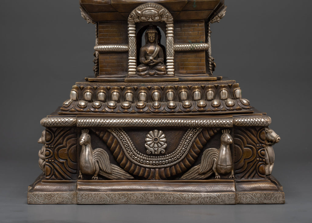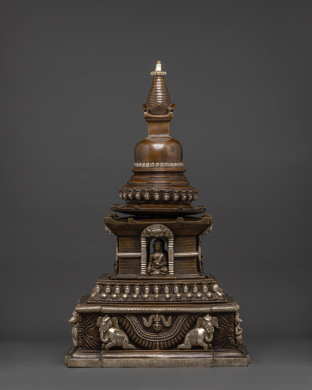 The design of this Oxidized Copper Stupa features intricate carvings and motifs that represent key elements of Tibetan Buddhism. The stupa is crowned with a prominent spire, symbolizing enlightenment and the path to spiritual awakening. At the center of the structure, a seated Buddha statue is housed, embodying the teachings of compassion, wisdom, and peace. The elephant carvings on the base further emphasize the stupa's connection to spiritual strength and protection, as elephants are revered as symbols of mental clarity and mindfulness in Buddhist teachings.