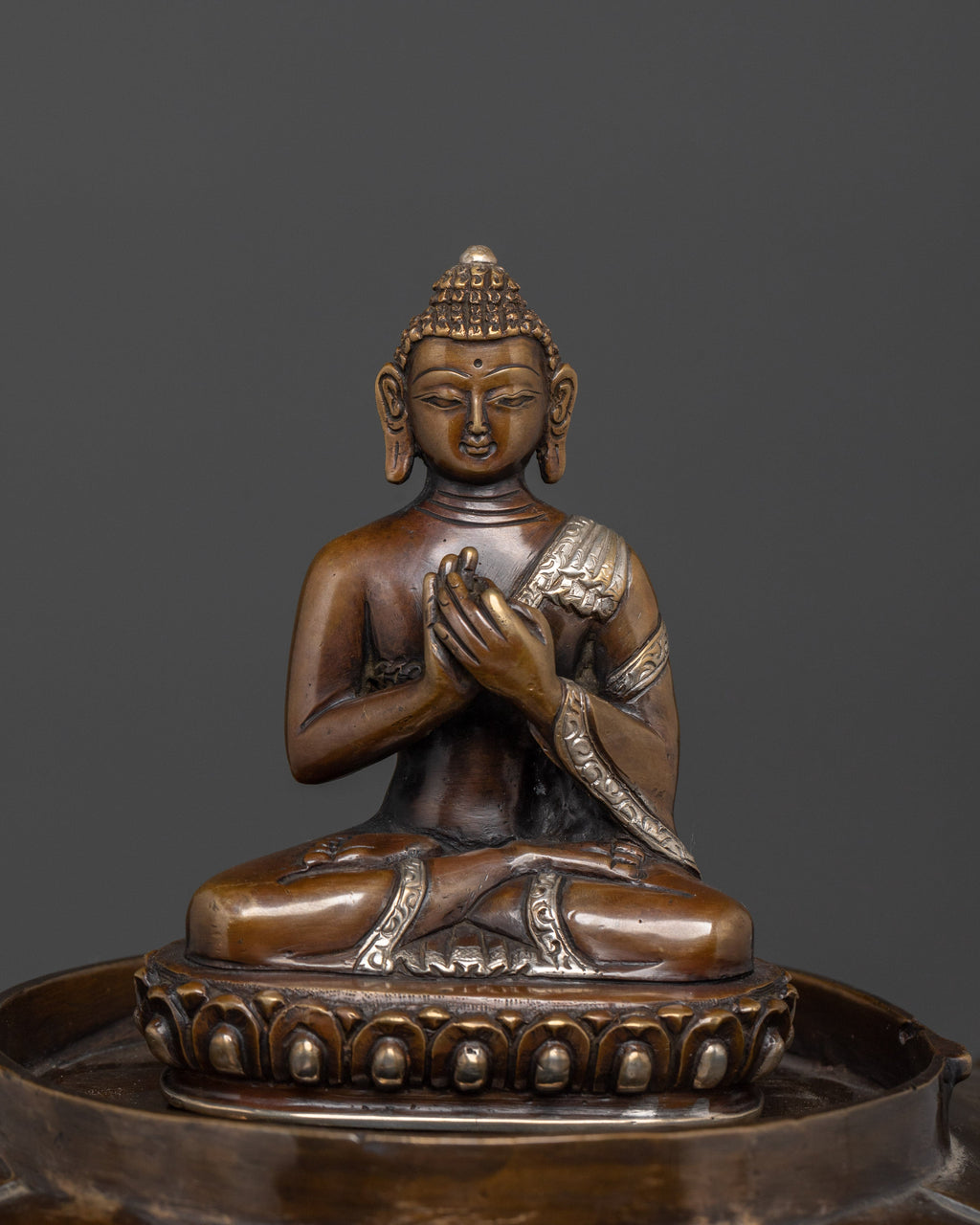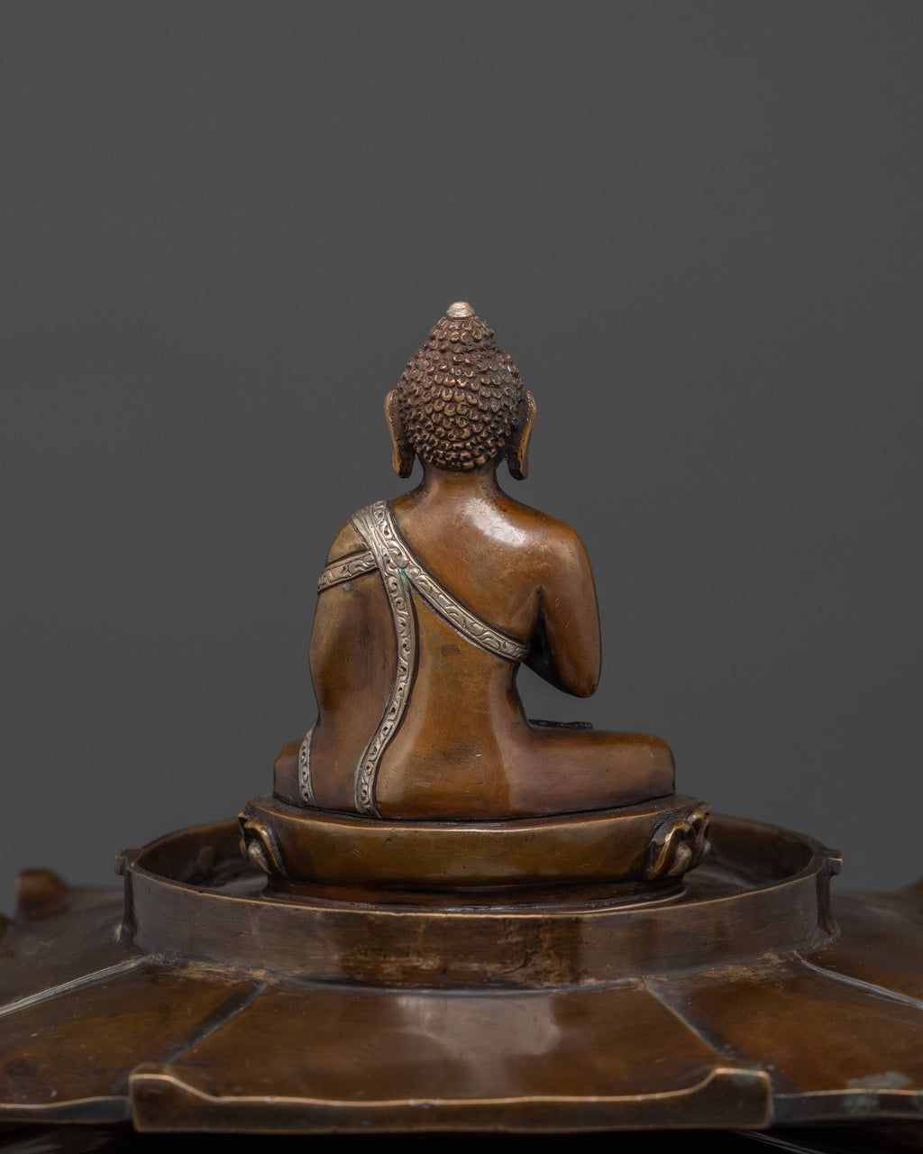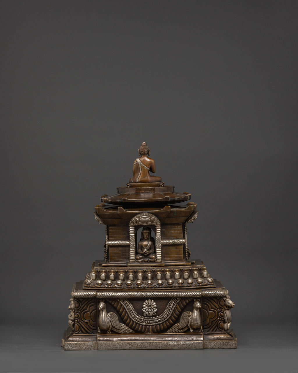 The design of this Oxidized Copper Stupa features intricate carvings and motifs that represent key elements of Tibetan Buddhism. The stupa is crowned with a prominent spire, symbolizing enlightenment and the path to spiritual awakening. At the center of the structure, a seated Buddha statue is housed, embodying the teachings of compassion, wisdom, and peace. The elephant carvings on the base further emphasize the stupa's connection to spiritual strength and protection, as elephants are revered as symbols of mental clarity and mindfulness in Buddhist teachings.