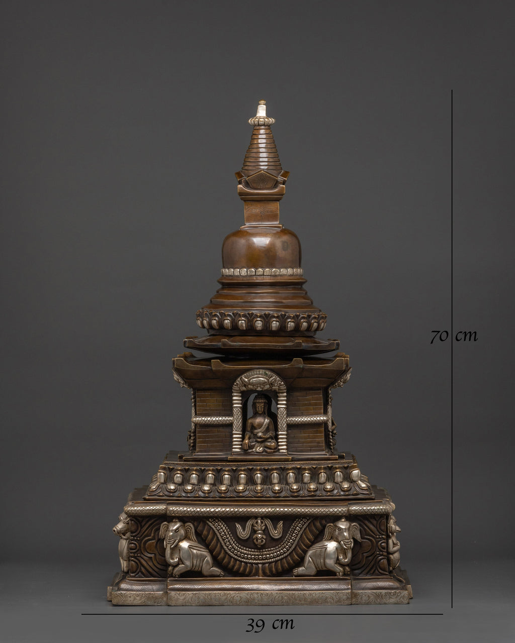 This Large Oxidized Copper Stupa is a majestic and spiritually significant object that was meticulously constructed. This stupa, which stands 70 cm tall and 39 cm wide, weighs an impressive 27.98 kg and is crafted from oxidized copper with silver plating, adding to its spiritual beauty and eternal appeal. This stupa is an excellent addition to any Buddhist altar, spiritual area, or home decor, providing both aesthetic value and profound symbolism.