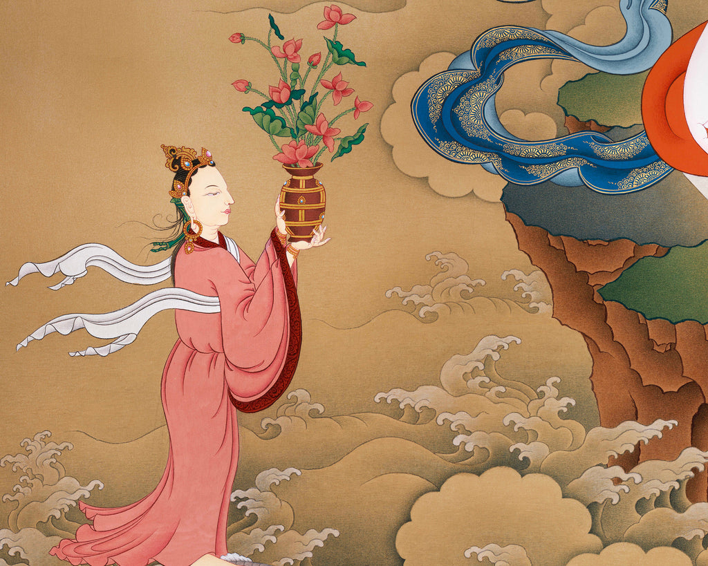 In this thangka, White Tara is depicted with serene beauty and grace, seated upon a lotus throne, surrounded by a peaceful cosmic background. The seven eyes upon her face, palms, and soles radiate her all-encompassing awareness and compassion. Above her, Amitabha Buddha is depicted in his meditative form, symbolizing the source of light and wisdom from which White Tara emanates. Alongside White Tara, an offering deity is depicted, symbolizing generosity and spiritual offerings to all beings. Together, these figures encapsulate the perfect balance of wisdom, compassion, and healing energy.