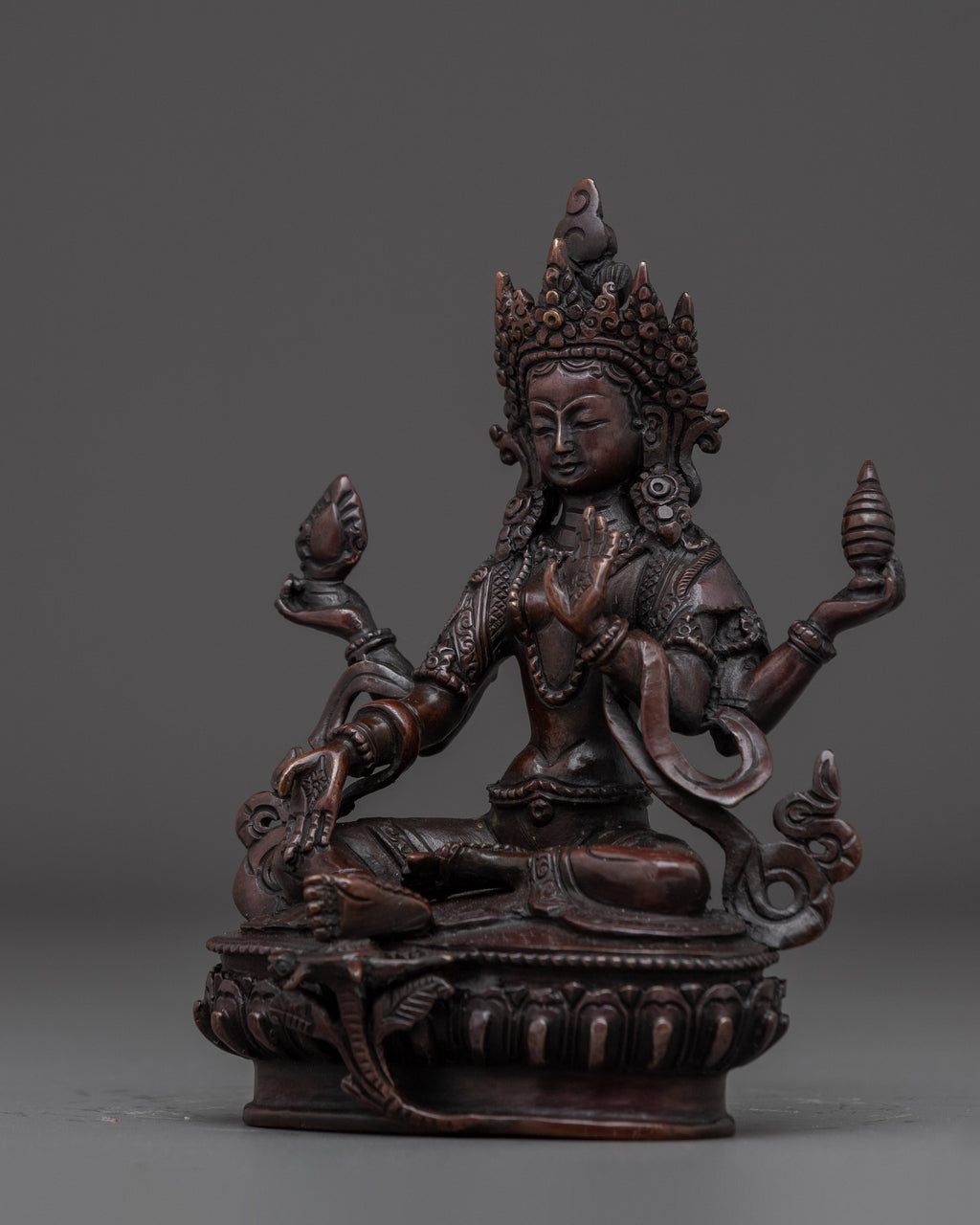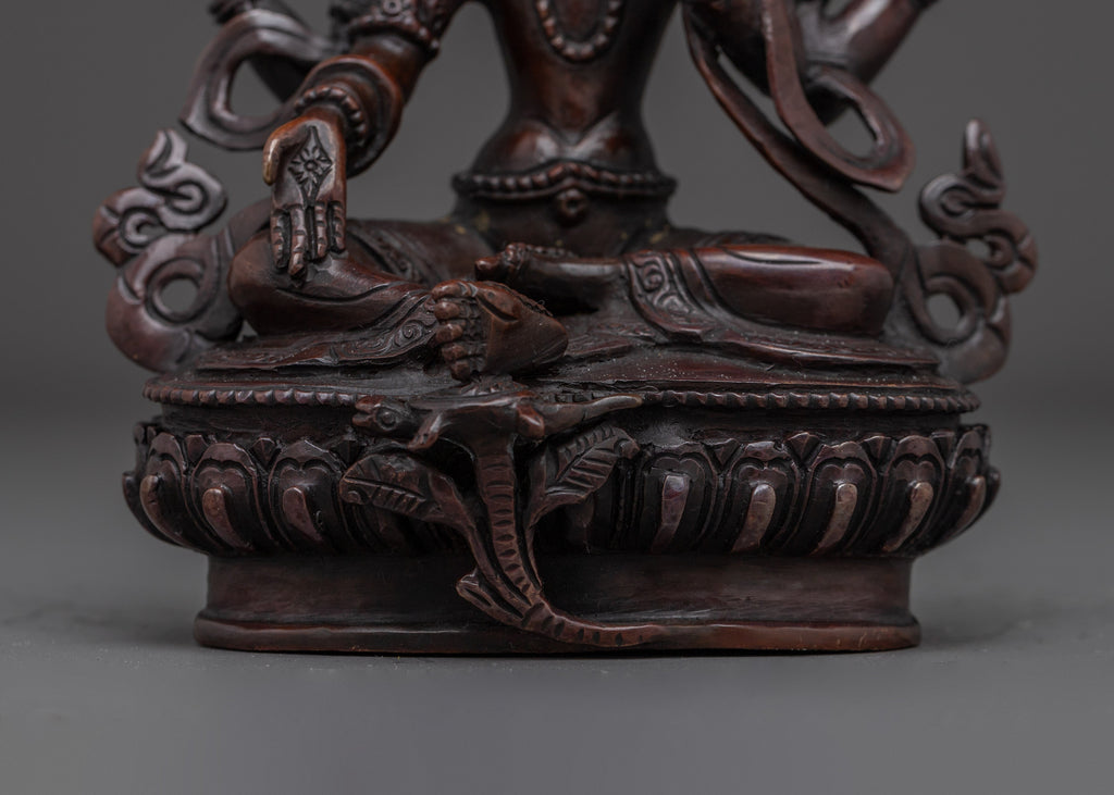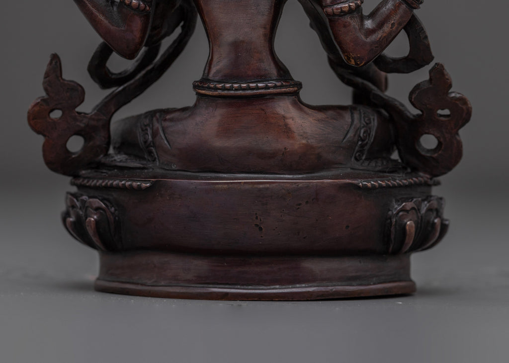 In her iconography, she is depicted seated gracefully atop a moon disc lotus base, symbolizing purity and spiritual awakening. Her right hand performs the varada mudra, the gesture of granting boons and compassion, while her left hand displays the abhaya mudra, signifying protection and fearlessness. In her upper right hand, she holds the Jwala Nhaykha, a flaming jewel symbolizing radiant wisdom and generosity. Her upper left hand holds the Sinamu, a traditional offering vase associated with abundance and blessings. This rich symbolism reflects her benevolent nature and her role as a source of both spiritual guidance and material support.