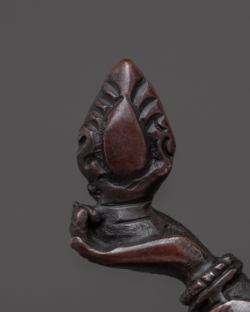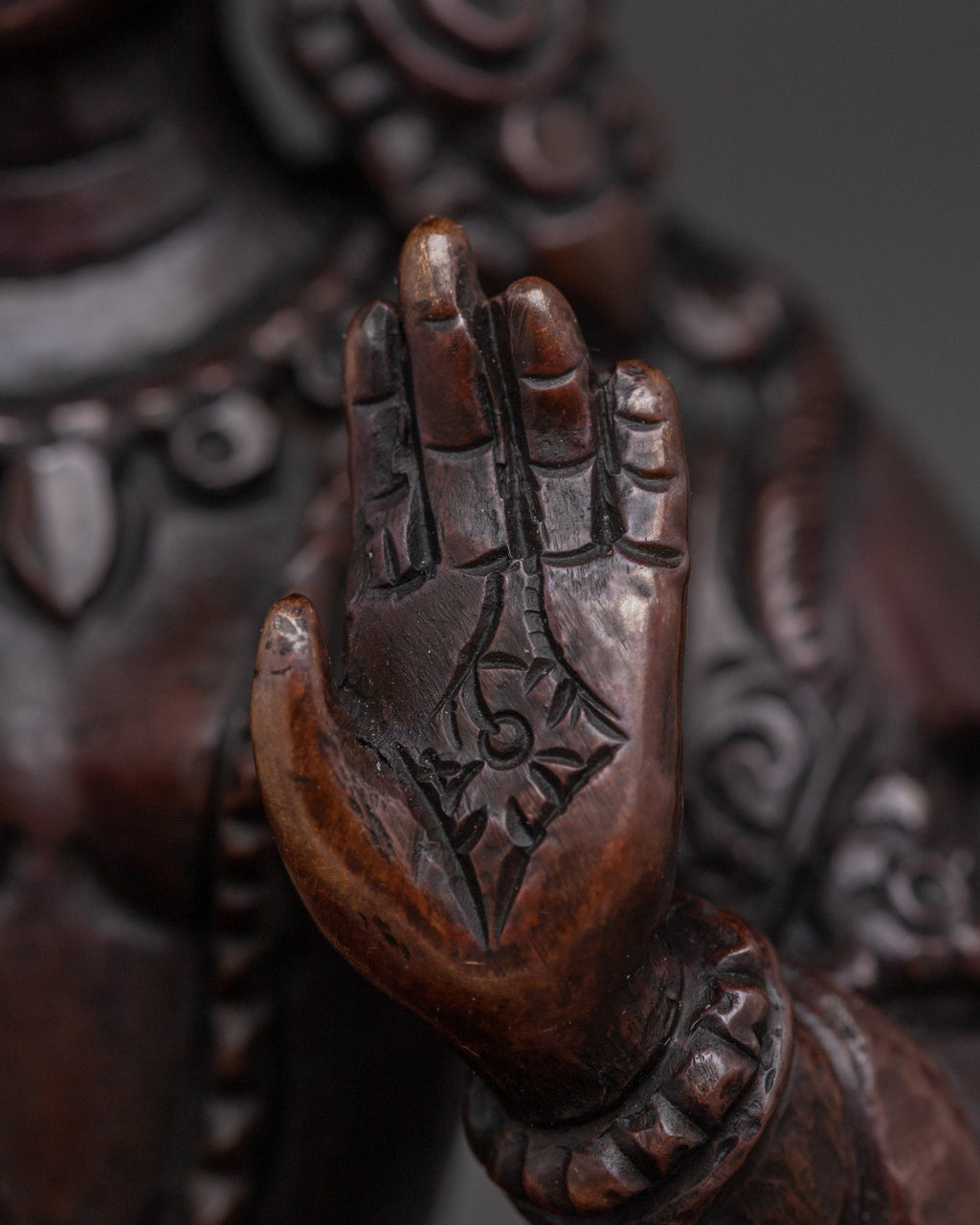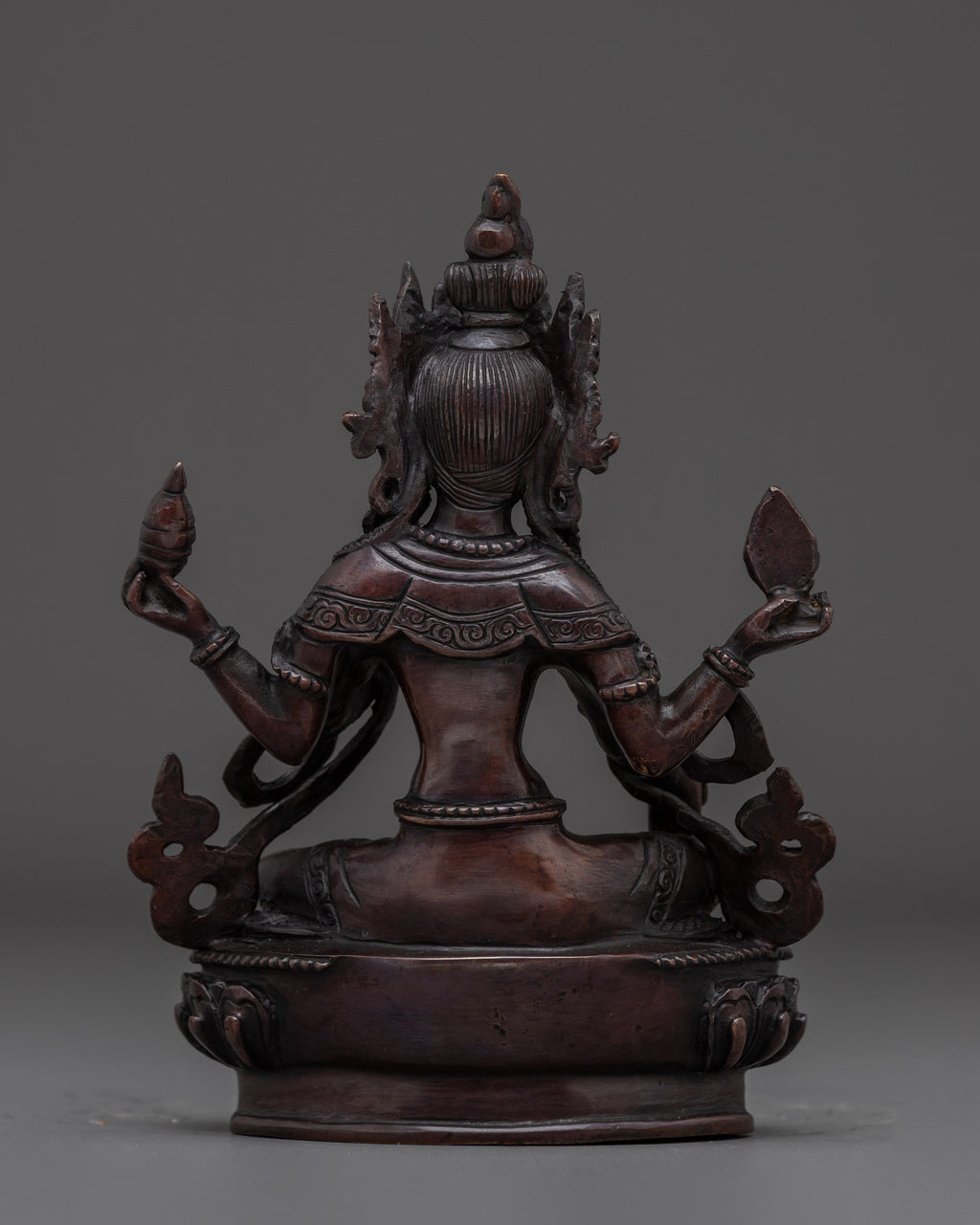 In her iconography, she is depicted seated gracefully atop a moon disc lotus base, symbolizing purity and spiritual awakening. Her right hand performs the varada mudra, the gesture of granting boons and compassion, while her left hand displays the abhaya mudra, signifying protection and fearlessness. In her upper right hand, she holds the Jwala Nhaykha, a flaming jewel symbolizing radiant wisdom and generosity. Her upper left hand holds the Sinamu, a traditional offering vase associated with abundance and blessings. This rich symbolism reflects her benevolent nature and her role as a source of both spiritual guidance and material support.
