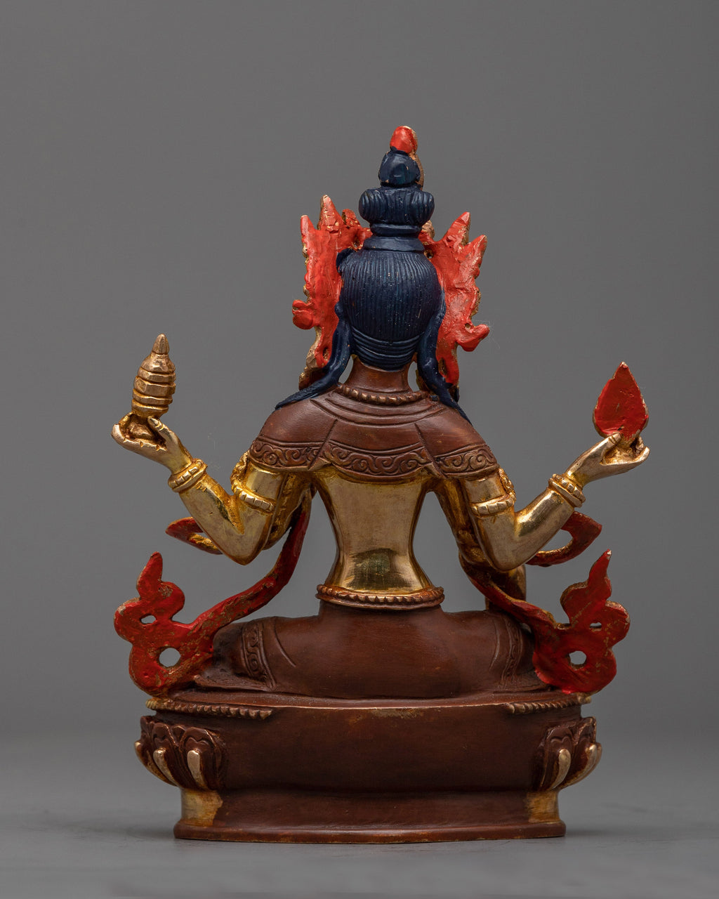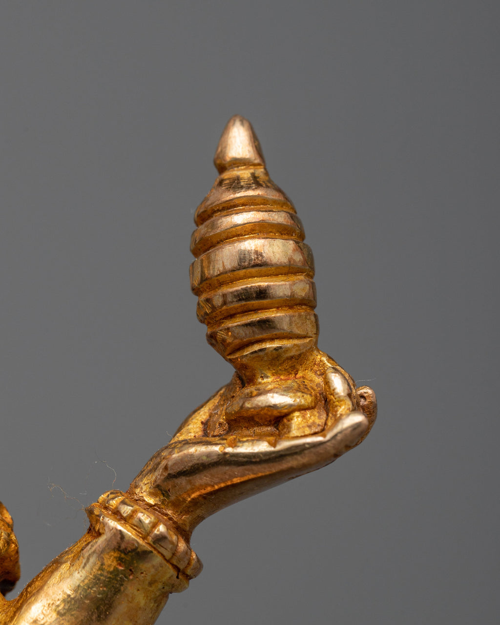 Presenting the Laxmi Sculpture: a representation of the Hindu goddess of wealth, prosperity, good fortune, and beauty, Laxmi. At a mere 6.6 inches in height and 4.9 inches at the base, with a weight of 0.89 kg, this sculpture embodies Goddess Laxmi's tranquil elegance and abundant presence. This piece, made of an oxidized copper body with 24K gold plating for timeless elegance, is further enhanced by intricate paintings in gold and acrylic that represent the goddess' unbounded generosity and the abundance she bestows upon her devotees.
