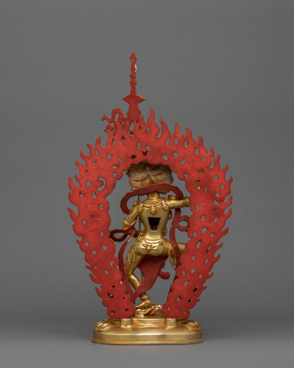 Simhamukha, a Buddhist figure, is surrounded by flames, which represent a transforming force and the ability to overcome ignorance and karmic impurities. She carries a vajra-handled knife, destroying connection and ego, as well as a nectar-filled kapala, which represents the transformation of negative forces into wisdom. Her crown of five skulls symbolizes the turning of five poisons into wisdom. Simhamukha's semi-wrathful dance posture reflects her dynamic energy and joyful commitment in releasing beings from pain. She supports Buddhist teachings, exhibiting compassionate resolve to eliminate ignorance and liberate sentient beings from samsara.