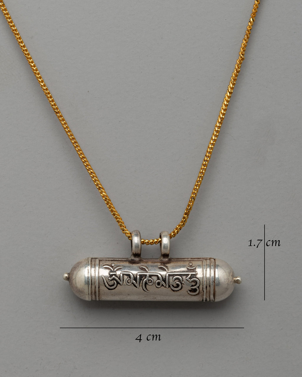 This locket with the Sacred Mantra is a significant piece of spiritual jewelry that features the OM Mani Mantra etched in 92.5% silver. The mantra "Om Mani Padme Hum" is often associated with compassion, healing, and knowledge. With a modest size of 1.7 cm in height and 4 cm in width, this locket is ideal for daily wear, serving as a constant reminder of spiritual serenity. Its lightweight of about 0.002 kg makes it perfect for wearing during meditation or throughout the day.