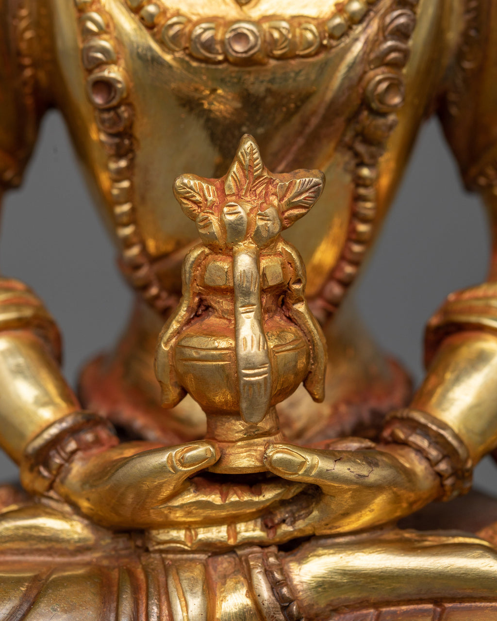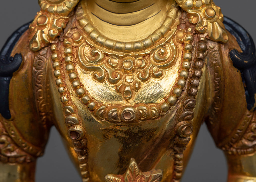 The Long-Life Buddha Amitayus Statue is a symbol of long life and spiritual well-being. This delicately carved statue stands at a modest 8.2-inch height and sits on a 5.9-inch base, weighing 1.18 kg. The use of a beautifully oxidized copper body with gorgeous 24K gold gilding, as well as thoughtful gold and acrylic paints, results in an outstanding depiction of Amitayus, the Buddha of Infinite Life.