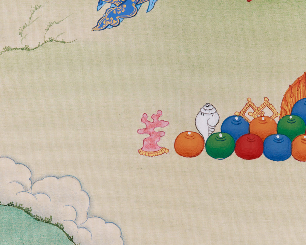 Infuse your space with the divine energy of these sacred longevity deities. Hand-painted with love and devotion, this thangka becomes a source of blessings, transforming your environment into one of peace and vitality.