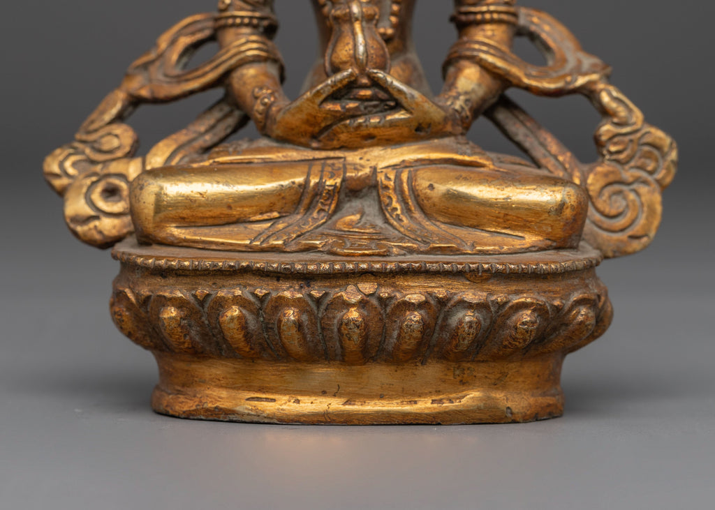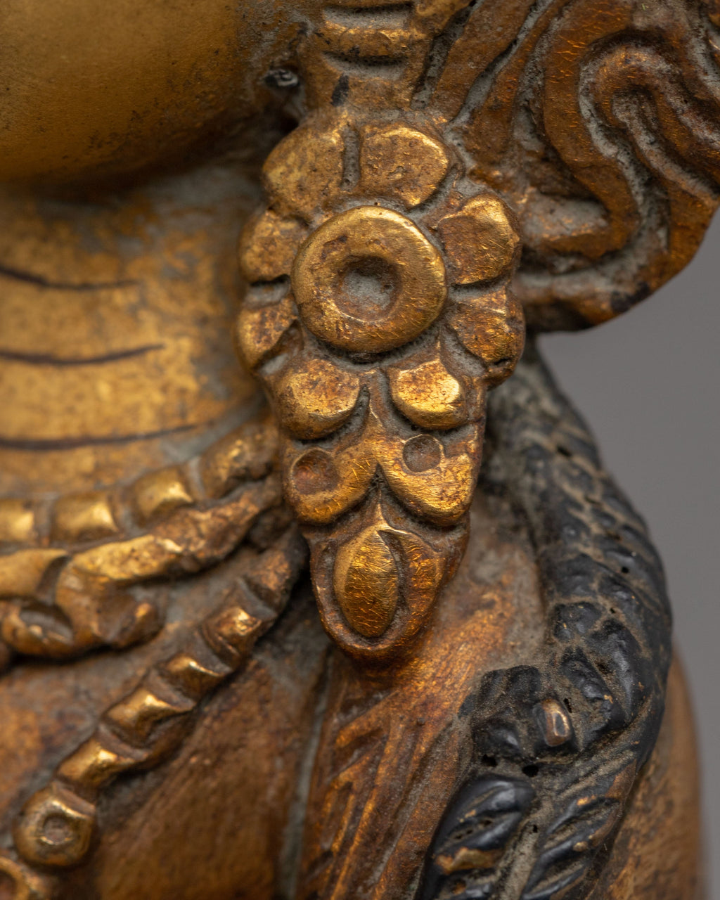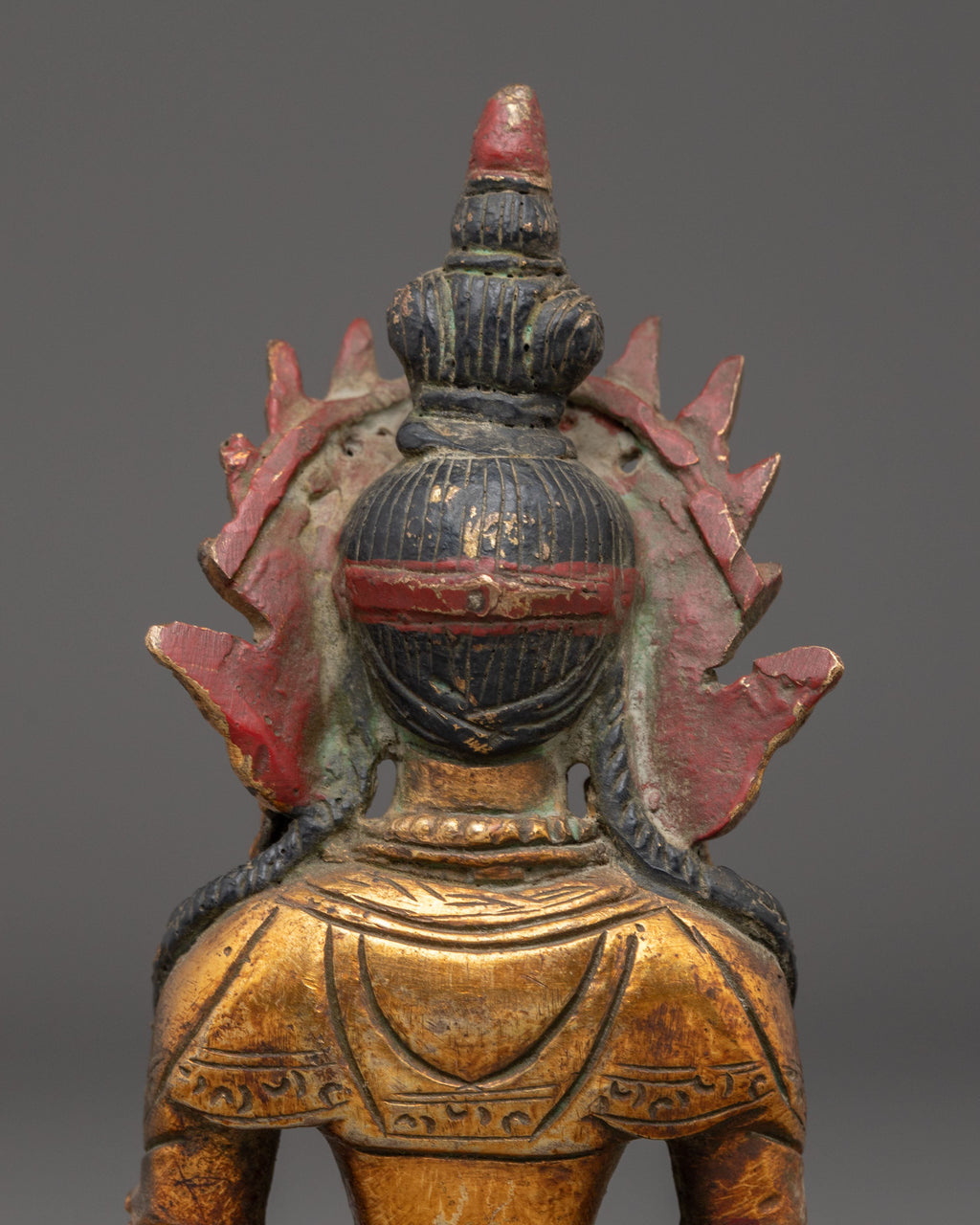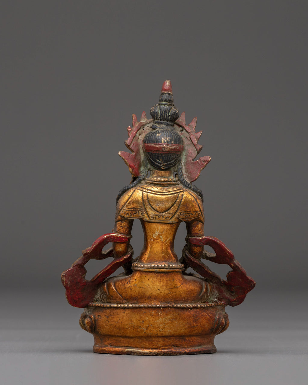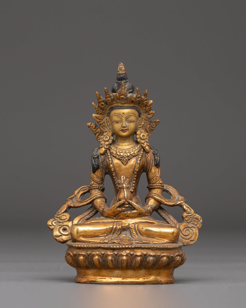 The Longevity Buddha Amitayus Statue measures 6.3 inches (16 cm) in height and has a base width of 4.5 inches (11.5 cm). It weighs 0.59 kilograms and is made from a copper body adorned with 24K gold gilding, enhanced by acrylic paintings and an antique finish. This finely crafted statue represents Amitayus, the Buddha of Infinite Life, revered for granting longevity, health, and spiritual well-being. Perfect for personal altars, meditation spaces, or sacred home décor, it serves as a powerful symbol of longevity and compassion.