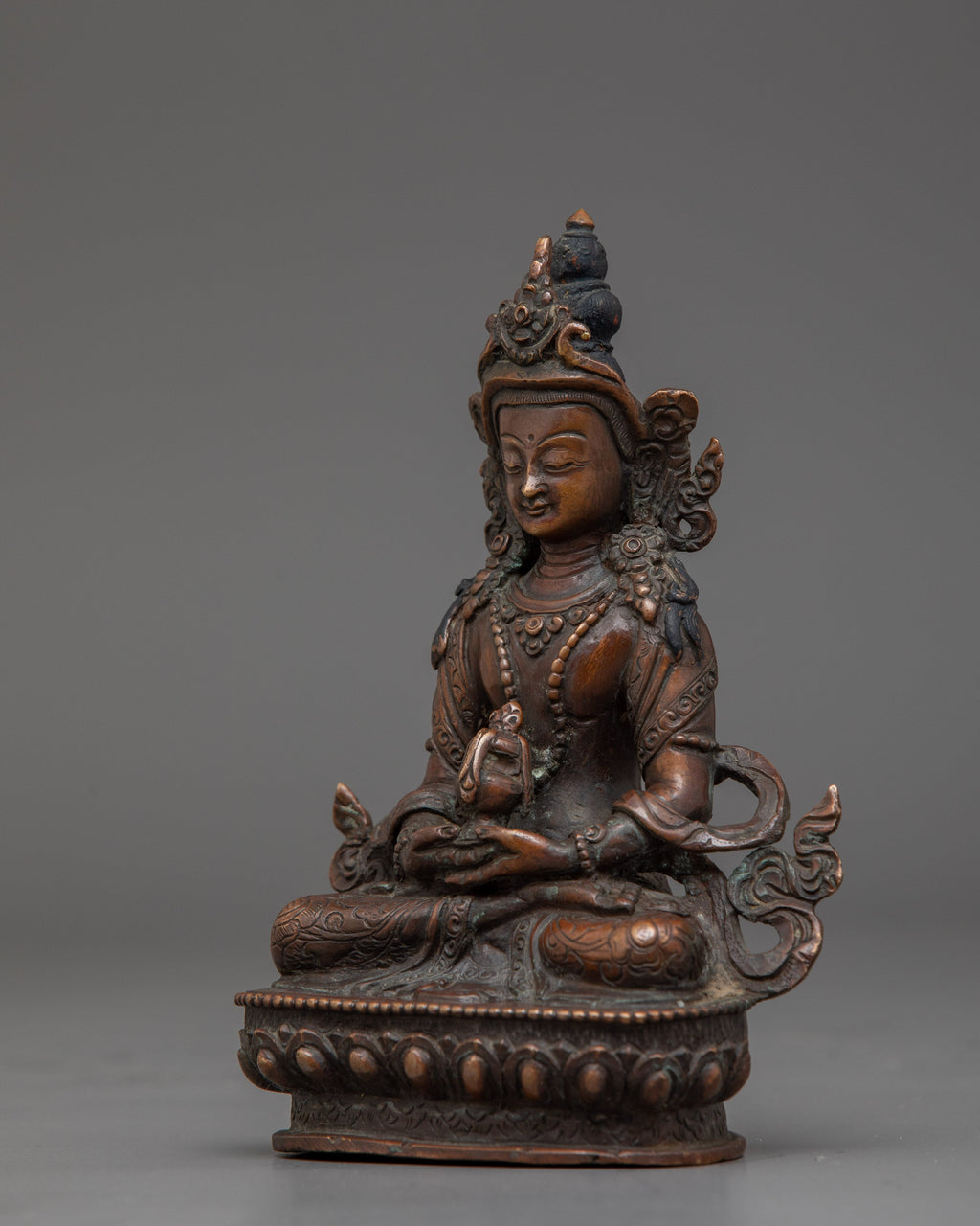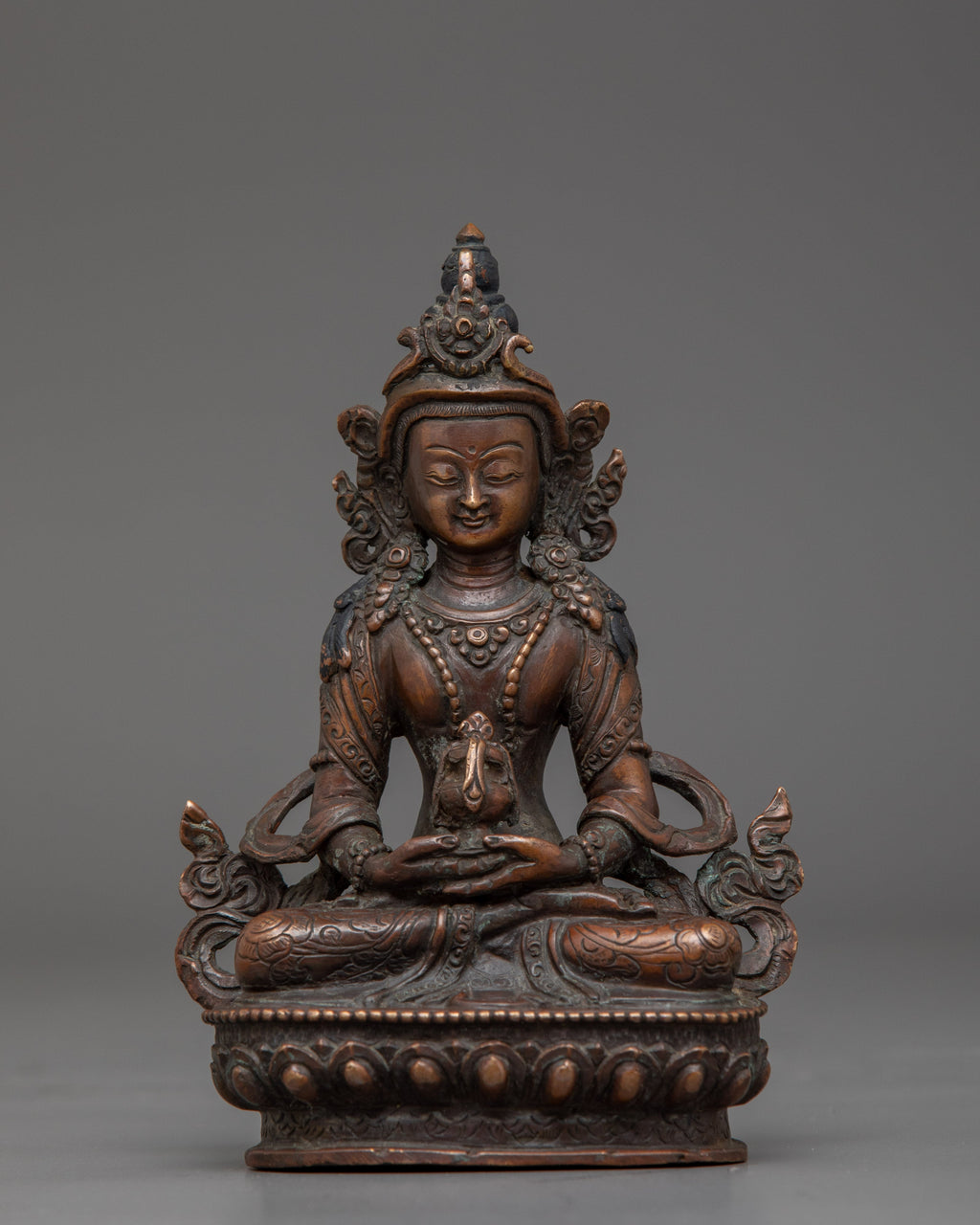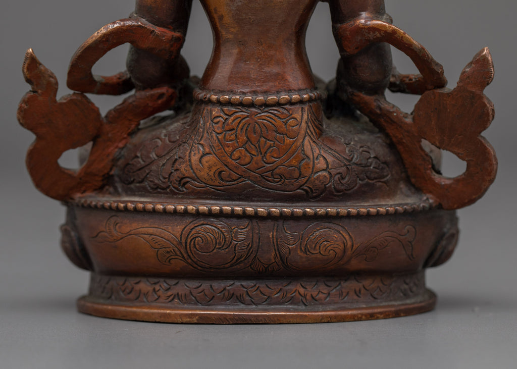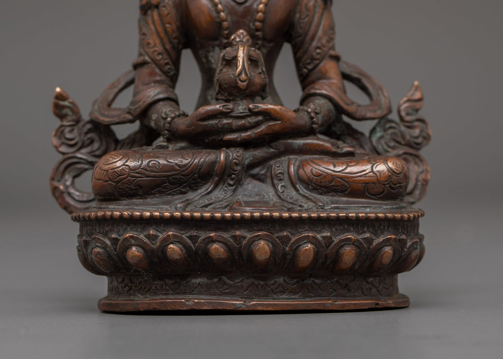 This Amitayus Longevity Deity Statue represents the blessings of longevity, health, and immortality in Tibetan Buddhism. This handcrafted statue is 5.7" (Height) x 3.9" (Base) and weighs 0.53 kg. It is made of oxidized copper and has a divine spiritual appeal. Amitayus, commonly referred to as the Buddha of Infinite Life, is said to bestow longevity and spiritual well-being to his devotees. This sculpture brings the divine blessings of health and longevity into your meditation place or shrine, encouraging peacefulness and courage in the face of life's hardships.