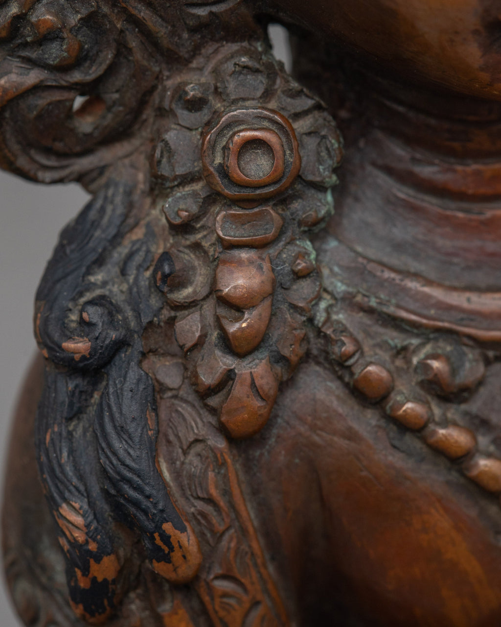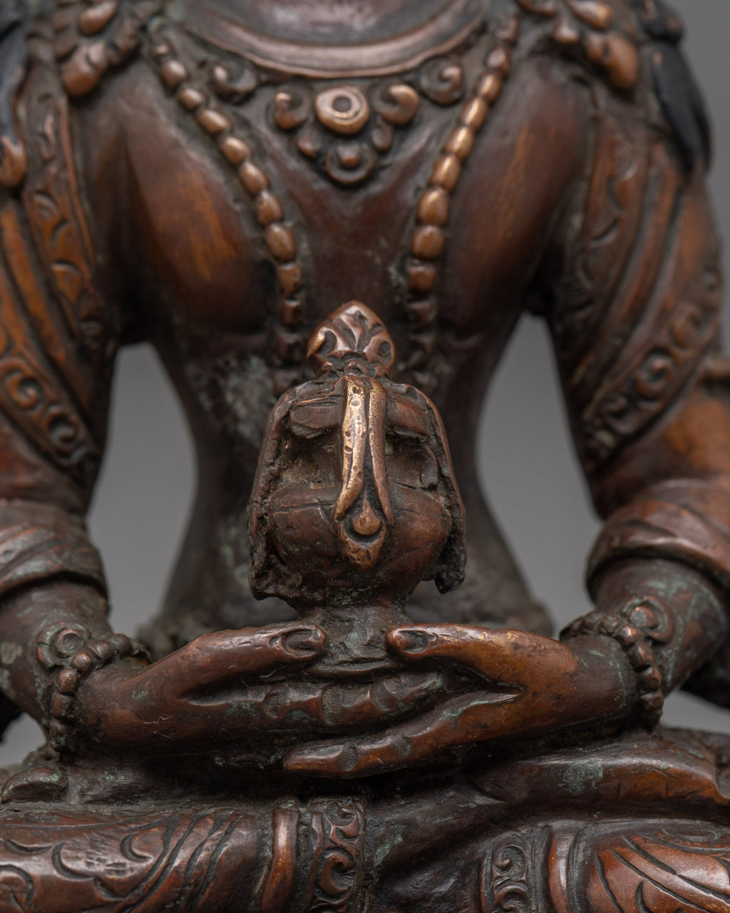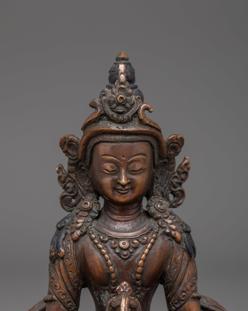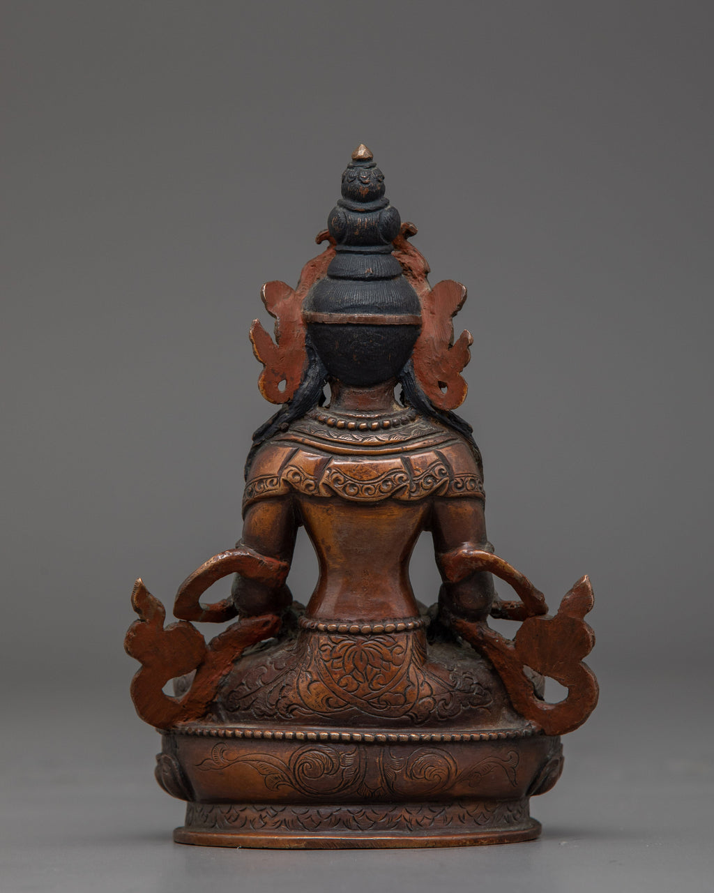 This Amitayus Longevity Deity Statue represents the blessings of longevity, health, and immortality in Tibetan Buddhism. This handcrafted statue is 5.7" (Height) x 3.9" (Base) and weighs 0.53 kg. It is made of oxidized copper and has a divine spiritual appeal. Amitayus, commonly referred to as the Buddha of Infinite Life, is said to bestow longevity and spiritual well-being to his devotees. This sculpture brings the divine blessings of health and longevity into your meditation place or shrine, encouraging peacefulness and courage in the face of life's hardships.