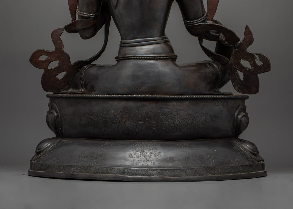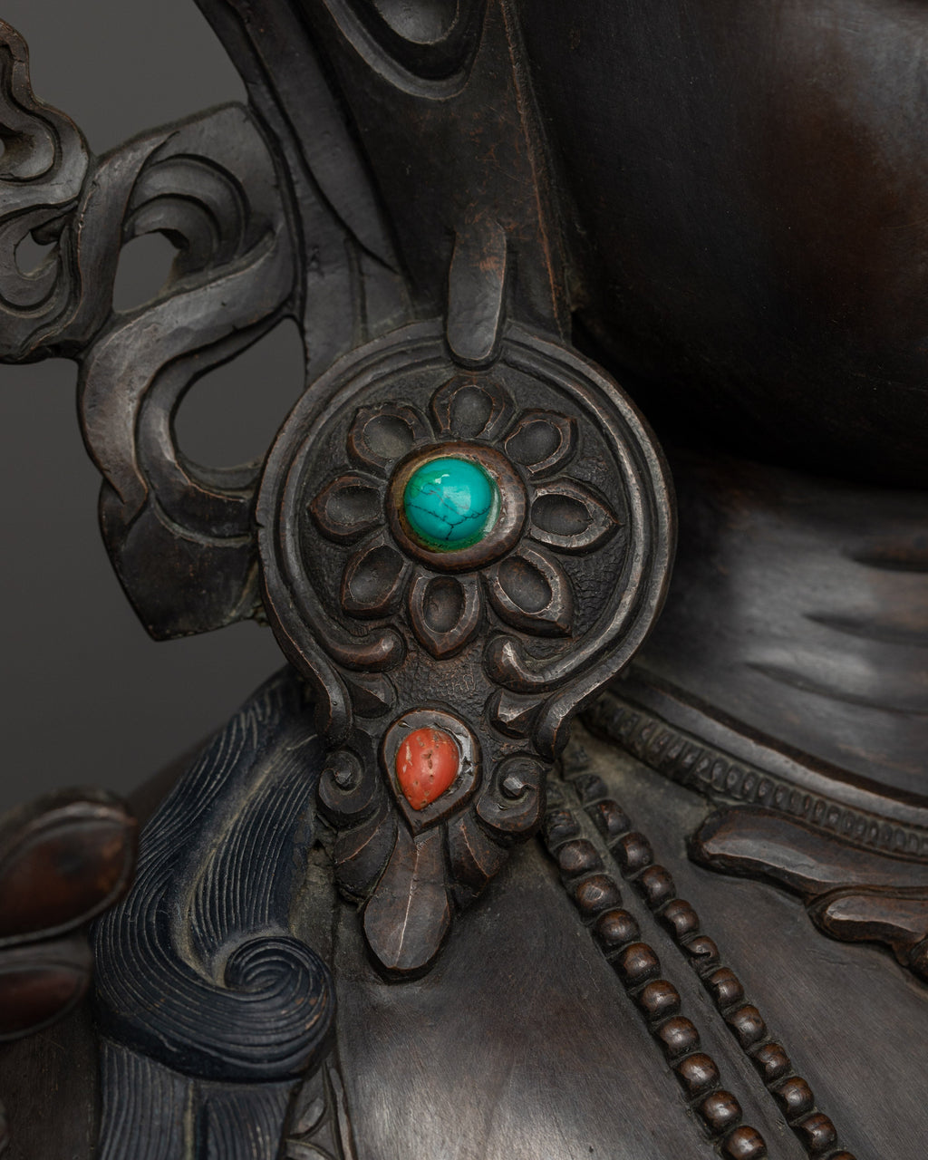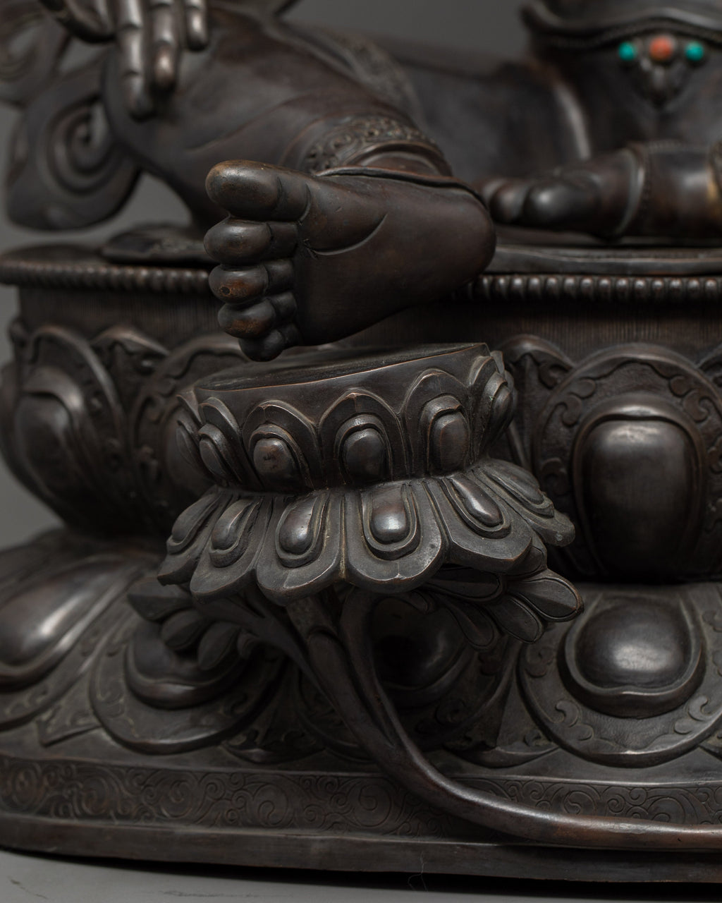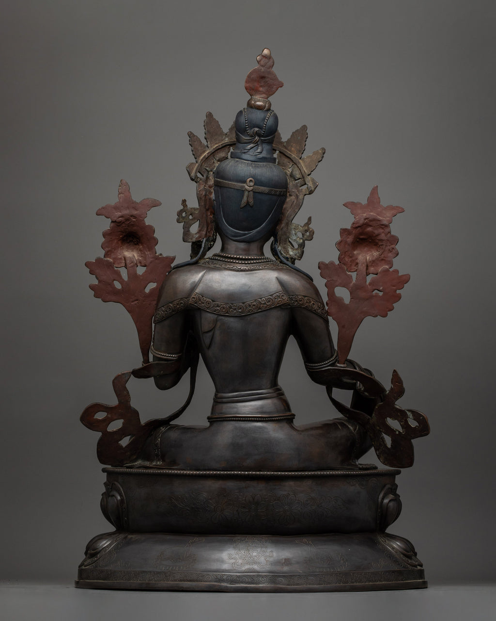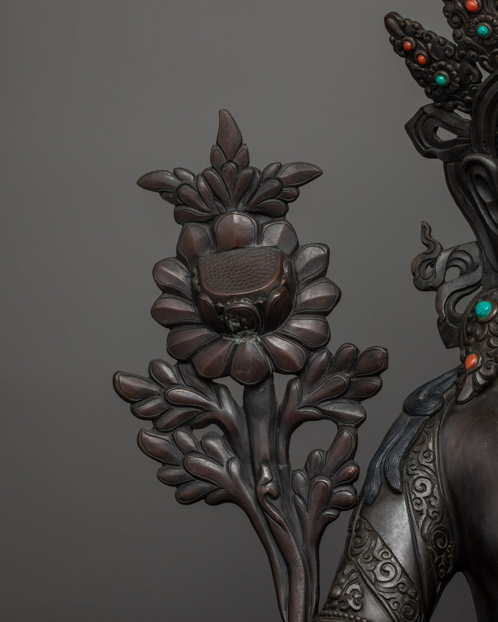 Green Tara is depicted with elegance and compassion, seated in a ready stance with one leg outstretched to respond quickly in times of need. Her right hand is in the varada mudra, indicating infinite giving, while her left hand is holding a utpala lotus, which represents purity and spiritual enlightenment. The oxidized copper body accentuates her heavenly and protecting the aura, making this statue an effective spiritual instrument for evoking Tara's blessings of protection, compassion, and direction on the path to enlightenment.
