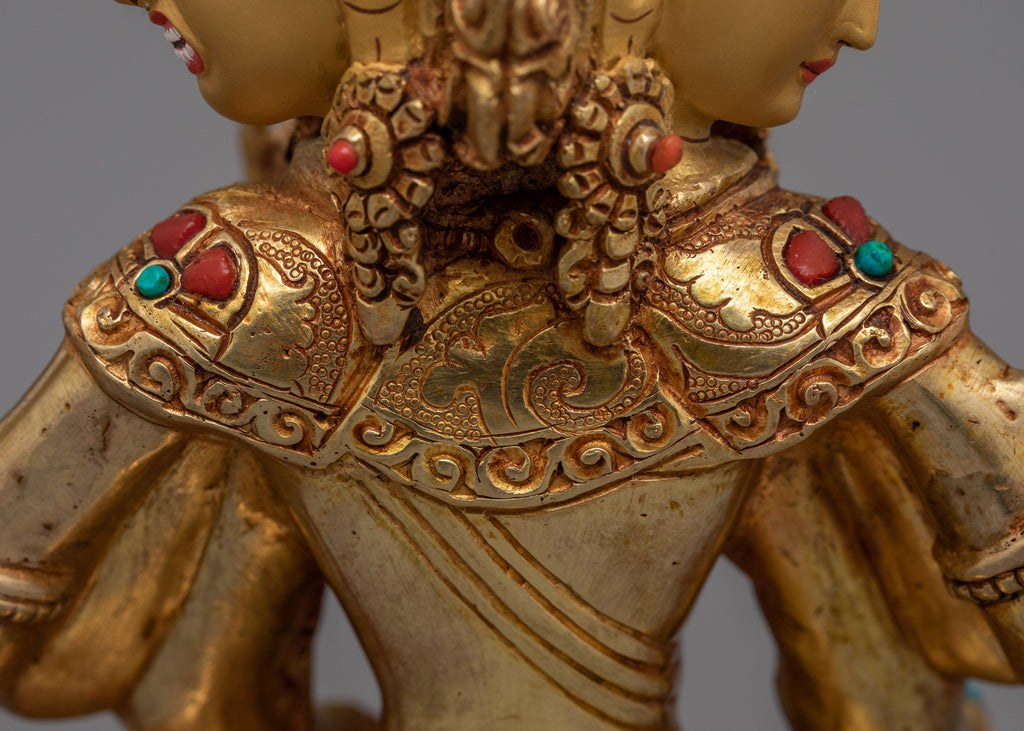 The deity is shown sitting on a moon disc lotus seat in the statue. The god is depicted with three faces- calm, semi-wrathful, and wrathful, each representing her association with purification, long life, and protection, respectively. Namgyalma, who has eight arms, carries several holy items in her hands, including a vase, lotus flower, bow and arrow, and double vajra. These items represent Namgyalma's capacity to grant blessings and divine protection. She gets her name from the Ushnisha, the Buddha's crown protuberance, which represents her closeness to enlightenment and knowledge. This statue of Namgyalma, who is said to cure, remove barriers, and prolong the lives of practitioners, is a powerful reminder of her caring and protecting presence. Ideal for a private shrine or sacred space, it promotes spiritual longevity and health.