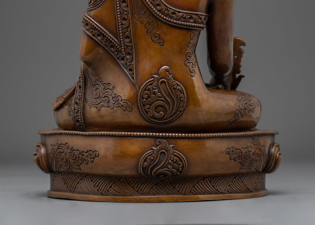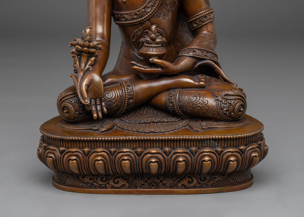 The Medicine Buddha is often shown seated upon a moon disc lotus, symbolizing purity, stability, and spiritual rise. In his left hand, he cradles an alms bowl said to hold a healing nectar capable of curing all suffering and illness. This reflects his deep power to heal both the body and the spiritual wounds that block enlightenment. His right hand grasps a myrobalan plant, a treasured herb in Buddhist and Ayurvedic healing, highlighting his role as the supreme restorer of health and balance. This statue tells a story of hope, inspiring compassion and the desire to ease the suffering of all beings.