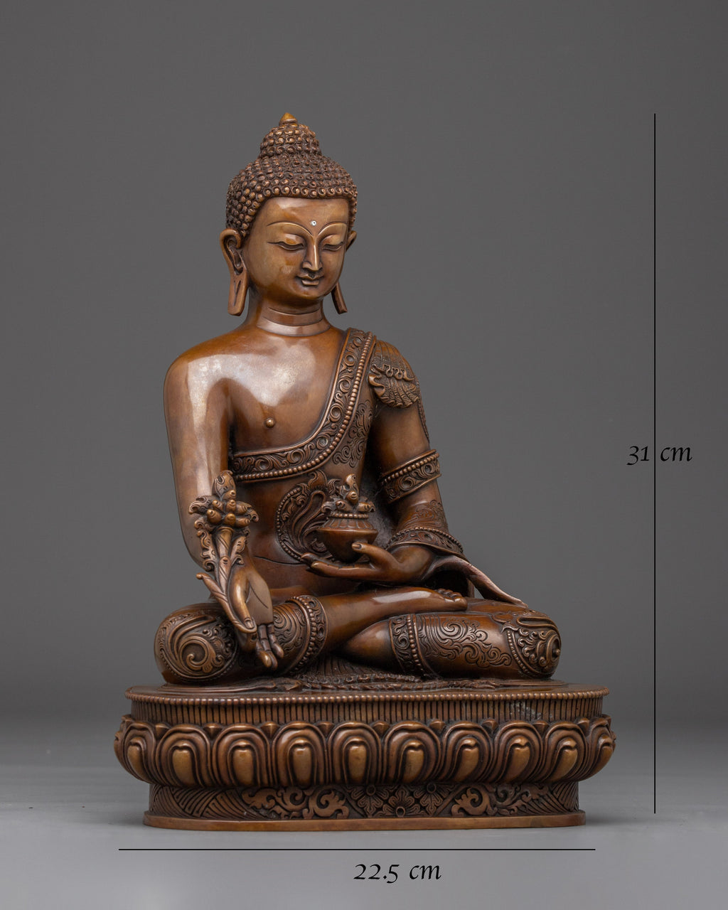 Longevity Medicine Buddha sculpture is skillfully handcrafted from an oxidized copper body, reflecting the profound healing energy and calm presence of the Buddha of Healing. Measuring 12.2”/31 cm in height and 8.9”/22.5 cm at the base, it weighs 3.92 kg. Revered as Bhaisajyaguru in Tibetan Buddhism, this statue symbolizes physical and spiritual well-being, making it an ideal piece for meditation spaces, altars, or healing practices.