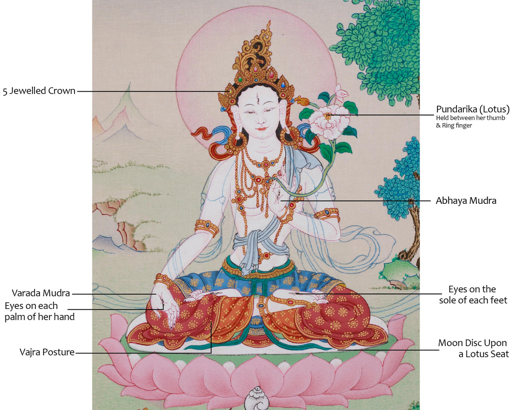 Hand-Painted Longevity Symbol White Tara Thangka | Seven-Eyed Goddess