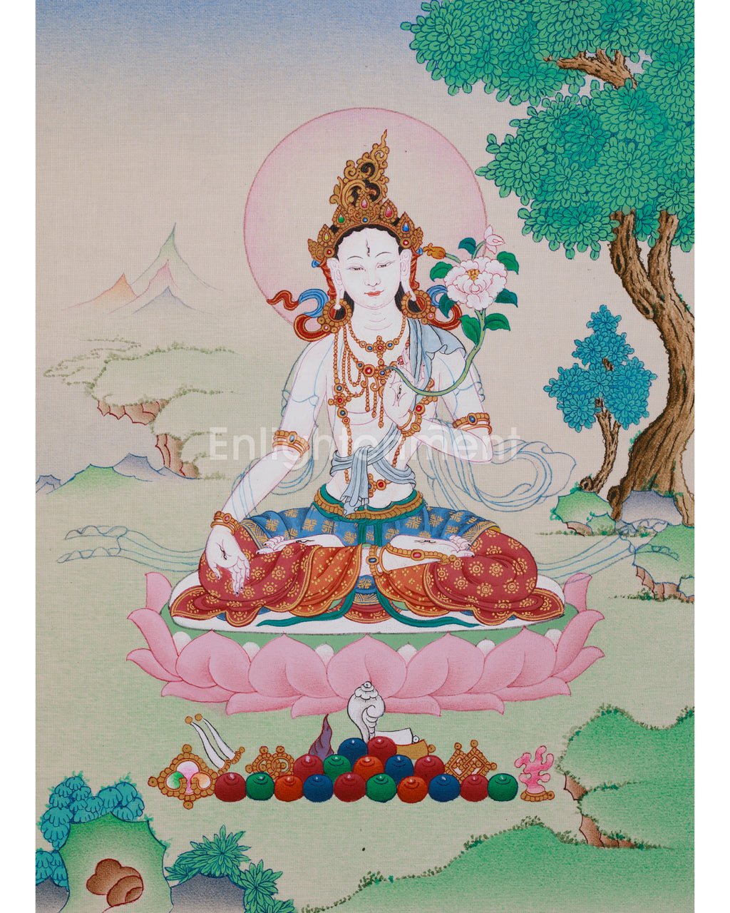 White Tara is a respected Tibetan Buddhist goddess associated with longevity, healing, and compassion. She represents Buddha's wisdom and offers protection from illness, evil, and suffering. Seen as a guardian of enlightenment and wisdom, White Tara, often serene, symbolizes compassion, peace, and long life. This thangka depicts White Tara meditating, radiating tranquility. Her five-jeweled crown highlights her divine nature. She holds a lotus, symbolizing purity and enlightenment. Her hands show fearlessness and generosity, offering protection and blessings. Her eyes on her palms and soles reflect awareness, ready to guide practitioners. Seated on a lotus with a moon disc, she emanates compassion and healing. Experience the power of the White Tara in your space, or invite her for the blessings of health and peace.